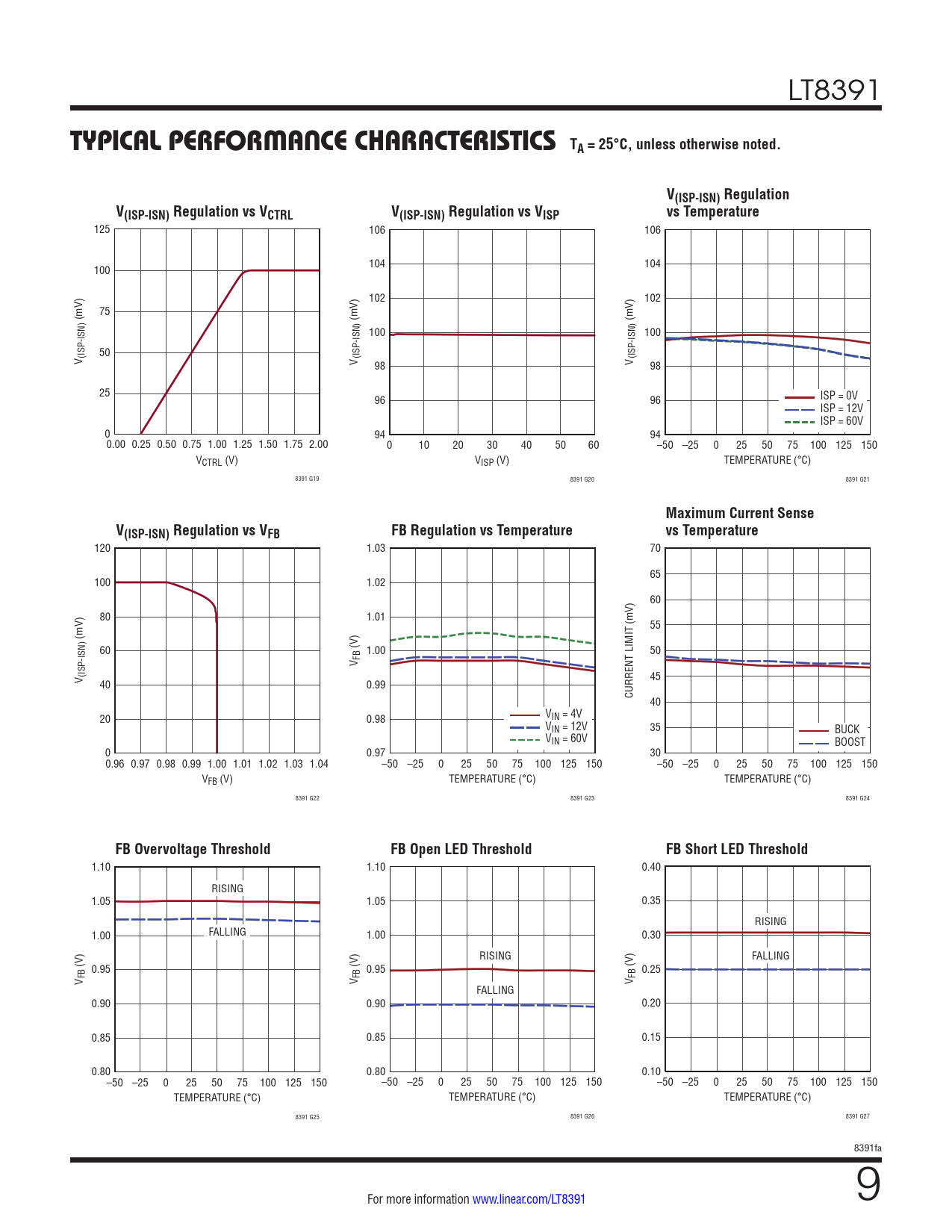 125 106 106 100 104 104 102 102 75 (mV) (mV) (mV) 100 100 50 V (ISP-ISN) V (ISP-ISN) 98 V (ISP-ISN) 98 25 96 96 ISP = 0V ISP = 12V ISP = 60V 0 94 94 0.00 0.25 0.50 0.75 1.00 1.25 1.50 1.75 2.00 0 10 20 30 40 50 60 –50 –25 0 25 50 75 100 125 150 VCTRL (V) VISP (V) TEMPERATURE (°C) 8391 G19 8391 G20 8391 G21