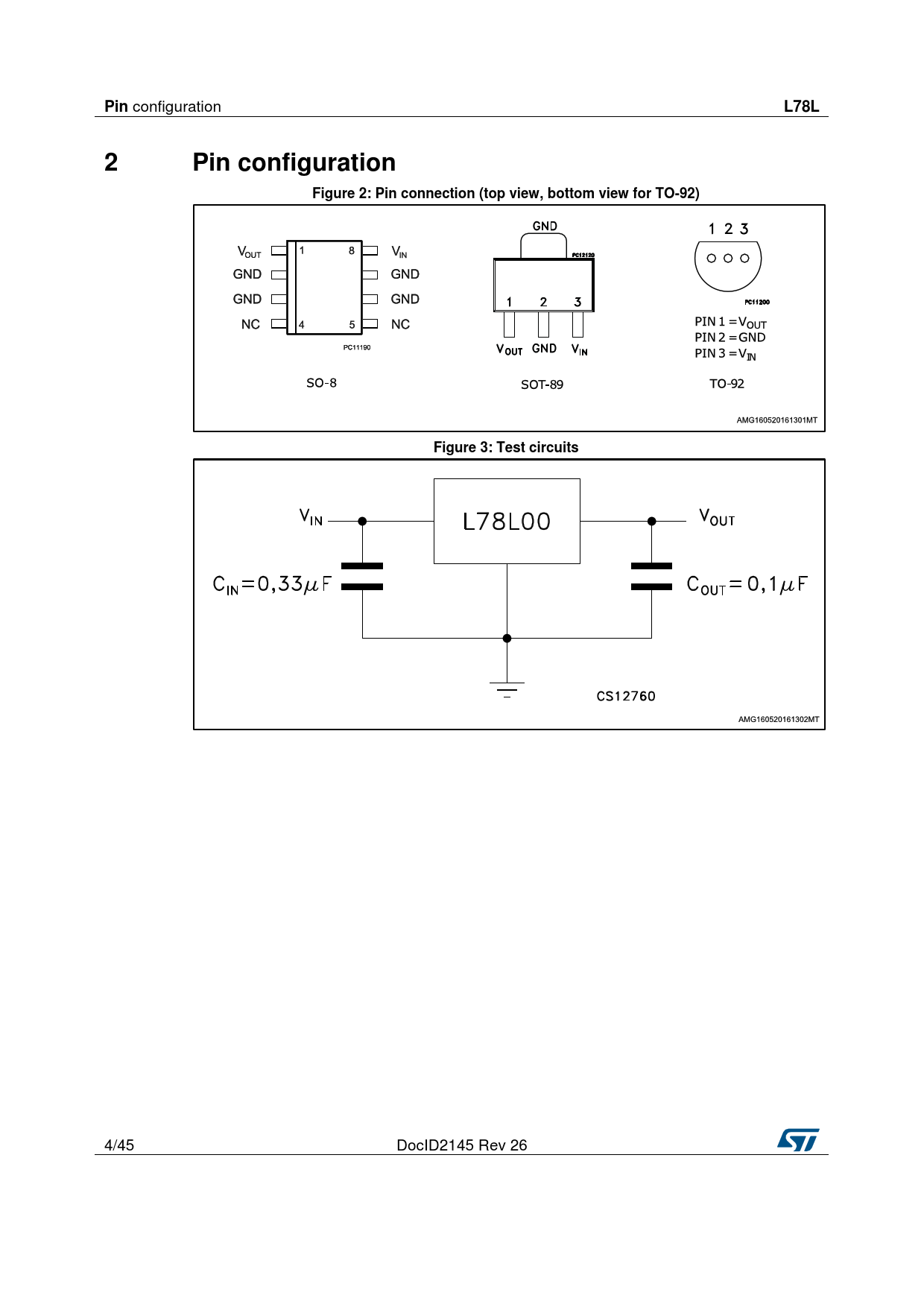 Pin. L78L. Pin configuration. Figure 2: Pin connection (top view, bottom view for TO-92). Figure 3: Test circuits