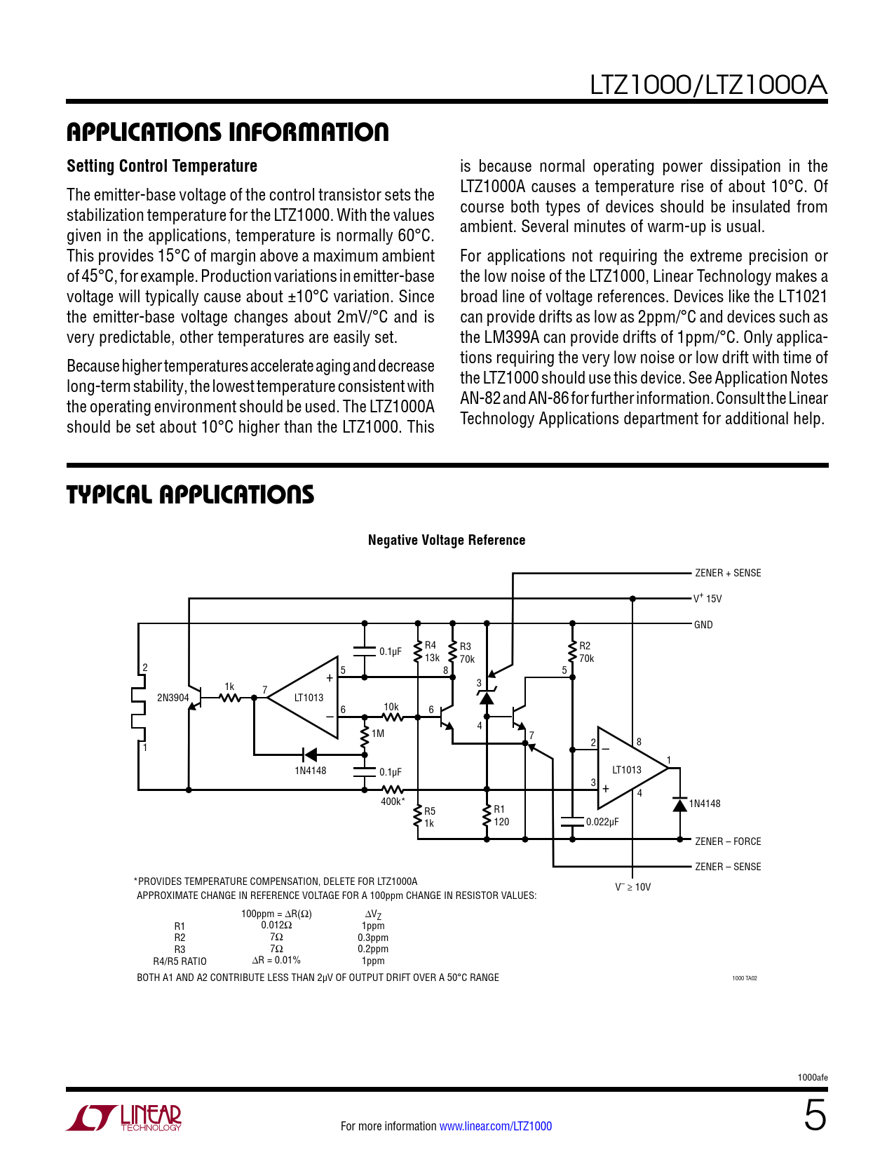 LTZ1000/LTZ1000A applicaTions inForMaTionSetting Control Temperature is because normal operating power dissipation in the The emitter-base voltage of the control transistor sets the LTZ1000A causes a temperature rise of about 10°C. Of stabilization temperature for the LTZ1000. With the values course both types of devices should be insulated from given in the applications, temperature is normally 60°C. ambient. Several minutes of warm-up is usual. This provides 15°C of margin above a maximum ambient For applications not requiring the extreme precision or of 45°C, for example. Production variations in emitter-base the low noise of the LTZ1000, Linear Technology makes a voltage will typically cause about ±10°C variation. Since broad line of voltage references. Devices like the LT1021 the emitter-base voltage changes about 2mV/°C and is can provide drifts as low as 2ppm/°C and devices such as very predictable, other temperatures are easily set. the LM399A can provide drifts of 1ppm/°C. Only applica- Because higher temperatures accelerate aging and decrease tions requiring the very low noise or low drift with time of long-term stability, the lowest temperature consistent with the LTZ1000 should use this device. See Application Notes the operating environment should be used. The LTZ1000A AN-82 and AN-86 for further information. Consult the Linear should be set about 10°C higher than the LTZ1000. This Technology Applications department for additional help. Typical applicaTionsNegative Voltage Reference ZENER + SENSE V+ 15V GND 0.1µF R4 R3 R2 13k 70k 70k 2 + 5 8 5 3 1k 7 2N3904 LT1013 10k – 6 6 4 1M 7 2 1 – 8 1 1N4148 0.1µF LT1013 3 + 4 400k* 1N4148 R5 R1 1k 120 0.022µF ZENER – FORCE ZENER – SENSE *PROVIDES TEMPERATURE COMPENSATION, DELETE FOR LTZ1000A V– ≥ 10V APPROXIMATE CHANGE IN REFERENCE VOLTAGE FOR A 100ppm CHANGE IN RESISTOR VALUES: 100ppm = ∆R(Ω) ∆VZ R1 0.012Ω 1ppm R2 7Ω 0.3ppm R3 7Ω 0.2ppm R4/R5 RATIO ∆R = 0.01% 1ppm BOTH A1 AND A2 CONTRIBUTE LESS THAN 2µV OF OUTPUT DRIFT OVER A 50°C RANGE 1000 TA02 1000afe For more information www.linear.com/LTZ1000 5 Document Outline Features Applications Description Typical Application Absolute Maximum Ratings Pin Configuration Order Information Electrical Characteristics Typical Performance Characteristics Pin Functions Block Diagram Applications Information Typical Applications Revision History Package Description Related Parts