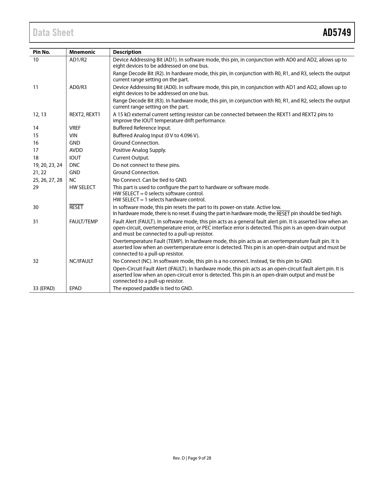 10 AD1/R2 Device Addressing Bit (AD1). In software mode, this pin, in conjunction with AD0 and AD2, allows up to eight devices to be addressed on one bus. Range Decode Bit (R2). In hardware mode, this pin, in conjunction with R0, R1, and R3, selects the output current range setting on the part. 11 AD0/R3 Device Addressing Bit (AD0). In software mode, this pin, in conjunction with AD1 and AD2, allows up to eight devices to be addressed on one bus. Range Decode Bit (R3). In hardware mode, this pin, in conjunction with R0, R1, and R2, selects the output current range setting on the part. 12, 13 REXT2, REXT1 A 15 kΩ external current setting resistor can be connected between the REXT1 and REXT2 pins to improve the IOUT temperature drift performance. 14 VREF Buffered Reference Input. 15 VIN Buffered Analog Input (0 V to 4.096 V). 16 GND Ground Connection. 17 AVDD Positive Analog Supply. 18 IOUT Current Output. 19, 20, 23, 24 DNC Do not connect to these pins. 21, 22 GND Ground Connection. 25, 26, 27, 28 NC No Connect. Can be tied to GND. 29 HW SELECT This part is used to configure the part to hardware or software mode. HW SELECT = 0 selects software control. HW SELECT = 1 selects hardware control. 30 RESET In software mode, this pin resets the part to its power-on state. Active low. In hardware mode, there is no reset. If using the part in hardware mode, the RESET pin should be tied high. 31 FAULT/TEMP Fault Alert (FAULT). In software mode, this pin acts as a general fault alert pin. It is asserted low when an open-circuit, overtemperature error, or PEC interface error is detected. This pin is an open-drain output and must be connected to a pull-up resistor. Overtemperature Fault (TEMP). In hardware mode, this pin acts as an overtemperature fault pin. It is asserted low when an overtemperature error is detected. This pin is an open-drain output and must be connected to a pull-up resistor. 32 NC/IFAULT No Connect (NC). In software mode, this pin is a no connect. Instead, tie this pin to GND. Open-Circuit Fault Alert (IFAULT). In hardware mode, this pin acts as an open-circuit fault alert pin. It is asserted low when an open-circuit error is detected. This pin is an open-drain output and must be connected to a pull-up resistor. 33 (EPAD) EPAD The exposed paddle is tied to GND. Rev. D | Page 9 of 28 Document Outline FEATURES APPLICATIONS FUNCTIONAL BLOCK DIAGRAM GENERAL DESCRIPTION REVISION HISTORY TIMING CHARACTERISTICS Timing Diagrams ESD CAUTION SOFTWARE MODE CURRENT OUTPUT ARCHITECTURE DRIVING INDUCTIVE LOADS POWER-ON STATE OF THE AD5749 DEFAULT REGISTERS AT POWER-ON RESET FUNCTION OUTEN SOFTWARE CONTROL Input Shift Register Status Bit Read Operation HARDWARE CONTROL TRANSFER FUNCTION OUTPUT FAULT ALERT—SOFTWARE MODE OUTPUT FAULT ALERT—HARDWARE MODE ASYNCHRONOUS CLEAR (CLEAR) EXTERNAL CURRENT SETTING RESISTOR PROGRAMMABLE OVERRANGE MODES PACKET ERROR CHECKING TRANSIENT VOLTAGE PROTECTION THERMAL CONSIDERATIONS LAYOUT GUIDELINES GALVANICALLY ISOLATED INTERFACE MICROPROCESSOR INTERFACING ORDERING GUIDE