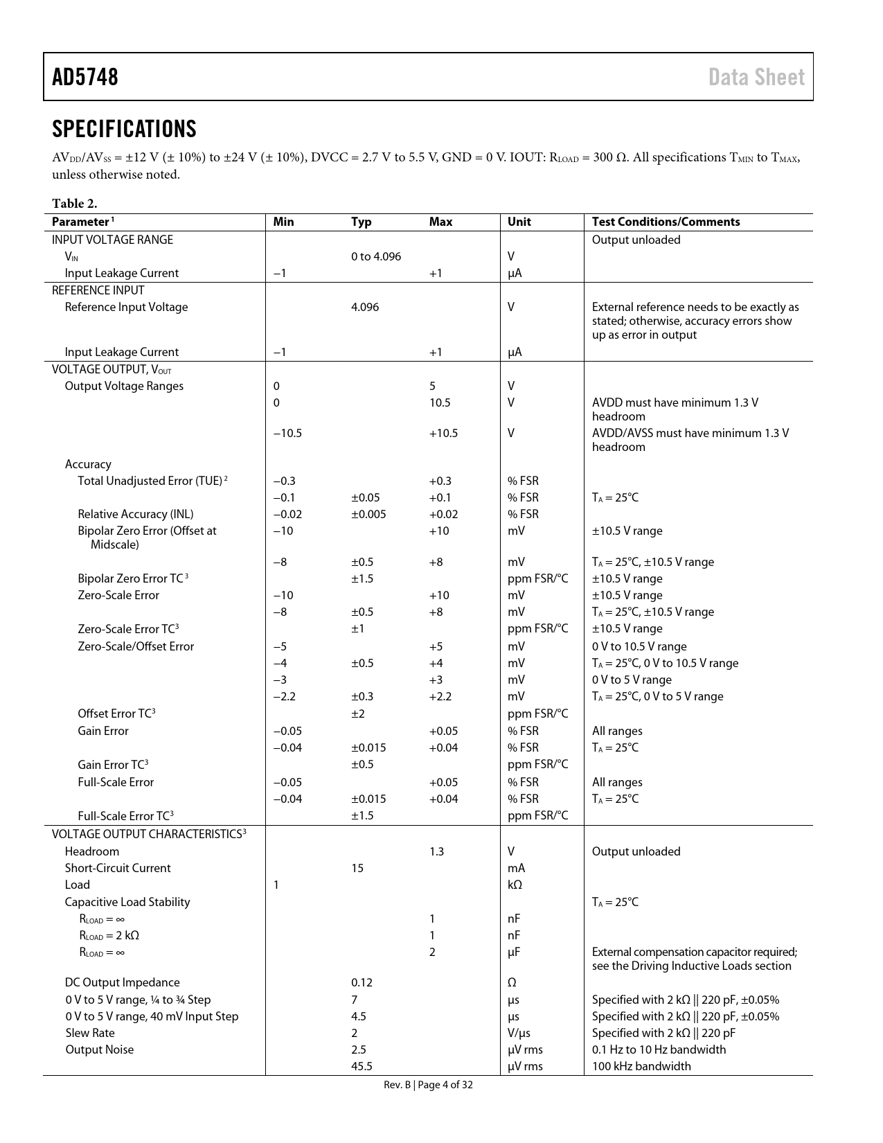 Seiten / Seite32 / 4 — AD5748. Data Sheet. SPECIFICATIONS. Table 2. Parameter 1. Min. Typ. Max. …