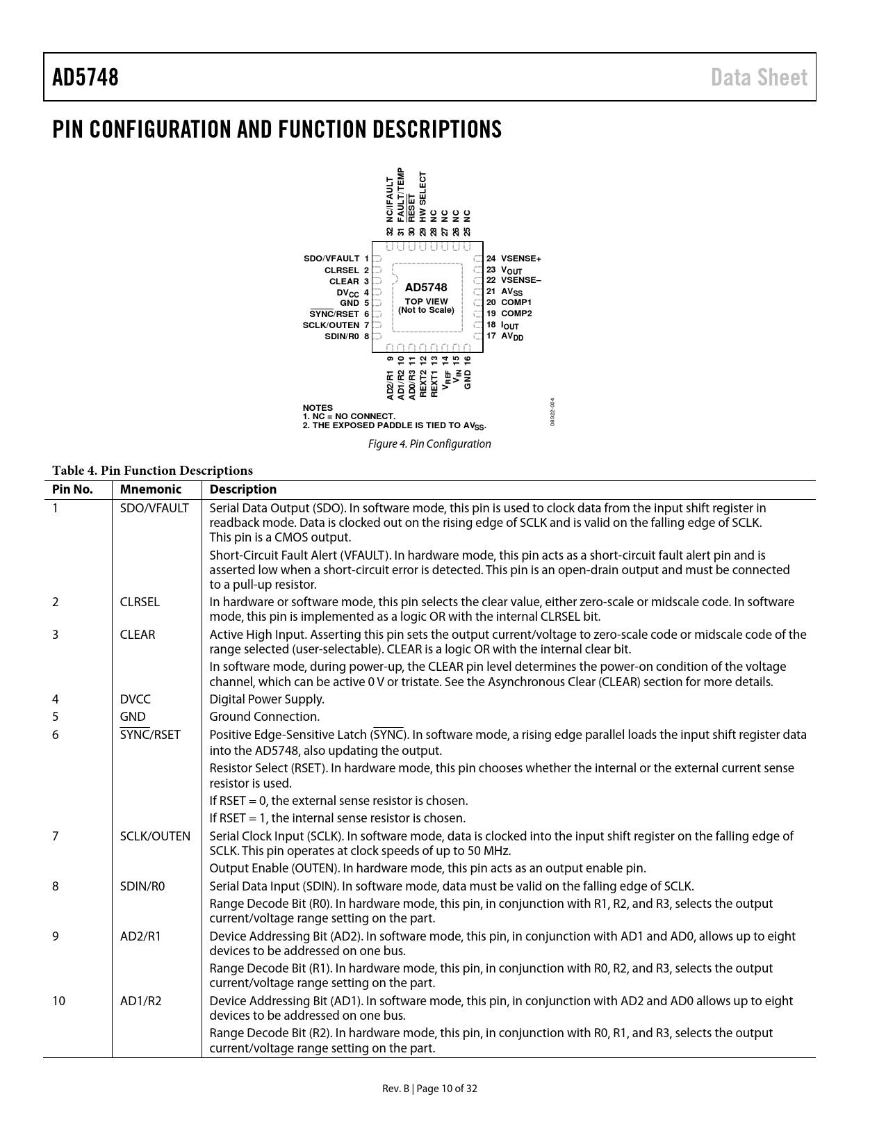 AD5748. Data Sheet. PIN CONFIGURATION AND FUNCTION DESCRIPTIONS. SDO/VFAULT 1. 24 VSENSE+. CLRSEL 2. 23 VOUT. CLEAR 3. 22 VSENSE–. 21 AV