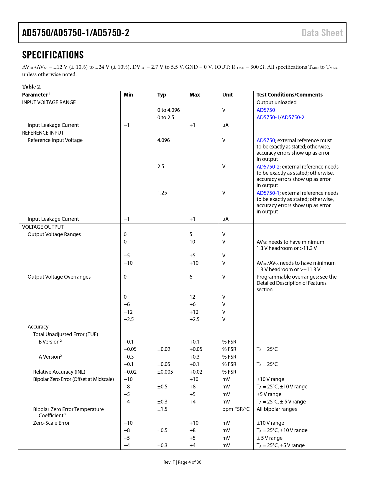 link to page 29 link to page 8 link to page 7 link to page 7 link to page 7 AD5750/AD5750-1/AD5750-2Data SheetSPECIFICATIONS AVDD/AVSS = ±12 V (± 10%) to ±24 V (± 10%), DVCC = 2.7 V to 5.5 V, GND = 0 V. IOUT: RLOAD = 300 Ω. All specifications TMIN to TMAX, unless otherwise noted. Table 2. Parameter1MinTypMaxUnitTest Conditions/Comments INPUT VOLTAGE RANGE Output unloaded 0 to 4.096 V AD5750 0 to 2.5 AD5750-1/AD5750-2 Input Leakage Current −1 +1 µA REFERENCE INPUT Reference Input Voltage 4.096 V AD5750; external reference must to be exactly as stated; otherwise, accuracy errors show up as error in output 2.5 V AD5750-2; external reference needs to be exactly as stated; otherwise, accuracy errors show up as error in output 1.25 V AD5750-1; external reference needs to be exactly as stated; otherwise, accuracy errors show up as error in output Input Leakage Current −1 +1 µA VOLTAGE OUTPUT Output Voltage Ranges 0 5 V 0 10 V AVDD needs to have minimum 1.3 V headroom or >11.3 V −5 +5 V −10 +10 V AVDD/AVSS needs to have minimum 1.3 V headroom or >±11.3 V Output Voltage Overranges 0 6 V Programmable overranges; see the Detailed Description of Features section 0 12 V −6 +6 V −12 +12 V −2.5 +2.5 V Accuracy Total Unadjusted Error (TUE) B Version2 −0.1 +0.1 % FSR −0.05 ±0.02 +0.05 % FSR TA = 25°C A Version2 −0.3 +0.3 % FSR −0.1 ±0.05 +0.1 % FSR TA = 25°C Relative Accuracy (INL) −0.02 ±0.005 +0.02 % FSR Bipolar Zero Error (Offset at Midscale) −10 +10 mV ±10 V range −8 ±0.5 +8 mV TA = 25°C, ±10 V range −5 +5 mV ±5 V range −4 ±0.3 +4 mV TA = 25°C, ± 5 V range Bipolar Zero Error Temperature ±1.5 ppm FSR/°C All bipolar ranges Coefficient3 Zero-Scale Error −10 +10 mV ±10 V range −8 ±0.5 +8 mV TA = 25°C, ±10 V range −5 +5 mV ± 5 V range −4 ±0.3 +4 mV TA = 25°C, ±5 V range Rev. F | Page 4 of 36 Document Outline Features Applications General Description Table of Contents Revision History Functional Block Diagram Specifications Timing Characteristics Timing Diagrams Absolute Maximum Ratings ESD Caution Pin Configuration and Function Descriptions Typical Performance Characteristics Voltage Output Current Output Terminology Theory of Operation Software Mode Current Output Architecture Driving Inductive Loads Voltage Output Amplifier Driving Large Capacitive Loads Power-On State of AD5750/AD5750-1/AD5750-2 Default Registers at Power-On Reset Function OUTEN Software Control Input Shift Register Status Bit Read Operation Hardware Control Transfer Function Detailed Description of Features Output Fault Alert—Software Mode Output Fault Alert—Hardware Mode Voltage Output Short-Circuit Protection Asynchronous Clear (CLEAR) External Current Setting Resistor Programmable Overrange Modes Packet Error Checking Applications Information Transient Voltage Protection Thermal Considerations Layout Guidelines Galvanically Isolated Interface Microprocessor Interfacing Outline Dimensions Ordering Guide
