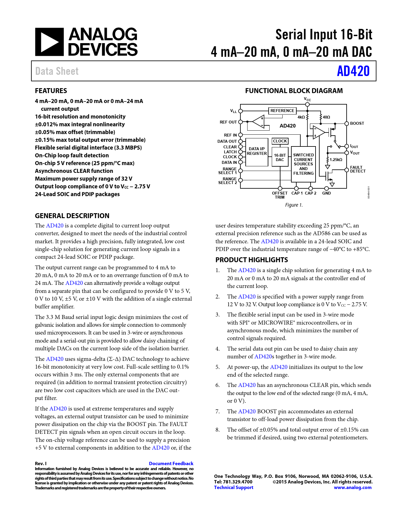 Serial Input 16-Bit. 4 mA–20 mA, 0 mA–20 mA DAC. Data Sheet. AD420. FEATURES. FUNCTIONAL BLOCK DIAGRAM