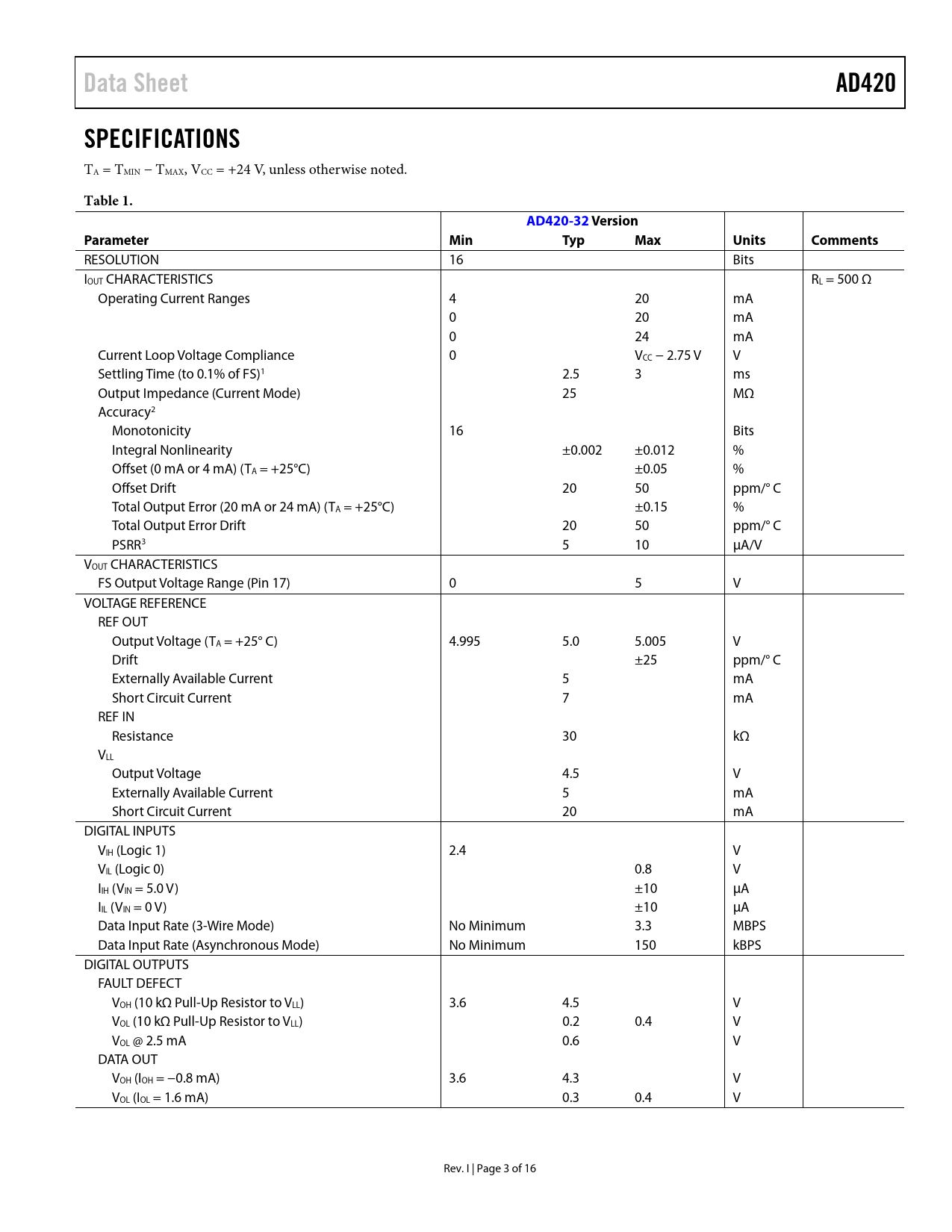 Data Sheet. AD420. SPECIFICATIONS. Table 1. AD420-32 V. ersion. Parameter. Min. Typ. Max. Units. Comments