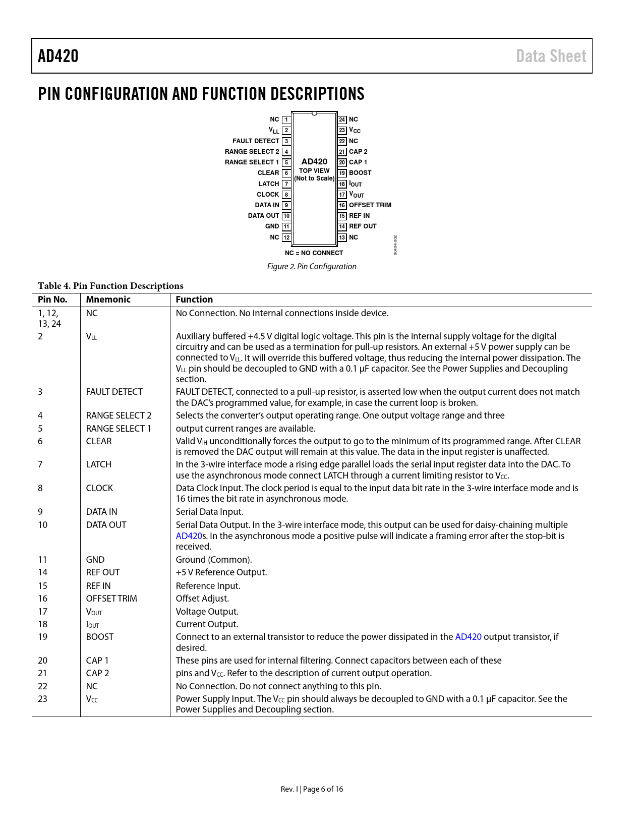 link to page 14 link to page 14 AD420Data SheetPIN CONFIGURATION AND FUNCTION DESCRIPTIONSNC124 NCVLL 223 VCCFAULT DETECT322 NCRANGE SELECT 2421 CAP 2RANGE SELECT 15AD42020 CAP 1CLEAR6TOP VIEW19 BOOST(Not to Scale)LATCH718 IOUTCLOCK817 VOUTDATA IN 916 OFFSET TRIMDATA OUT 1015 REF INGND 1114 REF OUTNC 1213 NC 002 NC = NO CONNECT 00494- Figure 2. Pin Configuration Table 4. Pin Function Descriptions Pin No.MnemonicFunction 1, 12, NC No Connection. No internal connections inside device. 13, 24 2 VLL Auxiliary buffered +4.5 V digital logic voltage. This pin is the internal supply voltage for the digital circuitry and can be used as a termination for pull-up resistors. An external +5 V power supply can be connected to VLL. It will override this buffered voltage, thus reducing the internal power dissipation. The VLL pin should be decoupled to GND with a 0.1 µF capacitor. See the Power Supplies and Decoupling section. 3 FAULT DETECT FAULT DETECT, connected to a pull-up resistor, is asserted low when the output current does not match the DAC’s programmed value, for example, in case the current loop is broken. 4 RANGE SELECT 2 Selects the converter’s output operating range. One output voltage range and three 5 RANGE SELECT 1 output current ranges are available. 6 CLEAR Valid VIH unconditionally forces the output to go to the minimum of its programmed range. After CLEAR is removed the DAC output will remain at this value. The data in the input register is unaffected. 7 LATCH In the 3-wire interface mode a rising edge parallel loads the serial input register data into the DAC. To use the asynchronous mode connect LATCH through a current limiting resistor to VCC. 8 CLOCK Data Clock Input. The clock period is equal to the input data bit rate in the 3-wire interface mode and is 16 times the bit rate in asynchronous mode. 9 DATA IN Serial Data Input. 10 DATA OUT Serial Data Output. In the 3-wire interface mode, this output can be used for daisy-chaining multiple AD420s. In the asynchronous mode a positive pulse will indicate a framing error after the stop-bit is received. 11 GND Ground (Common). 14 REF OUT +5 V Reference Output. 15 REF IN Reference Input. 16 OFFSET TRIM Offset Adjust. 17 VOUT Voltage Output. 18 IOUT Current Output. 19 BOOST Connect to an external transistor to reduce the power dissipated in the AD420 output transistor, if desired. 20 CAP 1 These pins are used for internal filtering. Connect capacitors between each of these 21 CAP 2 pins and VCC. Refer to the description of current output operation. 22 NC No Connection. Do not connect anything to this pin. 23 VCC Power Supply Input. The VCC pin should always be decoupled to GND with a 0.1 µF capacitor. See the Power Supplies and Decoupling section. Rev. I | Page 6 of 16 Document Outline FEATURES FUNCTIONAL BLOCK DIAGRAM GENERAL DESCRIPTION PRODUCT HIGHLIGHTS TABLE OF CONTENTS REVISION HISTORY SPECIFICATIONS ABSOLUTE MAXIMUM RATINGS ESD CAUTION PIN CONFIGURATION AND FUNCTION DESCRIPTIONS TIMING REQUIREMENTS THREE-WIRE INTERFACE THREE-WIRE INTERFACE FAST EDGES ON DIGITAL INPUT ASYNCHRONOUS INTERFACE TERMINOLOGY THEORY OF OPERATION APPLICATIONS INFORMATION CURRENT OUTPUT DRIVING INDUCTIVE LOADS VOLTAGE-MODE OUTPUT OPTIONAL SPAN AND ZERO TRIM THREE-WIRE INTERFACE USING MULTIPLE DACS WITH FAULT DETECT ASYNCHRONOUS INTERFACE USING OPTOCOUPLERS MICROPROCESSOR INTERFACE AD420-TO-MC68HC11 (SPI BUS) INTERFACE AD420 TO MICROWIRE INTERFACE EXTERNAL BOOST FUNCTION AD420 PROTECTION TRANSIENT VOLTAGE PROTECTION BOARD LAYOUT AND GROUNDING POWER SUPPLIES AND DECOUPLING OUTLINE DIMENSIONS ORDERING GUIDE