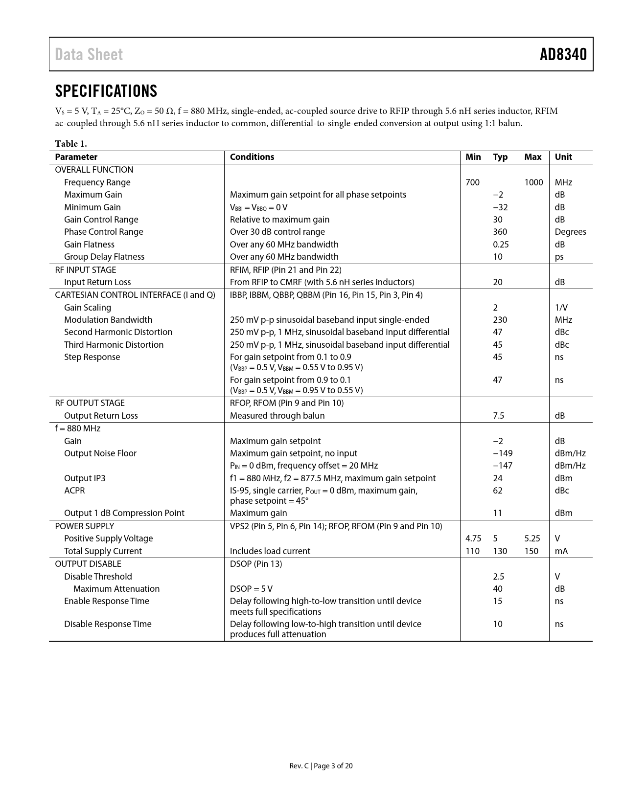 OVERALL FUNCTION Frequency Range 700 1000 MHz Maximum Gain Maximum gain setpoint for all phase setpoints −2 dB Minimum Gain VBBI = VBBQ = 0 V −32 dB Gain Control Range Relative to maximum gain 30 dB Phase Control Range Over 30 dB control range 360 Degrees Gain Flatness Over any 60 MHz bandwidth 0.25 dB Group Delay Flatness Over any 60 MHz bandwidth 10 ps RF INPUT STAGE RFIM, RFIP (Pin 21 and Pin 22) Input Return Loss From RFIP to CMRF (with 5.6 nH series inductors) 20 dB CARTESIAN CONTROL INTERFACE (I and Q) IBBP, IBBM, QBBP, QBBM (Pin 16, Pin 15, Pin 3, Pin 4) Gain Scaling 2 1/V Modulation Bandwidth 250 mV p-p sinusoidal baseband input single-ended 230 MHz Second Harmonic Distortion 250 mV p-p, 1 MHz, sinusoidal baseband input differential 47 dBc Third Harmonic Distortion 250 mV p-p, 1 MHz, sinusoidal baseband input differential 45 dBc Step Response For gain setpoint from 0.1 to 0.9 45 ns (VBBP = 0.5 V, VBBM = 0.55 V to 0.95 V) For gain setpoint from 0.9 to 0.1 47 ns (VBBP = 0.5 V, VBBM = 0.95 V to 0.55 V) RF OUTPUT STAGE RFOP, RFOM (Pin 9 and Pin 10) Output Return Loss Measured through balun 7.5 dB f = 880 MHz Gain Maximum gain setpoint −2 dB Output Noise Floor Maximum gain setpoint, no input −149 dBm/Hz PIN = 0 dBm, frequency offset = 20 MHz −147 dBm/Hz Output IP3 f1 = 880 MHz, f2 = 877.5 MHz, maximum gain setpoint 24 dBm ACPR IS-95, single carrier, POUT = 0 dBm, maximum gain, 62 dBc phase setpoint = 45° Output 1 dB Compression Point Maximum gain 11 dBm POWER SUPPLY VPS2 (Pin 5, Pin 6, Pin 14); RFOP, RFOM (Pin 9 and Pin 10) Positive Supply Voltage 4.75 5 5.25 V Total Supply Current Includes load current 110 130 150 mA OUTPUT DISABLE DSOP (Pin 13) Disable Threshold 2.5 V Maximum Attenuation DSOP = 5 V 40 dB Enable Response Time Delay following high-to-low transition until device 15 ns meets full specifications Disable Response Time Delay following low-to-high transition until device 10 ns produces full attenuation Rev. C | Page 3 of 20 Document Outline Features Applications Functional Block Diagram General Description Table of Contents Revision History Specifications Absolute Maximum Ratings ESD Caution Pin Configuration and Function Descriptions Typical Performance Characteristics Theory of Operation RF Quadrature Generator I-Q Attenuators and Baseband Amplifiers Output Amplifier Noise and Distortion Gain and Phase Accuracy RF Frequency Range Applications Information Using the AD8340 RF Input and Matching RF Output and Matching Driving the I-Q Baseband Controls Interfacing to High Speed DACs CDMA2000 Application Evaluation Board Schematic and Artwork Outline Dimensions Ordering Guide