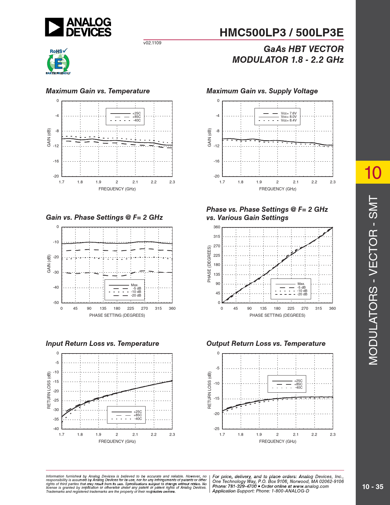 HMC500LP3 / 500LP3E. GaAs HBT VECTOR. MODULATOR 1.8 - 2.2 GHz. Maximum Gain vs. Temperature. Maximum Gain vs. Supply Voltage
