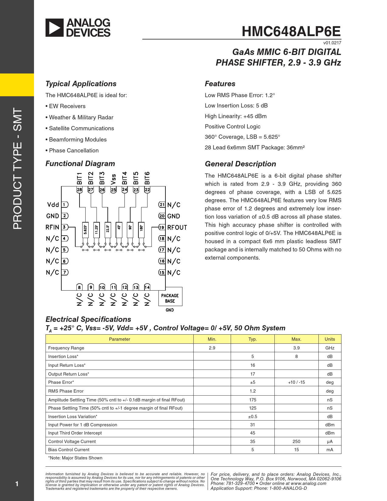 HMC648ALP6E v01.0217 GaAs MMIC 6-BIT DIGITALPHASE SHIFTER, 2.9 - 3.9 GHzTypical ApplicationsFeatures the HMc648ALP6e is ideal for: Low rMS Phase error: 1.2° t • eW receivers Low Insertion Loss: 5 dB M • Weather & Military radar High Linearity: +45 dBm Positive control Logic • Satellite communications 360° coverage, LSB = 5.625° e - S • Beamforming Modules P 28 Lead 6x6mm SMt Package: 36mm² • Phase cancel ation y t Functional DiagramGeneral Description t the HMc648ALP6e is a 6-bit digital phase shifter c which is rated from 2.9 - 3.9 GHz, providing 360 u degrees of phase coverage, with a LSB of 5.625 d degrees. the HMc648ALP6e features very low rMS o phase error of 1.2 degrees and extremely low inser- r tion loss variation of ±0.5 dB across all phase states. P this high accuracy phase shifter is control ed with positive control logic of 0/+5V. the HMc648ALP6e is housed in a compact 6x6 mm plastic leadless SMt package and is internal y matched to 50 ohms with no external components. Electrical SpecificationsT = +25° C, Vss= -5V, Vdd= +5V , Control Voltage= 0/ +5V, 50 Ohm SystemA Parameter Min. typ. Max. units Frequency range 2.9 3.9 GHz Insertion Loss* 5 8 dB Input return Loss* 16 dB output return Loss* 17 dB Phase error* ±5 +10 / -15 deg rMS Phase error 1.2 deg Amplitude Settling time (50% cntl to +/- 0.1dB margin of final rFout) 175 nS Phase Settling time (50% cntl to +/-1 degree margin of final rFout) 125 nS Insertion Loss Variation* ±0.5 dB Input Power for 1 dB compression 31 dBm Input third order Intercept 45 dBm control Voltage current 35 250 µA Bias control current 5 15 mA *Note: Major States Shown Information furnished by Analog Devices is believed to be accurate and reliable. However, no For price, delivery, and to place orders: Analog Devices, Inc., responsibility is assumed by Analog Devices for its use, nor for any infringements of patents or other One Technology Way, P.O. Box 9106, Norwood, MA 02062-9106 1 rights of third parties that may result from its use. Specifications subject to change without notice. No Phone: 781-329-4700 • Order online at www.analog.com license is granted by implication or otherwise under any patent or patent rights of Analog Devices. Trademarks and registered trademarks are the property of their respective owners. Application Support: Phone: 1-800-ANALOG-D