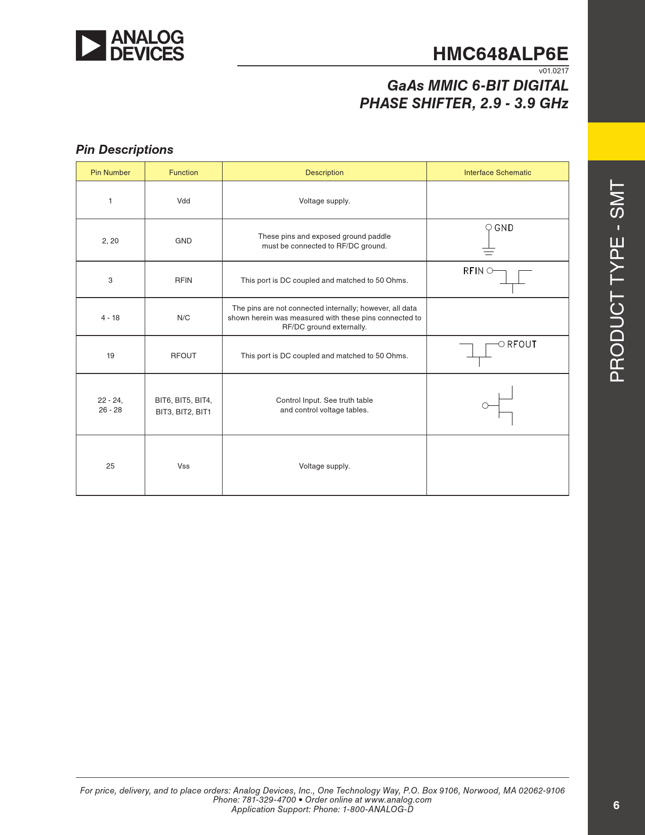 HMC648ALP6E v01.0217 GaAs MMIC 6-BIT DIGITALPHASE SHIFTER, 2.9 - 3.9 GHzPin Descriptions Pin Number Function description Interface Schematic t 1 Vdd Voltage supply. M these pins and exposed ground paddle 2, 20 GNd must be connected to rF/dc ground. e - S P y 3 rFIN this port is dc coupled and matched to 50 ohms. t t the pins are not connected internally; however, all data c 4 - 18 N/c shown herein was measured with these pins connected to rF/dc ground externally. u d 19 rFout this port is dc coupled and matched to 50 ohms. o r P 22 - 24, BIt6, BIt5, BIt4, control Input. See truth table 26 - 28 BIt3, BIt2, BIt1 and control voltage tables. 25 Vss Voltage supply. For price, delivery, and to place orders: Analog Devices, Inc., One Technology Way, P.O. Box 9106, Norwood, MA 02062-9106 Phone: 781-329-4700 • Order online at www.analog.com Application Support: Phone: 1-800-ANALOG-D 6