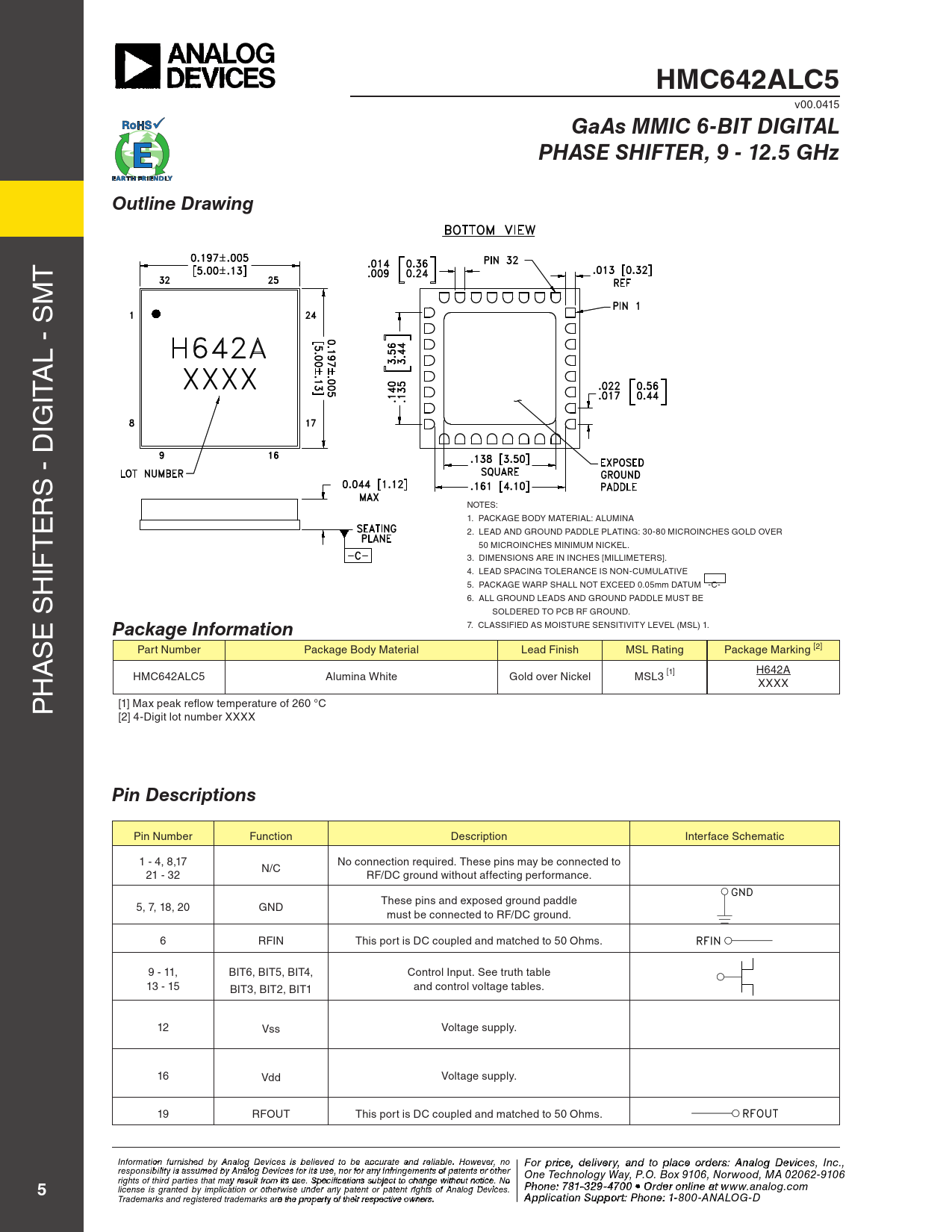 HMC642ALC5 v00.0415 GaAs MMIC 6-BIT DIGITALPHASE SHIFTER, 9 - 12.5 GHzOutline Drawing T M L - S ITA IG S - D R NOTES: E 1. PACKAGE BODY MATERIAL: ALUMINA T 2. LEAD AND GROUND PADDLE PLATING: 30-80 MICROINCHES GOLD OVER 50 MICROINCHES MINIMUM NICKEL. IF 3. DIMENSIONS ARE IN INCHES [MILLIMETERS]. H 4. LEAD SPACING TOLERANCE IS NON-CUMULATIVE 5. PACKAGE WARP SHALL NOT EXCEED 0.05mm DATUM -C- 6. ALL GROUND LEADS AND GROUND PADDLE MUST BE SOLDERED TO PCB RF GROUND. E S 7. CLASSIFIED AS MOISTURE SENSITIVITY LEVEL (MSL) 1. Package Information S Part Number Package Body Material Lead Finish MSL Rating Package Marking [2] A H HMC642ALC5 Alumina White Gold over Nickel MSL3 [1] H642A XXXX P [1] Max peak reflow temperature of 260 °C [2] 4-Digit lot number XXXX Pin Descriptions Pin Number Function Description Interface Schematic 1 - 4, 8,17 No connection required. These pins may be connected to N/C 21 - 32 RF/DC ground without affecting performance. These pins and exposed ground paddle 5, 7, 18, 20 GND must be connected to RF/DC ground. 6 RFIN This port is DC coupled and matched to 50 Ohms. 9 - 11, BIT6, BIT5, BIT4, Control Input. See truth table 13 - 15 BIT3, BIT2, BIT1 and control voltage tables. 12 Vss Voltage supply. 16 Vdd Voltage supply. 19 RFOUT This port is DC coupled and matched to 50 Ohms. Informat F io o n r p furn risihcee d , d by e An lialvoe g rDy a evic n e d t s is o p belie lva e c d t e o o b rd e a e cc rursa: A te a n n a d lo reli g D able. e H v o ic weveers, I no For price, delivery, and to place orders: Analog Devices, Inc., responsibility is assumed by Analog Devices for its use, nor for any infringements of patents or other nc., 2 Elizabeth Drive, Chelmsford, MA 01824 One Technology Way, P.O. Box 9106, Norwood, MA 02062-9106 Phone: 978-250-3343 • Fax: 978-250-3373 • O rights of third parties that may result from its use. Specifications subject to change without notice. No rd Ph e o r O ne n : 7 -l 81 i-n 3 e a 29-4t w 70 ww 0 • O .h rd iettit r o e nli.c n om 5 license is granted by implication or otherwise under any patent or patent rights of Analog Devices. e at www.analog.com Application Support: Pho Trademarks and registered trademarks are the property of their respective owners.ne: 978-250-33A4 p 3 o plic r a atiopp n S su@ p h po irtttit : Pe. hocno e m : 1-800-ANALOG-D