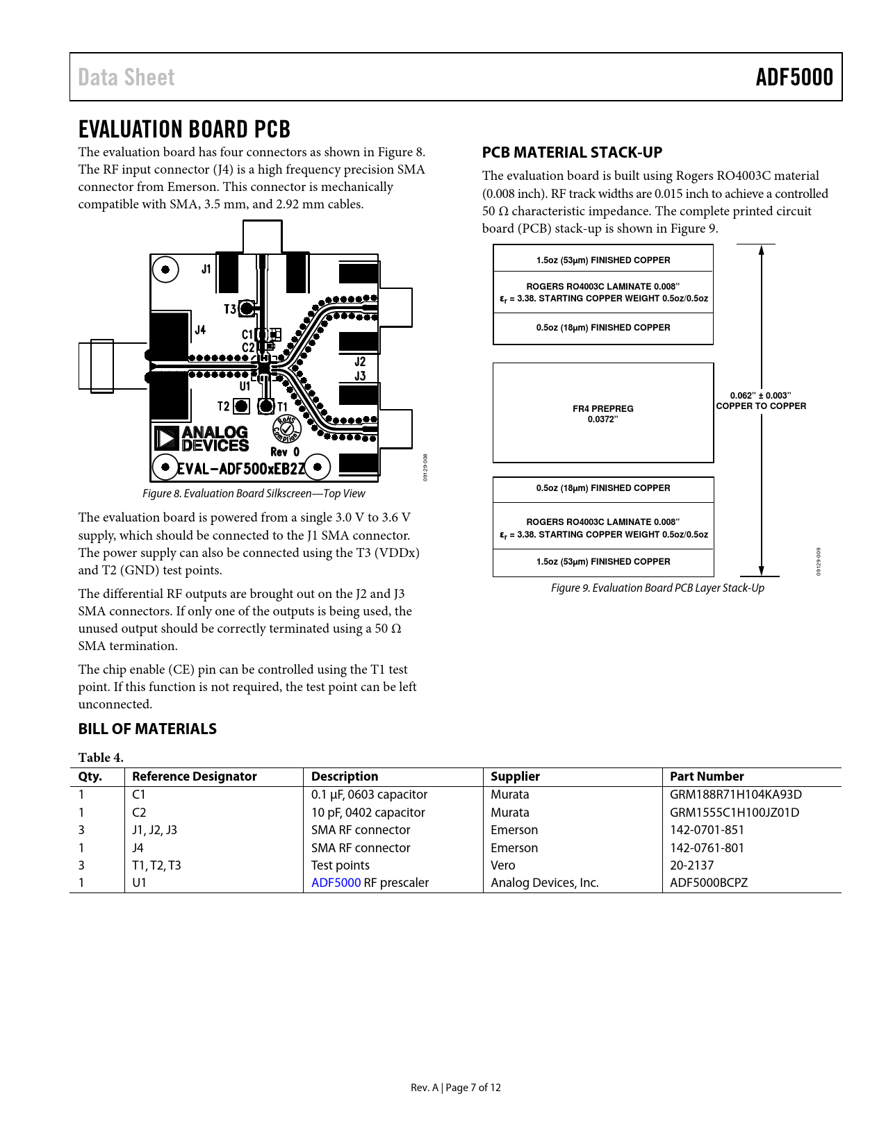 link to page 7 link to page 7 Data SheetADF5000EVALUATION BOARD PCB The evaluation board has four connectors as shown in Figure 8. PCB MATERIAL STACK-UP The RF input connector (J4) is a high frequency precision SMA The evaluation board is built using Rogers RO4003C material connector from Emerson. This connector is mechanically (0.008 inch). RF track widths are 0.015 inch to achieve a control ed compatible with SMA, 3.5 mm, and 2.92 mm cables. 50 Ω characteristic impedance. The complete printed circuit board (PCB) stack-up is shown in Figure 9. 1.5oz (53µm) FINISHED COPPERROGERS RO4003C LAMINATE 0.008”εr = 3.38. STARTING COPPER WEIGHT 0.5oz/0.5oz0.5oz (18µm) FINISHED COPPER0.062” ± 0.003”FR4 PREPREGCOPPER TO COPPER0.0372” 008 09129- Figure 8. Evaluation Board Silkscreen—Top View 0.5oz (18µm) FINISHED COPPER The evaluation board is powered from a single 3.0 V to 3.6 V ROGERS RO4003C LAMINATE 0.008” supply, which should be connected to the J1 SMA connector. εr = 3.38. STARTING COPPER WEIGHT 0.5oz/0.5oz The power supply can also be connected using the T3 (VDDx) 009 and T2 (GND) test points. 1.5oz (53µm) FINISHED COPPER 09129- The differential RF outputs are brought out on the J2 and J3 Figure 9. Evaluation Board PCB Layer Stack-Up SMA connectors. If only one of the outputs is being used, the unused output should be correctly terminated using a 50 Ω SMA termination. The chip enable (CE) pin can be controlled using the T1 test point. If this function is not required, the test point can be left unconnected. BILL OF MATERIALSTable 4. Qty.Reference DesignatorDescriptionSupplierPart Number 1 C1 0.1 µF, 0603 capacitor Murata GRM188R71H104KA93D 1 C2 10 pF, 0402 capacitor Murata GRM1555C1H100JZ01D 3 J1, J2, J3 SMA RF connector Emerson 142-0701-851 1 J4 SMA RF connector Emerson 142-0761-801 3 T1, T2, T3 Test points Vero 20-2137 1 U1 ADF5000 RF prescaler Analog Devices, Inc. ADF5000BCPZ Rev. A | Page 7 of 12 Document Outline Features Applications General Description Functional Block Diagram Table of Contents Revision History Specifications Absolute Maximum Ratings ESD Caution Pin Configuration and Function Descriptions Typical Performance Characteristics Evaluation Board PCB PCB Material Stack-Up Bill of Materials Application Circuit Outline Dimensions Ordering Guide