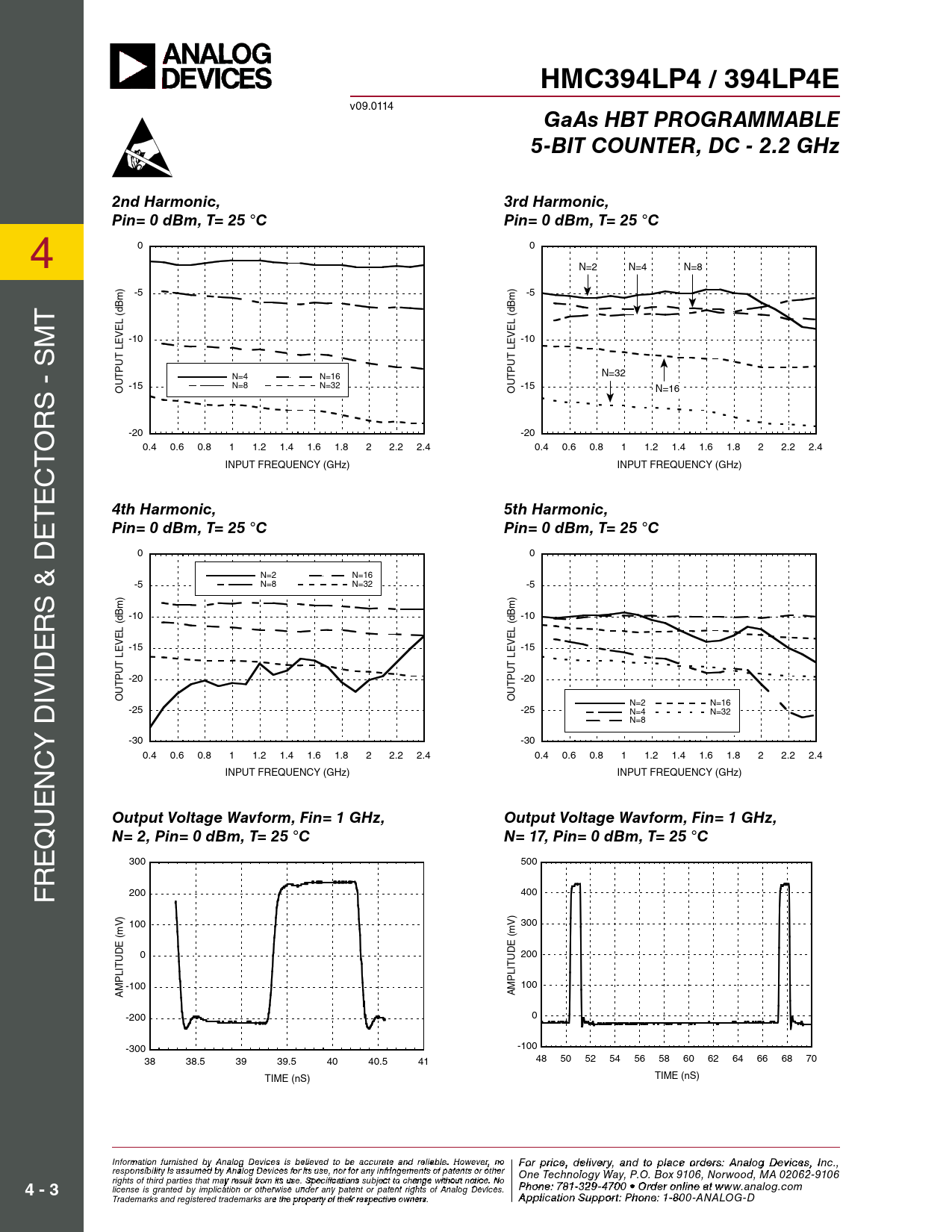 HMC394LP4 / 394LP4E. GaAs HBT PROGRAMMABLE. 5-BIT COUNTER, DC - 2.2 GHz. 2nd Harmonic,. 3rd Harmonic,. Pin= 0 dBm, T= 25 °C