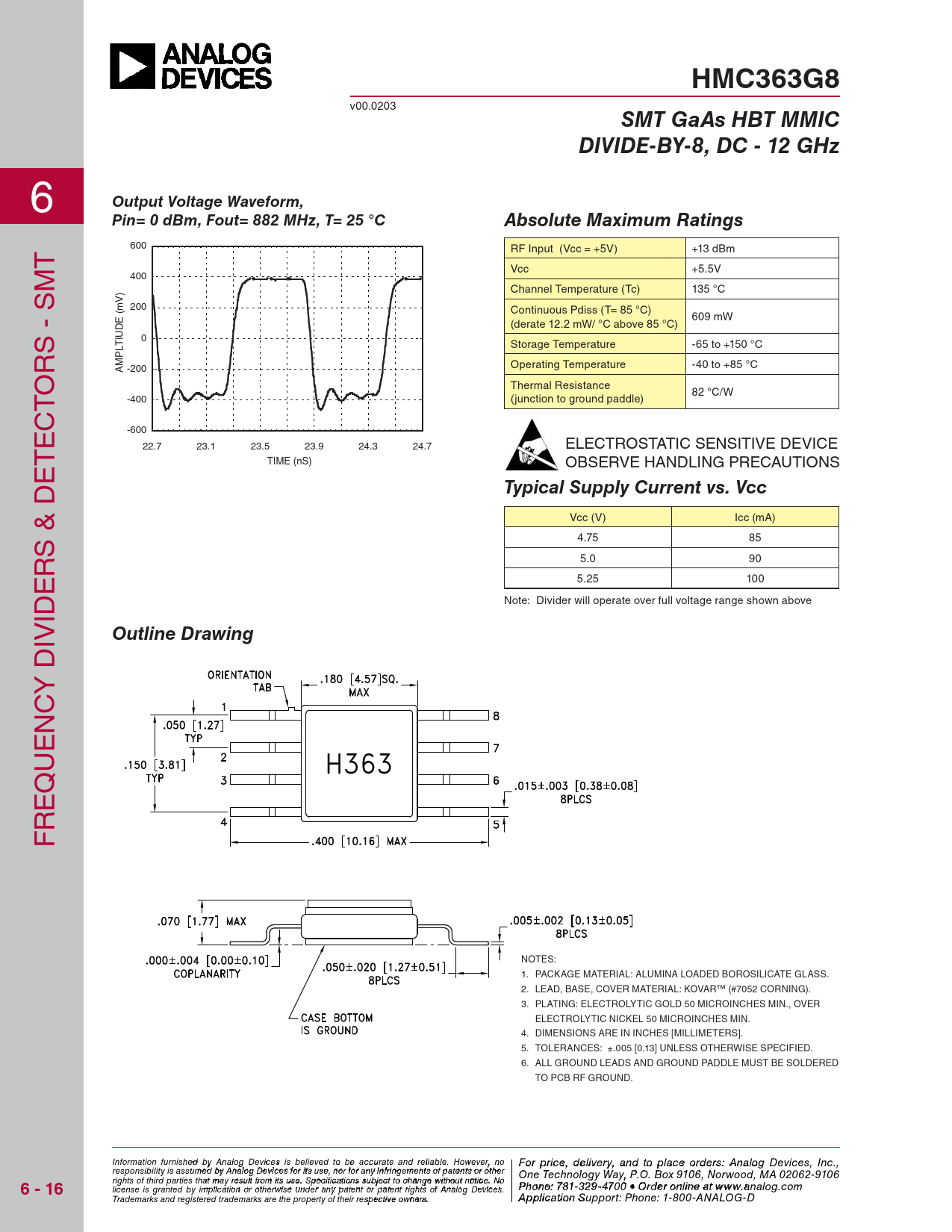 HMC363G8 v00.0203 SMT GaAs HBT MMICDIVIDE-BY-8, DC - 12 GHz 6 Output Voltage Waveform, Pin= 0 dBm, Fout= 882 MHz, T= 25 °CAbsolute Maximum Ratings 600 T RF Input (Vcc = +5V) +13 dBm Vcc +5.5V 400 Channel Temperature (Tc) 135 °C 200 Continuous Pdiss (T= 85 °C) 609 mW (derate 12.2 mW/ °C above 85 °C) S - SM 0 Storage Temperature -65 to +150 °C R Operating Temperature -40 to +85 °C AMPLTIUDE (mV) -200 O Thermal Resistance T 82 °C/W -400 (junction to ground paddle) C E -600 22.7 23.1 23.5 23.9 24.3 24.7 ELECTROSTATIC SENSITIVE DEVICE T TIME (nS) OBSERVE HANDLING PRECAUTIONS E Typical Supply Current vs. Vcc Vcc (V) Icc (mA) & D S 4.75 85 R 5.0 90 E 5.25 100 Note: Divider will operate over full voltage range shown above ID IV Outline Drawing Y D NC E U Q E R F NOTES: 1. PACKAGE MATERIAL: ALUMINA LOADED BOROSILICATE GLASS. 2. LEAD, BASE, COVER MATERIAL: KOVAR™ (#7052 CORNING). 3. PLATING: ELECTROLYTIC GOLD 50 MICROINCHES MIN., OVER ELECTROLYTIC NICKEL 50 MICROINCHES MIN. 4. DIMENSIONS ARE IN INCHES [MILLIMETERS]. 5. TOLERANCES: ±.005 [0.13] UNLESS OTHERWISE SPECIFIED. 6. ALL GROUND LEADS AND GROUND PADDLE MUST BE SOLDERED TO PCB RF GROUND. Information furnish F e o d r pri by An ce, de alog Devic leis vie s rby eli, a eve nd to pla d to be accur ce o ate an r d der relia s ble , pl . Ho ease co wever, no For price, delivery, and to place orders: Analog Devices, Inc., responsibility is assumed by Analog Devices for its use, nor for any infringements of patents or other ntact Hittite Microwave Corporation: One Technology Way, P.O. Box 9106, Norwood, MA 02062-9106 rights of third parties that may result from its use. Specifications subject to change without notice. No 6 - 16 20 Alpha Road, Chelmsford, MA 01824 Phone: 978 Pho - n 25 e: 7 0- 81 3 3 3 2 4 9- 3 F 470 ax: 978 0 • Order o - n 25 lin 0 e a-t 3373 license is granted by implication or otherwise under any patent or patent rights of Analog Devices. www.analog.com Order On- Trademarks and registered trademarks are the property of their respective owners. line at www.hi A tptipte.co licatio m n Support: Phone: 1-800-ANALOG-D