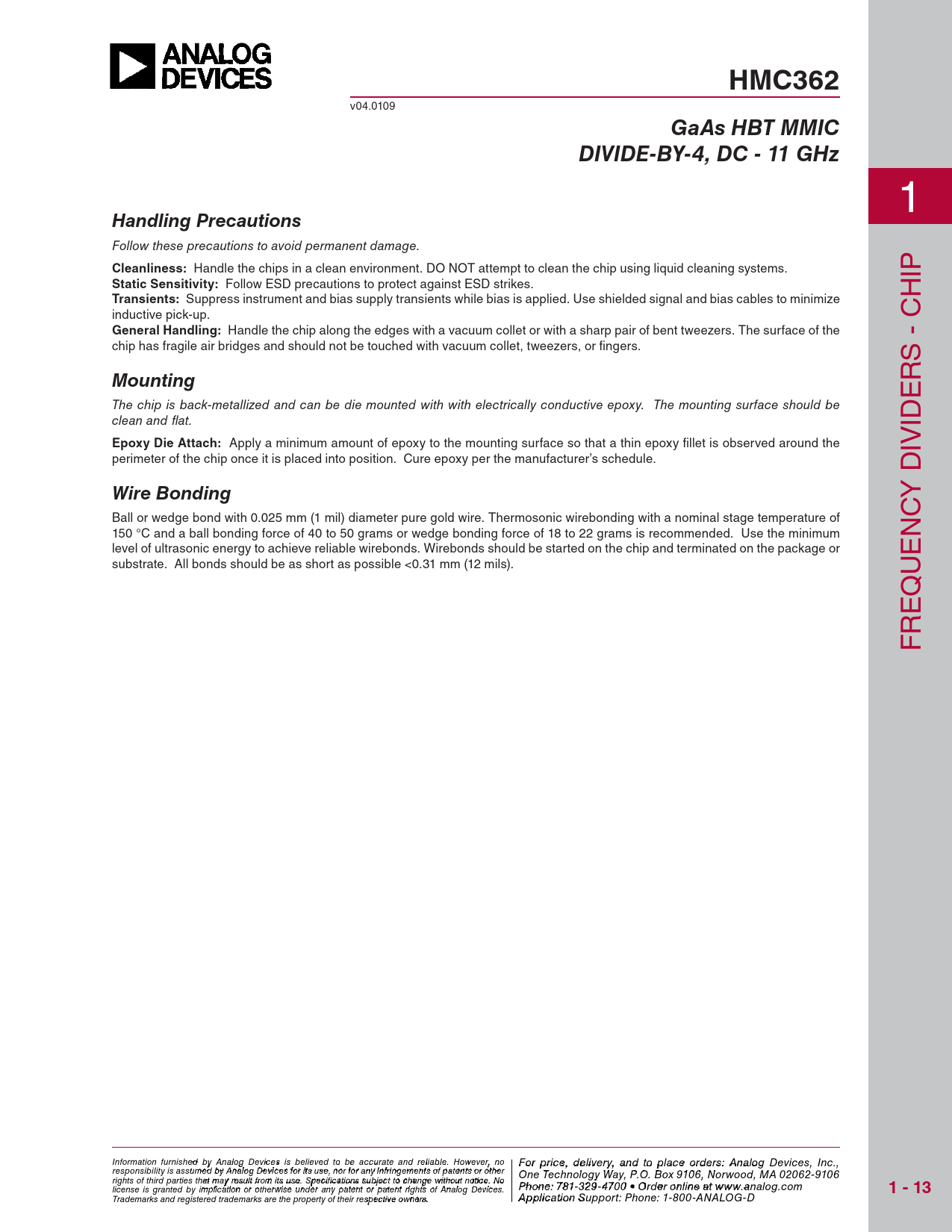 HMC362 v04.0109 GaAs HBT MMICDIVIDE-BY-4, DC - 11 GHz 1 Handling Precautions Follow these precautions to avoid permanent damage. Cleanliness: Handle the chips in a clean environment. DO NOT attempt to clean the chip using liquid cleaning systems. IP Static Sensitivity: Follow ESD precautions to protect against ESD strikes. H Transients: Suppress instrument and bias supply transients while bias is applied. Use shielded signal and bias cables to minimize inductive pick-up. General Handling: Handle the chip along the edges with a vacuum collet or with a sharp pair of bent tweezers. The surface of the chip has fragile air bridges and should not be touched with vacuum collet, tweezers, or fi ngers. S - C R Mounting E The chip is back-metallized and can be die mounted with with electrically conductive epoxy. The mounting surface should be clean and fl at. ID Epoxy Die Attach: Apply a minimum amount of epoxy to the mounting surface so that a thin epoxy fi llet is observed around the IV perimeter of the chip once it is placed into position. Cure epoxy per the manufacturer’s schedule. Wire Bonding Y D Ball or wedge bond with 0.025 mm (1 mil) diameter pure gold wire. Thermosonic wirebonding with a nominal stage temperature of 150 °C and a ball bonding force of 40 to 50 grams or wedge bonding force of 18 to 22 grams is recommended. Use the minimum NC level of ultrasonic energy to achieve reliable wirebonds. Wirebonds should be started on the chip and terminated on the package or E substrate. All bonds should be as short as possible <0.31 mm (12 mils). U Q E R F Information furnish F e o d r pri by An ce, de alog Devic leis vie s rby eli, a eve nd to pla d to be accur ce o ate an r d der relia s ble , pl . Ho ease co wever, no For price, delivery, and to place orders: Analog Devices, Inc., responsibility is assumed by Analog Devices for its use, nor for any infringements of patents or other ntact Hittite Microwave Corporation: One Technology Way, P.O. Box 9106, Norwood, MA 02062-9106 20 Alpha Road, Chelmsford, MA 01824 Phone rights of third parties that may result from its use. Specifications subject to change without notice. No : 978 Phon -e25 : 7 0 81 - - 3 3 3 29 4 - 3 F 470 ax 0 • O : 978 rder o - nl 25 in 0 e a - t 33 ww 73 license is granted by implication or otherwise under any patent or patent rights of Analog Devices. w.analog.com 1 - 13 Order On- Trademarks and registered trademarks are the property of their respective owners. line at www.hi A tptipte.co licatio m n Support: Phone: 1-800-ANALOG-D