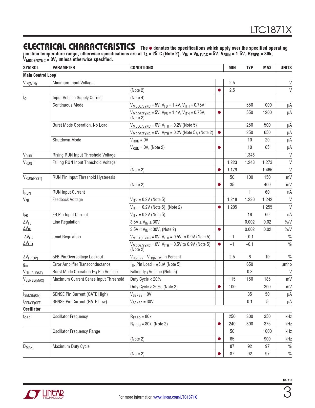 VIN(MIN) Minimum Input Voltage 2.5 V (Note 2) l 2.5 V IQ Input Voltage Supply Current (Note 4) Continuous Mode VMODE/SYNC = 5V, VFB = 1.4V, VITH = 0.75V 550 1000 μA VMODE/SYNC = 5V, VFB = 1.4V, VITH = 0.75V, l 550 1200 μA (Note 2) Burst Mode Operation, No Load VMODE/SYNC = 0V, VITH = 0.2V (Note 5) 250 500 μA VMODE/SYNC = 0V, VITH = 0.2V (Note 5), (Note 2) l 250 650 μA Shutdown Mode VRUN = 0V 10 20 μA VRUN = 0V, (Note 2) l 10 65 μA V + RUN Rising RUN Input Threshold Voltage 1.348 V V – RUN Falling RUN Input Threshold Voltage 1.223 1.248 1.273 V (Note 2) l 1.179 1.465 V VRUN(HYST) RUN Pin Input Threshold Hysteresis 50 100 150 mV (Note 2) l 35 400 mV IRUN RUN Input Current 1 60 nA VFB Feedback Voltage VITH = 0.2V (Note 5) 1.218 1.230 1.242 V VITH = 0.2V (Note 5), (Note 2) l 1.205 1.255 V IFB FB Pin Input Current VITH = 0.2V (Note 5) 18 60 nA ∆VFB Line Regulation 3.5V ≤ VIN ≤ 30V 0.002 0.02 %/V ∆VIN 3.5V ≤ VIN ≤ 30V, (Note 2) l 0.002 0.02 %/V ∆VFB Load Regulation VMODE/SYNC = 0V, VITH = 0.5V to 0.9V (Note 5) –1 –0.1 % ∆VITH VMODE/SYNC = 0V, VITH = 0.5V to 0.9V (Note 5) l –1 –0.1 % (Note 2) ∆VFB(OV) ∆FB Pin,Overvoltage Lockout VFB(OV) – VFB(NOM) in Percent 2.5 6 10 % gm Error Amplifier Transconductance ITH Pin Load = ±5μA (Note 5) 650 μmho VITH(BURST) Burst Mode Operation ITH Pin Voltage Falling ITH Voltage (Note 5) 0.3 V VSENSE(MAX) Maximum Current Sense Input Threshold Duty Cycle < 20% 115 150 185 mV Duty Cycle < 20%, (Note 2) l 100 200 mV ISENSE(ON) SENSE Pin Current (GATE High) VSENSE = 0V 35 50 μA ISENSE(OFF) SENSE Pin Current (GATE Low) VSENSE = 30V 0.1 5 μA