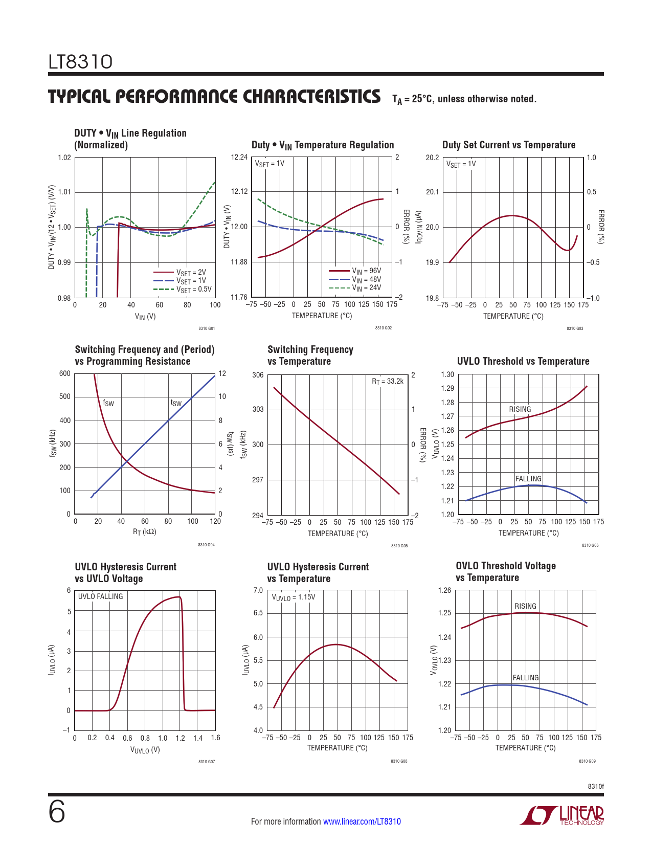 600 12 306 2 1.30 RT = 33.2k 1.29 500 10 fSW tSW 1.28 303 1 RISING 400 8 1.27 t ERROR (%) SW 1.26 (V) (kHz) (µs) 300 6 (kHz) 300 0 1.25 f SW f SW V UVLO 1.24 200 4 1.23 297 –1 FALLING 100 2 1.22 1.21 0 0 294 –2 1.20 0 20 40 60 80 100 120 –75 –50 –25 0 25 50 75 100 125 150 175 –75 –50 –25 0 25 50 75 100 125 150 175 RT (kΩ) TEMPERATURE (°C) TEMPERATURE (°C) 8310 G04 8310 G05 8310 G06