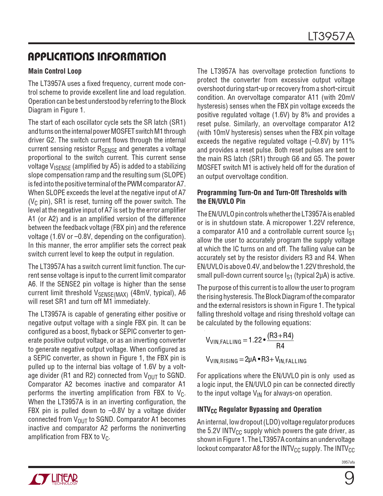 LT3957A APPLICATIONS INFORMATIONMain Control Loop The LT3957A has overvoltage protection functions to protect the converter from excessive output voltage The LT3957A uses a fixed frequency, current mode con- overshoot during start-up or recovery from a short-circuit trol scheme to provide excellent line and load regulation. condition. An overvoltage comparator A11 (with 20mV Operation can be best understood by referring to the Block hysteresis) senses when the FBX pin voltage exceeds the Diagram in Figure 1. positive regulated voltage (1.6V) by 8% and provides a The start of each oscillator cycle sets the SR latch (SR1) reset pulse. Similarly, an overvoltage comparator A12 and turns on the internal power MOSFET switch M1 through (with 10mV hysteresis) senses when the FBX pin voltage driver G2. The switch current flows through the internal exceeds the negative regulated voltage (–0.8V) by 11% current sensing resistor RSENSE and generates a voltage and provides a reset pulse. Both reset pulses are sent to proportional to the switch current. This current sense the main RS latch (SR1) through G6 and G5. The power voltage VISENSE (amplified by A5) is added to a stabilizing MOSFET switch M1 is actively held off for the duration of slope compensation ramp and the resulting sum (SLOPE) an output overvoltage condition. is fed into the positive terminal of the PWM comparator A7. When SLOPE exceeds the level at the negative input of A7 Programming Turn-On and Turn-Off Thresholds with (VC pin), SR1 is reset, turning off the power switch. The the EN/UVLO Pin level at the negative input of A7 is set by the error amplifier The EN/UVLO pin controls whether the LT3957A is enabled A1 (or A2) and is an amplified version of the difference or is in shutdown state. A micropower 1.22V reference, between the feedback voltage (FBX pin) and the reference a comparator A10 and a controllable current source I voltage (1.6V or –0.8V, depending on the configuration). S1 allow the user to accurately program the supply voltage In this manner, the error amplifier sets the correct peak at which the IC turns on and off. The falling value can be switch current level to keep the output in regulation. accurately set by the resistor dividers R3 and R4. When The LT3957A has a switch current limit function. The cur- EN/UVLO is above 0.4V, and below the 1.22V threshold, the rent sense voltage is input to the current limit comparator small pull-down current source IS1 (typical 2μA) is active. A6. If the SENSE2 pin voltage is higher than the sense The purpose of this current is to allow the user to program current limit threshold VSENSE(MAX) (48mV, typical), A6 the rising hysteresis. The Block Diagram of the comparator will reset SR1 and turn off M1 immediately. and the external resistors is shown in Figure 1. The typical The LT3957A is capable of generating either positive or falling threshold voltage and rising threshold voltage can negative output voltage with a single FBX pin. It can be be calculated by the following equations: configured as a boost, flyback or SEPIC converter to gen- (R3+R4) erate positive output voltage, or as an inverting converter VVIN,FALLING = 1.22 • to generate negative output voltage. When configured as R4 a SEPIC converter, as shown in Figure 1, the FBX pin is VVIN,RISING = 2μA • R3+ VIN,FALLING pulled up to the internal bias voltage of 1.6V by a volt- age divider (R1 and R2) connected from VOUT to SGND. For applications where the EN/UVLO pin is only used as Comparator A2 becomes inactive and comparator A1 a logic input, the EN/UVLO pin can be connected directly performs the inverting amplification from FBX to VC. to the input voltage VIN for always-on operation. When the LT3957A is in an inverting configuration, the FBX pin is pulled down to –0.8V by a voltage divider INTVCC Regulator Bypassing and Operation connected from VOUT to SGND. Comparator A1 becomes An internal, low dropout (LDO) voltage regulator produces inactive and comparator A2 performs the noninverting the 5.2V INTVCC supply which powers the gate driver, as amplification from FBX to VC. shown in Figure 1. The LT3957A contains an undervoltage lockout comparator A8 for the INTVCC supply. The INTVCC 3957afa 9