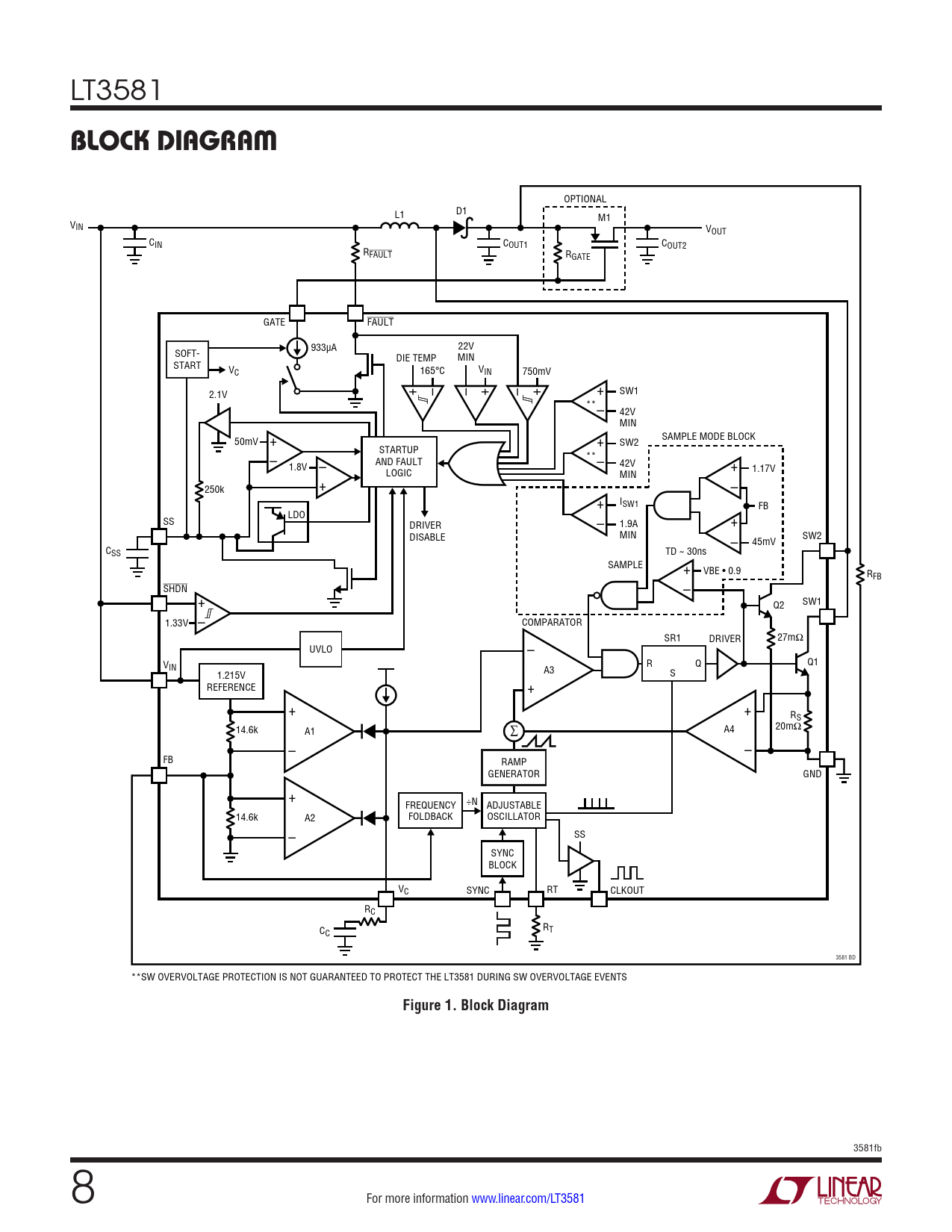 OPTIONAL D1 L1 M1 VIN VOUT CIN COUT1 COUT2 RFAULT RGATE GATE FAULT 22V SOFT- 933µA DIE TEMP MIN START VC 165°C VIN 750mV + – – + – + 2.1V + SW1 ** – 42V MIN 50mV + SAMPLE MODE BLOCK + SW2 STARTUP – ** 1.8V – AND FAULT – 42V + 1.17V LOGIC MIN 250k + – + ISW1 FB LDO SS DRIVER – 1.9A + DISABLE MIN SW2 – 45mV CSS TD ~ 30ns SAMPLE + VBE • 0.9 RFB SHDN – + SW1 Q2 1.33V – COMPARATOR SR1 DRIVER 27mΩ UVLO – V Q1 IN R Q A3 A3 1.215V S REFERENCE + + + RS 14.6k 20mΩ A1 A4 ∑ – – FB RAMP GENERATOR GND + FREQUENCY ÷N ADJUSTABLE 14.6k A2 FOLDBACK OSCILLATOR SS – SYNC BLOCK VC SYNC RT CLKOUT RC R C T C 3581 BD **SW OVERVOLTAGE PROTECTION IS NOT GUARANTEED TO PROTECT THE LT3581 DURING SW OVERVOLTAGE EVENTS