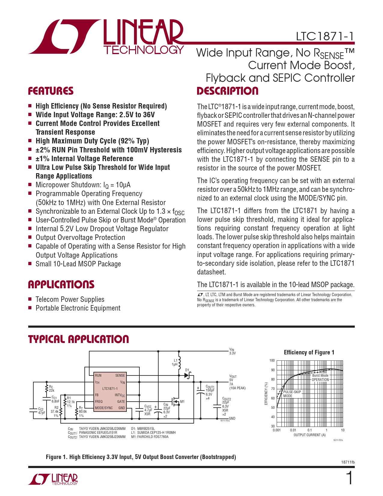 LTC1871-1 Wide Input Range, No RSENSE™ Current Mode Boost, Flyback and SEPIC Controller FEATURESDESCRIPTION n High Effi ciency (No Sense Resistor Required) The LTC®1871-1 is a wide input range, current mode, boost, n Wide Input Voltage Range: 2.5V to 36V fl yback or SEPIC controller that drives an N-channel power n Current Mode Control Provides Excellent MOSFET and requires very few external components. It TransientResponse eliminates the need for a current sense resistor by utilizing n High Maximum Duty Cycle (92% Typ) the power MOSFET’s on-resistance, thereby maximizing n ±2% RUN Pin Threshold with 100mV Hysteresis effi ciency. Higher output voltage applications are possible n ±1% Internal Voltage Reference with the LTC1871-1 by connecting the SENSE pin to a n Ultra Low Pulse Skip Threshold for Wide Input resistor in the source of the power MOSFET. Range Applications The IC’s operating frequency can be set with an external n Micropower Shutdown: IQ = 10μA resistor over a 50kHz to 1MHz range, and can be synchro- n Programmable Operating Frequency nized to an external clock using the MODE/SYNC pin. (50kHz to 1MHz) with One External Resistor n Synchronizable to an External Clock Up to 1.3 × f The LTC1871-1 differs from the LTC1871 by having a OSC n User-Controlled Pulse Skip or Burst Mode® Operation lower pulse skip threshold, making it ideal for applica- n Internal 5.2V Low Dropout Voltage Regulator tions requiring constant frequency operation at light n Output Overvoltage Protection loads. The lower pulse skip threshold also helps maintain n Capable of Operating with a Sense Resistor for High constant frequency operation in applications with a wide Output Voltage Applications input voltage range. For applications requiring primary- n Small 10-Lead MSOP Package to-secondary side isolation, please refer to the LTC1871 datasheet. APPLICATIONS The LTC1871-1 is available in the 10-lead MSOP package. L, LT, LTC, LTM and Burst Mode are registered trademarks of Linear Technology Corporation. n Telecom Power Supplies No RSENSE is a trademark of Linear Technology Corporation. All other trademarks are the n Portable Electronic Equipment property of their respective owners. TYPICAL APPLICATION VIN 3.3V Effi ciency of Figure 1 L1 100 1μH D1 90 RUN SENSE VOUT Burst Mode 5V 80 OPERATION ITH VIN 7A RC C LTC1871-1 OUT1 + (10A PEAK) 70 22k 150μF PULSE-SKIP FB INTV 6.3V CC C MODE C1 R1 ×4 COUT2 60 6.8nF 12.1k FREQ GATE M1 22μF EFFICIENCY (%) 1% CIN R2 R CVCC + 6.3V C T MODE/SYNC GND 22μF 50 C2 37.4k 80.6k 4.7μF X5R 47pF 6.3V 1% 1% X5R ×2 ×2 GND 40 18711 F01a 30 CIN: TAIYO YUDEN JMK325BJ226MM D1: MBRB2515L 0.001 0.01 0.1 1 10 COUT1: PANASONIC EEFUEOJ151R L1: SUMIDA CEP125-H 1R0MH OUTPUT CURRENT (A) COUT2: TAIYO YUDEN JMK325BJ226MM M1: FAIRCHILD FDS7760A 18711 F01b Figure 1. High Effi ciency 3.3V Input, 5V Output Boost Converter (Bootstrapped) 18711fb 1