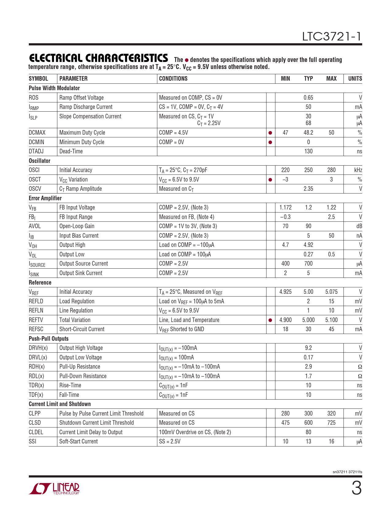 CLPP Pulse by Pulse Current Limit Threshold Measured on CS 280 300 320 mV CLSD Shutdown Current Limit Threshold Measured on CS 475 600 725 mV CLDEL Current Limit Delay to Output 100mV Overdrive on CS, (Note 2) 80 ns SSI Soft-Start Current SS = 2.5V 10 13 16 µA sn37211 37211fs 3