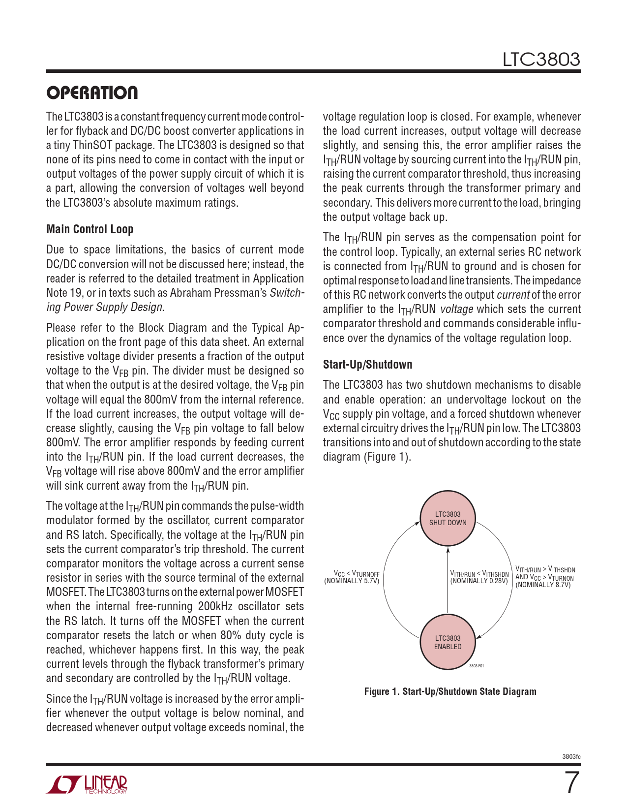 LTC3803 OPERATION The LTC3803 is a constant frequency current mode control- voltage regulation loop is closed. For example, whenever ler for fl yback and DC/DC boost converter applications in the load current increases, output voltage will decrease a tiny ThinSOT package. The LTC3803 is designed so that slightly, and sensing this, the error amplifi er raises the none of its pins need to come in contact with the input or ITH/RUN voltage by sourcing current into the ITH/RUN pin, output voltages of the power supply circuit of which it is raising the current comparator threshold, thus increasing a part, allowing the conversion of voltages well beyond the peak currents through the transformer primary and the LTC3803’s absolute maximum ratings. secondary. This delivers more current to the load, bringing the output voltage back up. Main Control Loop The ITH/RUN pin serves as the compensation point for Due to space limitations, the basics of current mode the control loop. Typically, an external series RC network DC/DC conversion will not be discussed here; instead, the is connected from ITH/RUN to ground and is chosen for reader is referred to the detailed treatment in Application optimal response to load and line transients. The impedance Note 19, or in texts such as Abraham Pressman’s Switch- of this RC network converts the output current of the error ing Power Supply Design. amplifi er to the ITH/RUN voltage which sets the current Please refer to the Block Diagram and the Typical Ap- comparator threshold and commands considerable infl u- plication on the front page of this data sheet. An external ence over the dynamics of the voltage regulation loop. resistive voltage divider presents a fraction of the output Start-Up/Shutdown voltage to the VFB pin. The divider must be designed so that when the output is at the desired voltage, the VFB pin The LTC3803 has two shutdown mechanisms to disable voltage will equal the 800mV from the internal reference. and enable operation: an undervoltage lockout on the If the load current increases, the output voltage will de- VCC supply pin voltage, and a forced shutdown whenever crease slightly, causing the VFB pin voltage to fall below external circuitry drives the ITH/RUN pin low. The LTC3803 800mV. The error amplifi er responds by feeding current transitions into and out of shutdown according to the state into the ITH/RUN pin. If the load current decreases, the diagram (Figure 1). VFB voltage will rise above 800mV and the error amplifi er will sink current away from the ITH/RUN pin. The voltage at the ITH/RUN pin commands the pulse-width LTC3803 modulator formed by the oscillator, current comparator SHUT DOWN and RS latch. Specifi cally, the voltage at the ITH/RUN pin sets the current comparator’s trip threshold. The current comparator monitors the voltage across a current sense VITH/RUN > VITHSHDN resistor in series with the source terminal of the external V V CC < VTURNOFF ITH/RUN < VITHSHDN AND V (NOMINALLY 5.7V) (NOMINALLY 0.28V) CC > VTURNON (NOMINALLY 8.7V) MOSFET. The LTC3803 turns on the external power MOSFET when the internal free-running 200kHz oscillator sets the RS latch. It turns off the MOSFET when the current comparator resets the latch or when 80% duty cycle is LTC3803 reached, whichever happens fi rst. In this way, the peak ENABLED current levels through the fl yback transformer’s primary 3803 F01 and secondary are controlled by the ITH/RUN voltage. Figure 1. Start-Up/Shutdown State Diagram Since the ITH/RUN voltage is increased by the error ampli- fi er whenever the output voltage is below nominal, and decreased whenever output voltage exceeds nominal, the 3803fc 7 Document Outline FEATURES DESCRIPTION APPLICATIONS TYPICAL APPLICATION ABSOLUTE MAXIMUM RATINGS PIN CONFIGURATION ORDER INFORMATION ELECTRICAL CHARACTERISTICS TYPICAL PERFORMANCE CHARACTERISTICS PIN FUNCTIONS BLOCK DIAGRAM OPERATION APPLICATIONS INFORMATION TYPICAL APPLICATIONS PACKAGE DESCRIPTION REVISION HISTORY TYPICAL APPLICATIONS RELATED PARTS