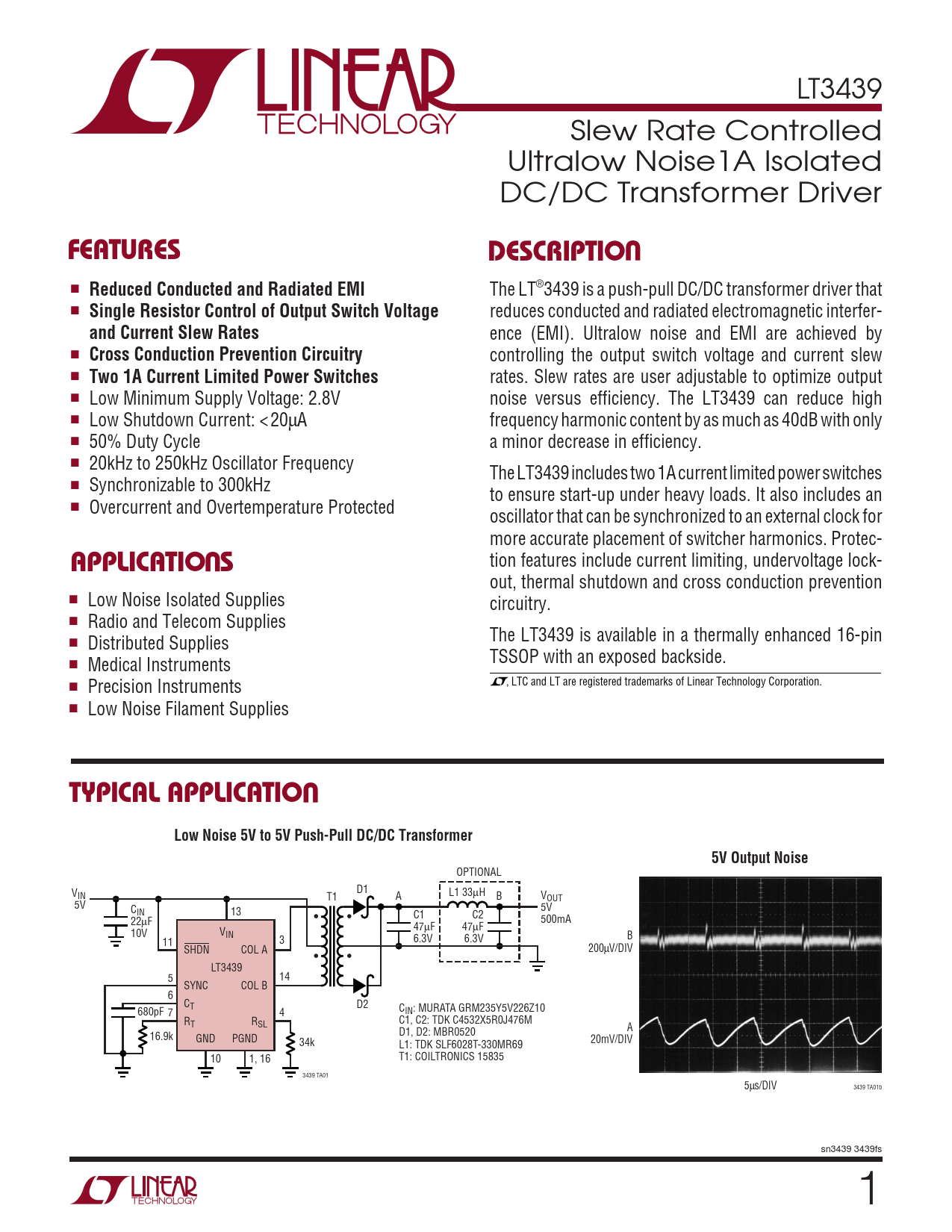 LT3439 Slew Rate Controlled Ultralow Noise1A Isolated DC/DC Transformer Driver UFEATURESDESCRIPTIO ■ Reduced Conducted and Radiated EMI The LT®3439 is a push-pull DC/DC transformer driver that ■ Single Resistor Control of Output Switch Voltage reduces conducted and radiated electromagnetic interfer- and Current Slew Rates ence (EMI). Ultralow noise and EMI are achieved by ■ Cross Conduction Prevention Circuitry controlling the output switch voltage and current slew ■ Two 1A Current Limited Power Switches rates. Slew rates are user adjustable to optimize output ■ Low Minimum Supply Voltage: 2.8V noise versus efficiency. The LT3439 can reduce high ■ Low Shutdown Current: < 20µA frequency harmonic content by as much as 40dB with only ■ 50% Duty Cycle a minor decrease in efficiency. ■ 20kHz to 250kHz Oscillator Frequency The LT3439 includes two 1A current limited power switches ■ Synchronizable to 300kHz to ensure start-up under heavy loads. It also includes an ■ Overcurrent and Overtemperature Protected oscillator that can be synchronized to an external clock for more accurate placement of switcher harmonics. Protec- U tion features include current limiting, undervoltage lock- APPLICATIO S out, thermal shutdown and cross conduction prevention ■ Low Noise Isolated Supplies circuitry. ■ Radio and Telecom Supplies The LT3439 is available in a thermally enhanced 16-pin ■ Distributed Supplies TSSOP with an exposed backside. ■ Medical Instruments ■ Precision Instruments , LTC and LT are registered trademarks of Linear Technology Corporation. ■ Low Noise Filament Supplies UTYPICAL APPLICATIOLow Noise 5V to 5V Push-Pull DC/DC Transformer5V Output Noise OPTIONAL V D1 IN L1 33µH T1 A B VOUT 5V C 5V IN 13 C1 C2 22µF • • 500mA 47µF 47µF 10V VIN B 11 3 6.3V 6.3V SHDN COL A 200µV/DIV • • LT3439 5 14 SYNC COL B 6 CT D2 680pF 7 4 CIN: MURATA GRM235Y5V226Z10 R R C1, C2: TDK C4532X5R0J476M T SL A 16.9k D1, D2: MBR0520 GND PGND 34k L1: TDK SLF6028T-330MR69 20mV/DIV 10 1, 16 T1: COILTRONICS 15835 3439 TA01 5µs/DIV 3439 TA01b sn3439 3439fs 1