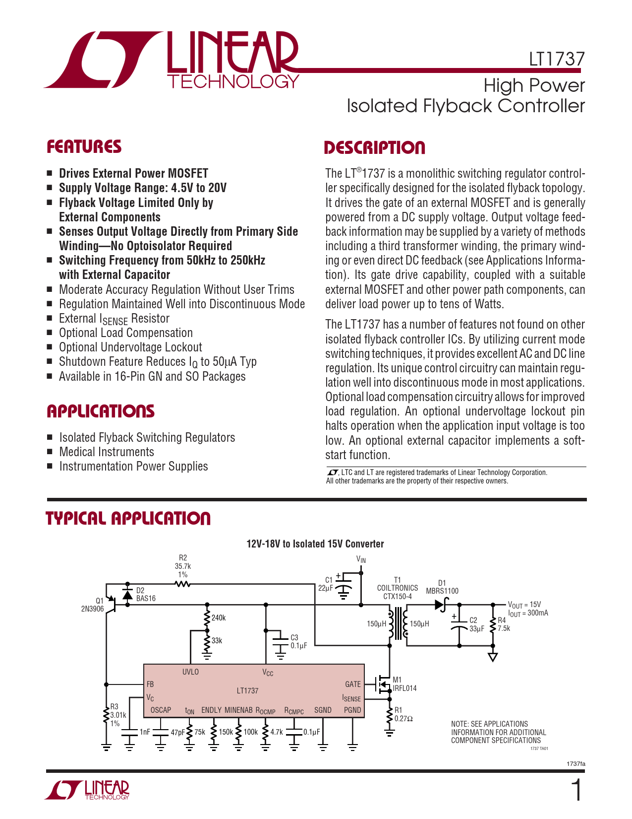 LT1737 High Power Isolated Flyback Controller UFEATURESDESCRIPTIO ■ Drives External Power MOSFET The LT®1737 is a monolithic switching regulator control- ■ Supply Voltage Range: 4.5V to 20V ler specifically designed for the isolated flyback topology. ■ Flyback Voltage Limited Only by It drives the gate of an external MOSFET and is generally External Components powered from a DC supply voltage. Output voltage feed- ■ Senses Output Voltage Directly from Primary Side back information may be supplied by a variety of methods Winding—No Optoisolator Required including a third transformer winding, the primary wind- ■ Switching Frequency from 50kHz to 250kHz ing or even direct DC feedback (see Applications Informa- with External Capacitor tion). Its gate drive capability, coupled with a suitable ■ Moderate Accuracy Regulation Without User Trims external MOSFET and other power path components, can ■ Regulation Maintained Well into Discontinuous Mode deliver load power up to tens of Watts. ■ External ISENSE Resistor The LT1737 has a number of features not found on other ■ Optional Load Compensation isolated flyback controller ICs. By utilizing current mode ■ Optional Undervoltage Lockout switching techniques, it provides excellent AC and DC line ■ Shutdown Feature Reduces IQ to 50µA Typ regulation. Its unique control circuitry can maintain regu- ■ Available in 16-Pin GN and SO Packages lation well into discontinuous mode in most applications. U Optional load compensation circuitry allows for improved APPLICATIO S load regulation. An optional undervoltage lockout pin halts operation when the application input voltage is too ■ Isolated Flyback Switching Regulators low. An optional external capacitor implements a soft- ■ Medical Instruments start function. ■ Instrumentation Power Supplies , LTC and LT are registered trademarks of Linear Technology Corporation. All other trademarks are the property of their respective owners. UTYPICAL APPLICATIO12V-18V to Isolated 15V Converter R2 VIN 35.7k 1% + C1 T1 D1 22µF COILTRONICS D2 MBRS1100 CTX150-4 BAS16 Q1 VOUT = 15V 2N3906 • 240k + IOUT = 300mA C2 R4 150µH 150µH 33µF 7.5k • C3 33k 0.1µF UVLO VCC M1 FB GATE IRFL014 LT1737 V I C SENSE R3 OSCAP t ENDLY MINENAB R R SGND PGND R1 ON OCMP CMPC 3.01k 0.27Ω 1% NOTE: SEE APPLICATIONS 1nF 47pF 75k 150k 100k 4.7k 0.1µF INFORMATION FOR ADDITIONAL COMPONENT SPECIFICATIONS 1737 TA01 1737fa 1