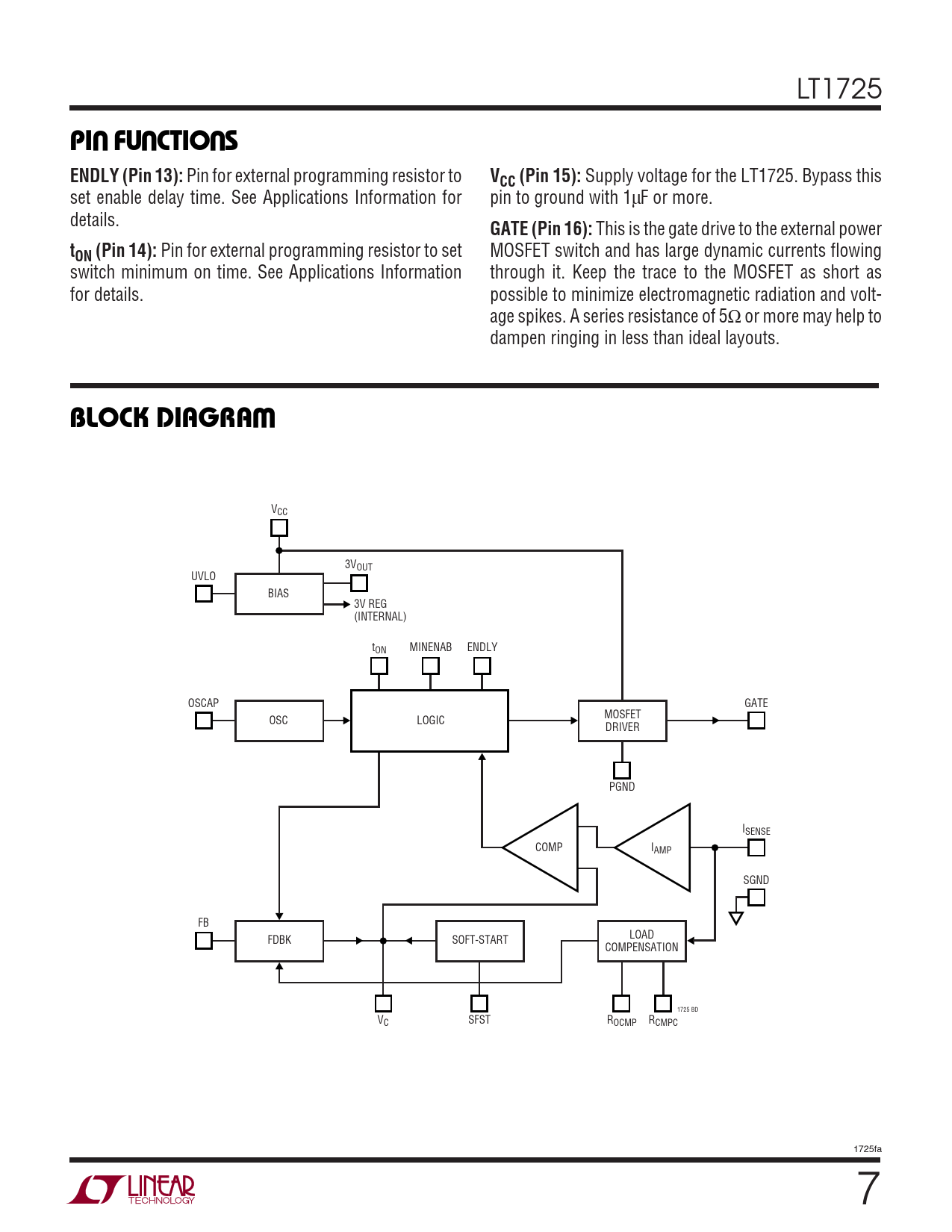 VCC 3VOUT UVLO BIAS 3V REG (INTERNAL) t MINENAB ENDLY ON OSCAP GATE MOSFET OSC LOGIC DRIVER PGND ISENSE COMP IAMP SGND FB LOAD FDBK SOFT-START COMPENSATION 1725 BD VC SFST ROCMP RCMPC 1725fa 7
