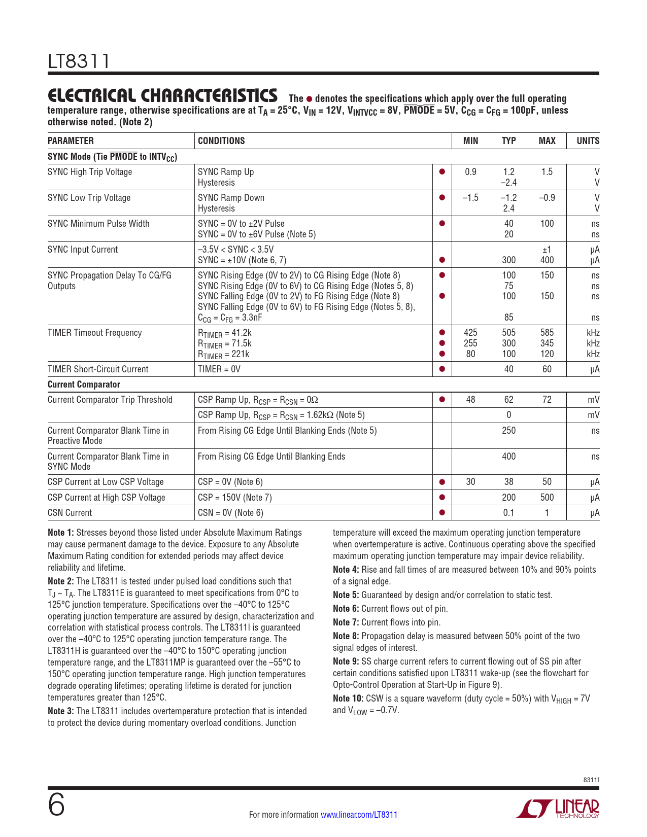 SYNC High Trip Voltage SYNC Ramp Up l 0.9 1.2 1.5 V Hysteresis –2.4 V SYNC Low Trip Voltage SYNC Ramp Down l –1.5 –1.2 –0.9 V Hysteresis 2.4 V SYNC Minimum Pulse Width SYNC = 0V to ±2V Pulse l 40 100 ns SYNC = 0V to ±6V Pulse (Note 5) 20 ns SYNC Input Current –3.5V < SYNC < 3.5V ±1 µA SYNC = ±10V (Note 6, 7) l 300 400 µA SYNC Propagation Delay To CG/FG SYNC Rising Edge (0V to 2V) to CG Rising Edge (Note 8) l 100 150 ns Outputs SYNC Rising Edge (0V to 6V) to CG Rising Edge (Notes 5, 8) 75 ns SYNC Falling Edge (0V to 2V) to FG Rising Edge (Note 8) l 100 150 ns SYNC Falling Edge (0V to 6V) to FG Rising Edge (Notes 5, 8), CCG = CFG = 3.3nF 85 ns TIMER Timeout Frequency RTIMER = 41.2k l 425 505 585 kHz RTIMER = 71.5k l 255 300 345 kHz RTIMER = 221k l 80 100 120 kHz TIMER Short-Circuit Current TIMER = 0V l 40 60 µA