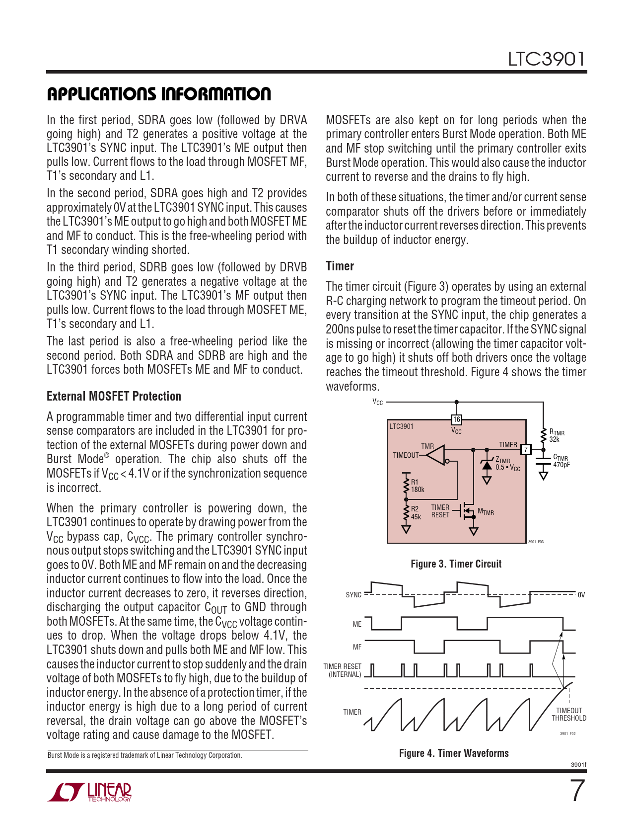 inductor current continues to flow into the load. Once the inductor current decreases to zero, it reverses direction, SYNC 0V discharging the output capacitor COUT to GND through both MOSFETs. At the same time, the CVCC voltage contin- ME ues to drop. When the voltage drops below 4.1V, the LTC3901 shuts down and pulls both ME and MF low. This MF causes the inductor current to stop suddenly and the drain TIMER RESET voltage of both MOSFETs to fly high, due to the buildup of (INTERNAL) inductor energy. In the absence of a protection timer, if the inductor energy is high due to a long period of current TIMER TIMEOUT reversal, the drain voltage can go above the MOSFET’s THRESHOLD voltage rating and cause damage to the MOSFET. 3901 F02 Burst Mode is a registered trademark of Linear Technology Corporation.