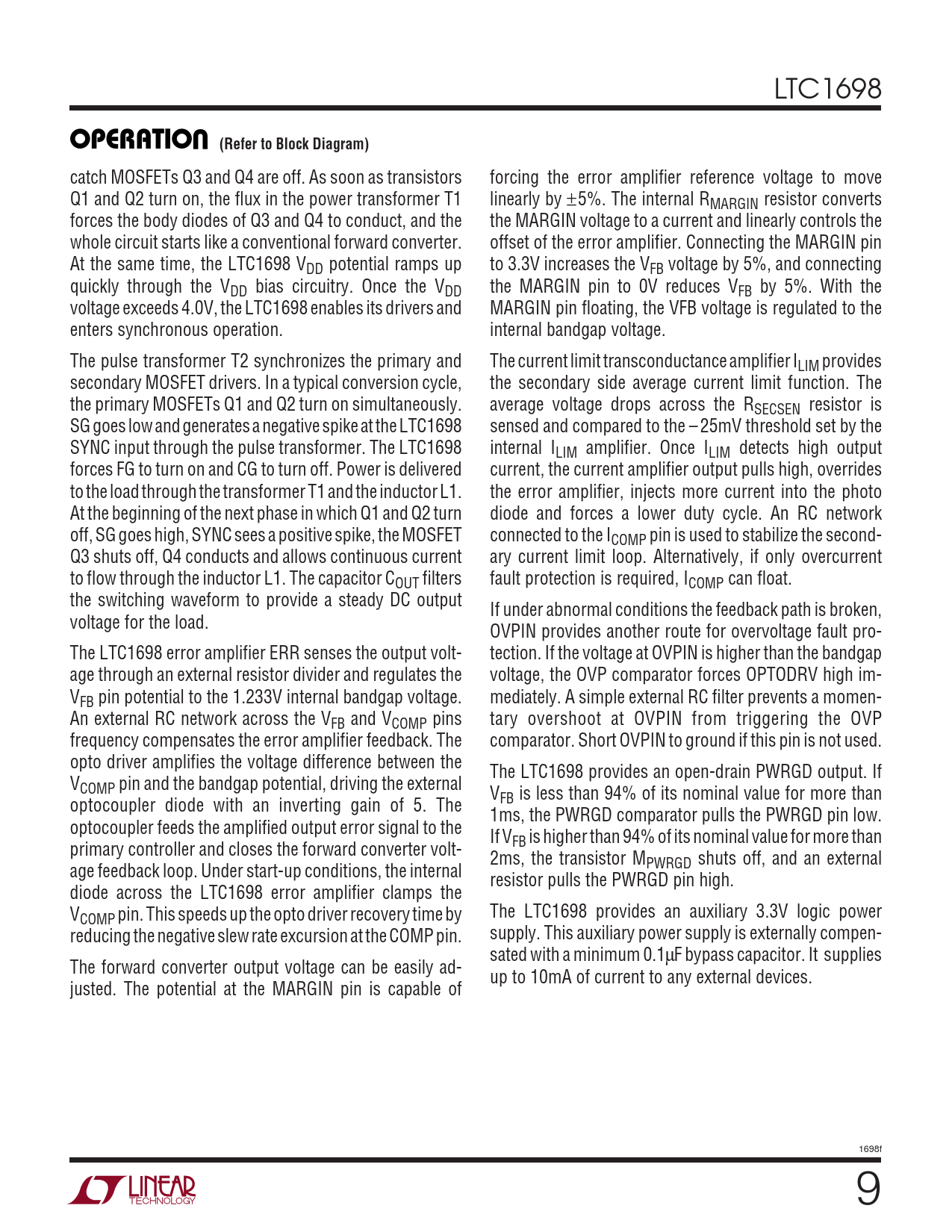 catch MOSFETs Q3 and Q4 are off. As soon as transistors forcing the error amplifier reference voltage to move Q1 and Q2 turn on, the flux in the power transformer T1 linearly by ±5%. The internal RMARGIN resistor converts forces the body diodes of Q3 and Q4 to conduct, and the the MARGIN voltage to a current and linearly controls the whole circuit starts like a conventional forward converter. offset of the error amplifier. Connecting the MARGIN pin At the same time, the LTC1698 VDD potential ramps up to 3.3V increases the VFB voltage by 5%, and connecting quickly through the VDD bias circuitry. Once the VDD the MARGIN pin to 0V reduces VFB by 5%. With the voltage exceeds 4.0V, the LTC1698 enables its drivers and MARGIN pin floating, the VFB voltage is regulated to the enters synchronous operation. internal bandgap voltage. The pulse transformer T2 synchronizes the primary and The current limit transconductance amplifier ILIM provides secondary MOSFET drivers. In a typical conversion cycle, the secondary side average current limit function. The the primary MOSFETs Q1 and Q2 turn on simultaneously. average voltage drops across the RSECSEN resistor is SG goes low and generates a negative spike at the LTC1698 sensed and compared to the – 25mV threshold set by the SYNC input through the pulse transformer. The LTC1698 internal ILIM amplifier. Once ILIM detects high output forces FG to turn on and CG to turn off. Power is delivered current, the current amplifier output pulls high, overrides to the load through the transformer T1 and the inductor L1. the error amplifier, injects more current into the photo At the beginning of the next phase in which Q1 and Q2 turn diode and forces a lower duty cycle. An RC network off, SG goes high, SYNC sees a positive spike, the MOSFET connected to the ICOMP pin is used to stabilize the second- Q3 shuts off, Q4 conducts and allows continuous current ary current limit loop. Alternatively, if only overcurrent to flow through the inductor L1. The capacitor COUT filters fault protection is required, ICOMP can float. the switching waveform to provide a steady DC output If under abnormal conditions the feedback path is broken, voltage for the load. OVPIN provides another route for overvoltage fault pro- The LTC1698 error amplifier ERR senses the output volt- tection. If the voltage at OVPIN is higher than the bandgap age through an external resistor divider and regulates the voltage, the OVP comparator forces OPTODRV high im- VFB pin potential to the 1.233V internal bandgap voltage. mediately. A simple external RC filter prevents a momen- An external RC network across the VFB and VCOMP pins tary overshoot at OVPIN from triggering the OVP frequency compensates the error amplifier feedback. The comparator. Short OVPIN to ground if this pin is not used. opto driver amplifies the voltage difference between the The LTC1698 provides an open-drain PWRGD output. If VCOMP pin and the bandgap potential, driving the external V optocoupler diode with an inverting gain of 5. The FB is less than 94% of its nominal value for more than 1ms, the PWRGD comparator pulls the PWRGD pin low. optocoupler feeds the amplified output error signal to the If V primary controller and closes the forward converter volt- FB is higher than 94% of its nominal value for more than 2ms, the transistor M age feedback loop. Under start-up conditions, the internal PWRGD shuts off, and an external resistor pulls the PWRGD pin high. diode across the LTC1698 error amplifier clamps the V The LTC1698 provides an auxiliary 3.3V logic power COMP pin. This speeds up the opto driver recovery time by reducing the negative slew rate excursion at the COMP pin. supply. This auxiliary power supply is externally compen- sated with a minimum 0.1µF bypass capacitor. It supplies The forward converter output voltage can be easily ad- up to 10mA of current to any external devices. justed. The potential at the MARGIN pin is capable of 1698f 9