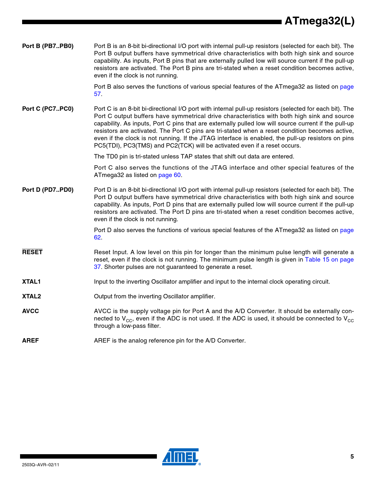 link to page 57 link to page 57 link to page 60 link to page 62 link to page 62 link to page 37 link to page 37 ATmega32(L)Port B (PB7..PB0) Port B is an 8-bit bi-directional I/O port with internal pull-up resistors (selected for each bit). The Port B output buffers have symmetrical drive characteristics with both high sink and source capability. As inputs, Port B pins that are externally pulled low will source current if the pull-up resistors are activated. The Port B pins are tri-stated when a reset condition becomes active, even if the clock is not running. Port B also serves the functions of various special features of the ATmega32 as listed on page 57. Port C (PC7..PC0) Port C is an 8-bit bi-directional I/O port with internal pull-up resistors (selected for each bit). The Port C output buffers have symmetrical drive characteristics with both high sink and source capability. As inputs, Port C pins that are externally pulled low will source current if the pull-up resistors are activated. The Port C pins are tri-stated when a reset condition becomes active, even if the clock is not running. If the JTAG interface is enabled, the pull-up resistors on pins PC5(TDI), PC3(TMS) and PC2(TCK) will be activated even if a reset occurs. The TD0 pin is tri-stated unless TAP states that shift out data are entered. Port C also serves the functions of the JTAG interface and other special features of the ATmega32 as listed on page 60. Port D (PD7..PD0) Port D is an 8-bit bi-directional I/O port with internal pull-up resistors (selected for each bit). The Port D output buffers have symmetrical drive characteristics with both high sink and source capability. As inputs, Port D pins that are externally pulled low will source current if the pull-up resistors are activated. The Port D pins are tri-stated when a reset condition becomes active, even if the clock is not running. Port D also serves the functions of various special features of the ATmega32 as listed on page 62. RESET Reset Input. A low level on this pin for longer than the minimum pulse length will generate a reset, even if the clock is not running. The minimum pulse length is given in Table 15 on page 37. Shorter pulses are not guaranteed to generate a reset. XTAL1 Input to the inverting Oscillator amplifier and input to the internal clock operating circuit. XTAL2 Output from the inverting Oscillator amplifier. AVCC AVCC is the supply voltage pin for Port A and the A/D Converter. It should be externally con- nected to V , even if the ADC is not used. If the ADC is used, it should be connected to V CC CC through a low-pass filter. AREF AREF is the analog reference pin for the A/D Converter. 5 2503Q–AVR–02/11 Document Outline Features Pin Configurations Overview Block Diagram Pin Descriptions VCC GND Port A (PA7..PA0) Port B (PB7..PB0) Port C (PC7..PC0) Port D (PD7..PD0) RESET XTAL1 XTAL2 AVCC AREF Resources Data Retention About Code Examples AVR CPU Core Introduction Architectural Overview ALU – Arithmetic Logic Unit Status Register General Purpose Register File The X-register, Y- register and Z-register Stack Pointer Instruction Execution Timing Reset and Interrupt Handling Interrupt Response Time ATmega32 Memories In-System Reprogrammable Flash Program Memory SRAM Data Memory Data Memory Access Times EEPROM Data Memory EEPROM Read/Write Access The EEPROM Address Register – EEARH and EEARL The EEPROM Data Register – EEDR The EEPROM Control Register – EECR EEPROM Write During Power-down Sleep Mode Preventing EEPROM Corruption I/O Memory System Clock and Clock Options Clock Systems and their Distribution CPU Clock – clkCPU I/O Clock – clkI/O Flash Clock – clkFLASH Asynchronous Timer Clock – clkASY ADC Clock – clkADC Clock Sources Default Clock Source Crystal Oscillator Low-frequency Crystal Oscillator External RC Oscillator Calibrated Internal RC Oscillator Oscillator Calibration Register – OSCCAL External Clock Timer/Counter Oscillator Power Management and Sleep Modes MCU Control Register – MCUCR Idle Mode ADC Noise Reduction Mode Power-down Mode Power-save Mode Standby Mode Extended Standby Mode Minimizing Power Consumption Analog to Digital Converter Analog Comparator Brown-out Detector Internal Voltage Reference Watchdog Timer Port Pins JTAG Interface and On-chip Debug System System Control and Reset Resetting the AVR Reset Sources Power-on Reset External Reset Brown-out Detection Watchdog Reset MCU Control and Status Register – MCUCSR Internal Voltage Reference Voltage Reference Enable Signals and Start-up Time Watchdog Timer Watchdog Timer Control Register – WDTCR Interrupts Interrupt Vectors in ATmega32 Moving Interrupts Between Application and Boot Space General Interrupt Control Register – GICR I/O Ports Introduction Ports as General Digital I/O Configuring the Pin Reading the Pin Value Digital Input Enable and Sleep Modes Unconnected pins Alternate Port Functions Special Function I/O Register – SFIOR Alternate Functions of Port A Alternate Functions of Port B Alternate Functions of Port C Alternate Functions of Port D Register Description for I/O Ports Port A Data Register – PORTA Port A Data Direction Register – DDRA Port A Input Pins Address – PINA Port B Data Register – PORTB Port B Data Direction Register – DDRB Port B Input Pins Address – PINB Port C Data Register – PORTC Port C Data Direction Register – DDRC Port C Input Pins Address – PINC Port D Data Register – PORTD Port D Data Direction Register – DDRD Port D Input Pins Address – PIND External Interrupts MCU Control Register – MCUCR MCU Control and Status Register – MCUCSR General Interrupt Control Register – GICR General Interrupt Flag Register – GIFR 8-bit Timer/Counter0 with PWM Overview Registers Definitions Timer/Counter Clock Sources Counter Unit Output Compare Unit Force Output Compare Compare Match Blocking by TCNT0 Write Using the Output Compare Unit Compare Match Output Unit Compare Output Mode and Wav