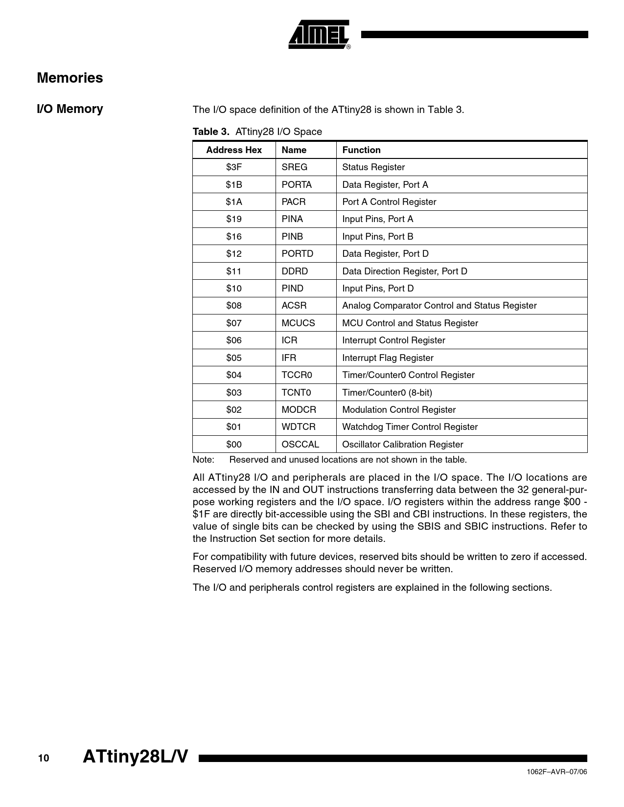 MemoriesI/O Memory The I/O space definition of the ATtiny28 is shown in Table 3. Table 3. ATtiny28 I/O Space Address HexNameFunction $3F SREG Status Register $1B PORTA Data Register, Port A $1A PACR Port A Control Register $19 PINA Input Pins, Port A $16 PINB Input Pins, Port B $12 PORTD Data Register, Port D $11 DDRD Data Direction Register, Port D $10 PIND Input Pins, Port D $08 ACSR Analog Comparator Control and Status Register $07 MCUCS MCU Control and Status Register $06 ICR Interrupt Control Register $05 IFR Interrupt Flag Register $04 TCCR0 Timer/Counter0 Control Register $03 TCNT0 Timer/Counter0 (8-bit) $02 MODCR Modulation Control Register $01 WDTCR Watchdog Timer Control Register $00 OSCCAL Oscillator Calibration Register Note: Reserved and unused locations are not shown in the table. All ATtiny28 I/O and peripherals are placed in the I/O space. The I/O locations are accessed by the IN and OUT instructions transferring data between the 32 general-pur- pose working registers and the I/O space. I/O registers within the address range $00 - $1F are directly bit-accessible using the SBI and CBI instructions. In these registers, the value of single bits can be checked by using the SBIS and SBIC instructions. Refer to the Instruction Set section for more details. For compatibility with future devices, reserved bits should be written to zero if accessed. Reserved I/O memory addresses should never be written. The I/O and peripherals control registers are explained in the following sections. 10ATtiny28L/V 1062F–AVR–07/06 Document Outline Features Pin Configurations Description Block Diagram Pin Descriptions VCC GND Port A (PA3..PA0) Port B (PB7..PB0) Port D (PD7..PD0) XTAL1 XTAL2 RESET Architectural Overview ALU - Arithmetic Logic Unit Subroutine and Interrupt Hardware Stack General-purpose Register File Status Register Status Register - SREG System Clock and Clock Options Internal RC Oscillator Calibrated Internal RC Oscillator Crystal Oscillator External Clock External RC Oscillator Register Description Oscillator Calibration Register - OSCCAL Memories I/O Memory Program and Data Addressing Modes Register Direct, Single Register Rd Register Indirect Register Direct, Two Registers Rd and Rr I/O Direct Relative Program Addressing, RJMP and RCALL Constant Addressing Using the LPM Instruction Memory Access and Instruction Execution Timing Flash Program Memory Sleep Modes Idle Mode Power-down Mode System Control and Reset Reset Sources Power-on Reset External Reset Watchdog Reset Register Description MCU Control and Status Register - MCUCS Interrupts Reset and Interrupt Interrupt Handling Interrupt Response Time External Interrupt Low-level Input Interrupt Register Description Interrupt Control Register - ICR Interrupt Flag Register - IFR I/O Ports Port A Port A as General Digital I/O Alternate Function of PA2 Port A Schematics Port B Port B as General Digital Input Alternate Functions of Port B Port B Schematics Port D Port D as General Digital I/O Register Description Port A Data Register - PORTA Port A Control Register - PACR Port A Input Pins Address - PINA Port B Input Pins Address - PINB Port D Data Register - PORTD Port D Data Direction Register - DDRD Port D Input Pins Address - PIND Timer/Counter0 Timer/Counter Prescaler Register Description Timer/Counter0 Control Register - TCCR0 Timer Counter 0 - TCNT0 Watchdog Timer Register Description Watchdog Timer Control Register - WDTCR Hardware Modulator Register Description Modulation Control Register - MODCR Analog Comparator Register Description Analog Comparator Control and Status Register - ACSR Memory Programming Program Memory Lock Bits Fuse Bits Signature Bytes Calibration Byte Programming the Flash Parallel Programming Signal Names Enter Programming Mode Chip Erase Programming the Flash Reading the Flash Programming the Fuse Bits Programming the Lock Bits Reading the Fuse and Lock Bits Reading the Signature Bytes and Calibration Byte Parallel Programming Characteristics Electrical Characteristics Absolute Maximum Ratings DC Characteristics External Clock Drive Waveforms External Clock Drive Typical Characteristics Register Summary Instruction Set Summary Ordering Information Packaging Information 32A 28P3 32M1-A Errata All revisions Datasheet Revision History Rev - 01/06G Rev - 01/06G Rev - 03/05F Table of Contents