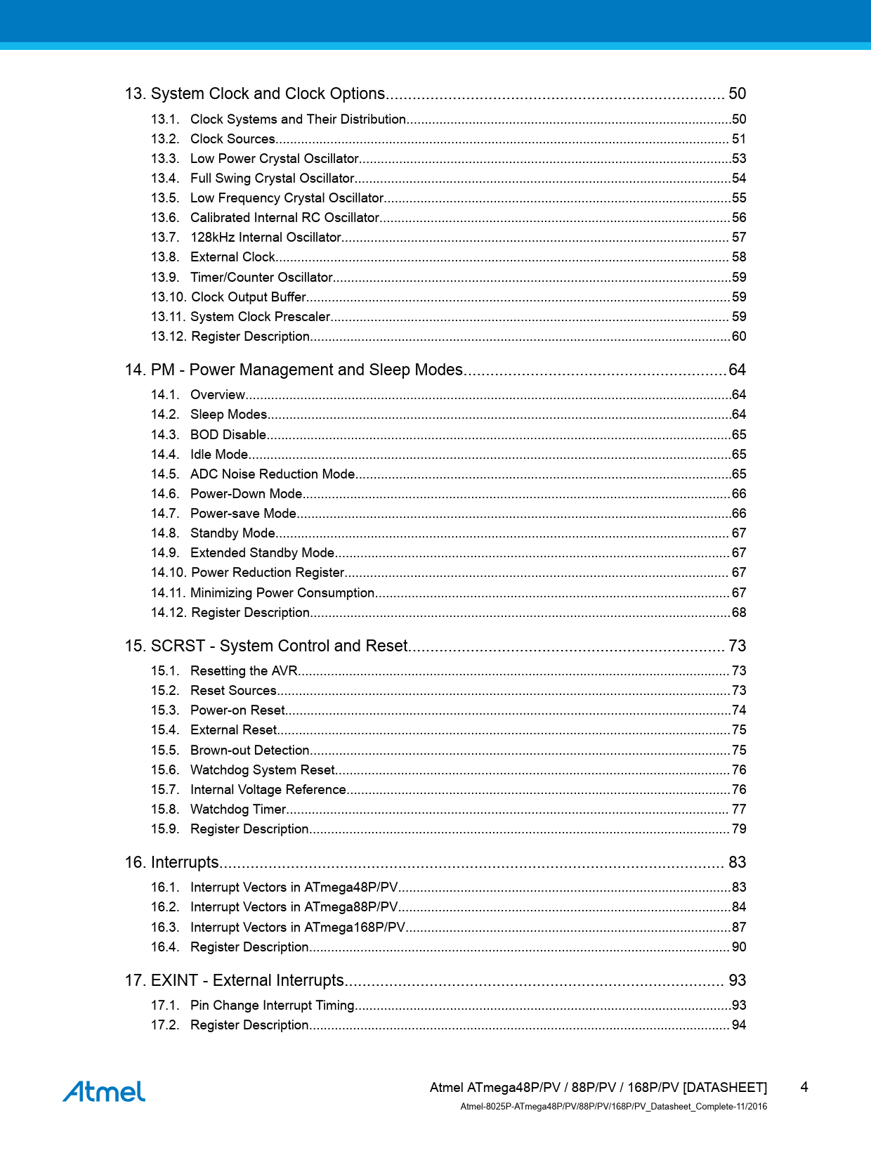 link to page 50 link to page 50 link to page 51 link to page 53 link to page 54 link to page 55 link to page 56 link to page 57 link to page 58 link to page 59 link to page 59 link to page 59 link to page 60 link to page 64 link to page 64 link to page 64 link to page 65 link to page 65 link to page 65 link to page 66 link to page 66 link to page 67 link to page 67 link to page 67 link to page 67 link to page 68 link to page 73 link to page 73 link to page 73 link to page 74 link to page 75 link to page 75 link to page 76 link to page 76 link to page 77 link to page 79 link to page 83 link to page 83 link to page 84 link to page 87 link to page 90 link to page 93 link to page 93 link to page 94 13. System Clock and Clock Options.. 50 13.1. Clock Systems and Their Distribution...50 13.2. Clock Sources.. 51 13.3. Low Power Crystal Oscillator..53 13.4. Full Swing Crystal Oscillator...54 13.5. Low Frequency Crystal Oscillator...55 13.6. Calibrated Internal RC Oscillator..56 13.7. 128kHz Internal Oscillator.. 57 13.8. External Clock.. 58 13.9. Timer/Counter Oscillator...59 13.10. Clock Output Buffer..59 13.11. System Clock Prescaler... 59 13.12. Register Description...60 14. PM - Power Management and Sleep Modes...64 14.1. Overview...64 14.2. Sleep Modes...64 14.3. BOD Disable...65 14.4. Idle Mode..65 14.5. ADC Noise Reduction Mode...65 14.6. Power-Down Mode...66 14.7. Power-save Mode...66 14.8. Standby Mode.. 67 14.9. Extended Standby Mode.. 67 14.10. Power Reduction Register... 67 14.11. Minimizing Power Consumption... 67 14.12. Register Description...68 15. SCRST - System Control and Reset... 73 15.1. Resetting the AVR.. 73 15.2. Reset Sources..73 15.3. Power-on Reset..74 15.4. External Reset..75 15.5. Brown-out Detection...75 15.6. Watchdog System Reset.. 76 15.7. Internal Voltage Reference...76 15.8. Watchdog Timer... 77 15.9. Register Description... 79 16. Interrupts... 83 16.1. Interrupt Vectors in ATmega48P/PV...83 16.2. Interrupt Vectors in ATmega88P/PV...84 16.3. Interrupt Vectors in ATmega168P/PV...87 16.4. Register Description... 90 17. EXINT - External Interrupts... 93 17.1. Pin Change Interrupt Timing...93 17.2. Register Description... 94 Atmel ATmega48P/PV / 88P/PV / 168P/PV [DATASHEET] 4 Atmel-8025P-ATmega48P/PV/88P/PV/168P/PV_Datasheet_Complete-11/2016 Document Outline Introduction Feature Table of Contents 1. Description 2. Configuration Summary 3. Ordering Information 3.1. ATmega48P/PV 3.2. ATmega88P/PV 3.3. ATmega168P/PV 4. Block Diagram 5. Pin Configurations 5.1. Pin-out 5.2. Pin Descriptions 5.2.1. VCC 5.2.2. GND 5.2.3. Port B (PB[7:0]) XTAL1/XTAL2/TOSC1/TOSC2 5.2.4. Port C (PC[5:0]) 5.2.5. PC6/RESET 5.2.6. Port D (PD[7:0]) 5.2.7. AVCC 5.2.8. AREF 5.2.9. ADC[7:6] (TQFP and VFQFN Package Only) 6. I/O Multiplexing 7. Resources 8. Data Retention 9. About Code Examples 10. Capacitive Touch Sensing 10.1. QTouch Library 11. AVR CPU Core 11.1. Overview 11.2. ALU – Arithmetic Logic Unit 11.3. Status Register 11.3.1. Status Register 11.4. General Purpose Register File 11.4.1. The X-register, Y-register, and Z-register 11.5. Stack Pointer 11.5.1. Stack Pointer Register High byte 11.5.2. Stack Pointer Register Low byte 11.6. Instruction Execution Timing 11.7. Reset and Interrupt Handling 11.7.1. Interrupt Response Time 12. AVR Memories 12.1. Overview 12.2. In-System Reprogrammable Flash Program Memory 12.3. SRAM Data Memory 12.3.1. Data Memory Access Times 12.4. EEPROM Data Memory 12.4.1. EEPROM Read/Write Access 12.4.2. Preventing EEPROM Corruption 12.5. I/O Memory 12.5.1. General Purpose I/O Registers 12.6. Register Description 12.6.1. EEPROM Address Register High 12.6.2. EEPROM Address Register Low 12.6.3. EEPROM Data Register 12.6.4. EEPROM Control Register 12.6.5. GPIOR2 – General Purpose I/O Register 2 12.6.6. GPIOR1 – General Purpose I/O Register 1 12.6.7. GPIOR0 – General Purpose I/O Register 0 13. System Clock and Clock Options 13.1. Clock Systems and Their Distribution 13.1.1. CPU Clock – clkCPU 13.1.2. I/O Clock – clkI/O 13.1.3. Flash Clock – clkFLASH 13.1.4. Asynchronous Timer Clock – clkASY 13.1.5. ADC Clock – clkADC 13.2. Clock Sources 13.2.1. Default Clock Source 13.2.2. Clock Startup Sequence 13.2.3. Clock Source Connections 13.3. Low Power Crystal Oscillator 13.4. Full Swing Crystal Oscillator 13.5. Low Frequency Crystal Oscillator 13.6. Calibrated Internal RC Oscillator 13.7. 128kHz Internal Oscillator 13.8. External Clock 13.9. Timer/Counter Oscillator 13.10. Clock Output Buffer 13.11. System Clock Prescaler 13.12. Register Description 13.12.1. Oscillator Calibration Register 13.12.2. Clock Prescaler Register 14. PM - Power Management and Sleep Modes 14.1. Overview 14.2. Sleep Modes 14.3. BOD Disable 14.4. Idle Mode 14.5. ADC Noise Reduction Mode 14.6. Power-Down Mode 14.7. Power-save Mode 14.8. Standby Mode 14.9. Extended Standby Mode 14.10. Power Reduction Register 14.11. Minimizing Power Consumption 14.11.1. Analog to Digital Converter 14.11.2. Analog Comparator 14.11.3. Brown-Out Detector 14.11.4. Internal Voltage Reference 14.11.5. Watchdog Timer 14.11.6. Port Pins 14.11.7. On-chip Debug System 14.12. Register Description 14.12.1. Sleep Mode Control Register 14.12.2. MCU Control Register 14.12.3. Power Reduction Register 15. SCRST - System Control and Reset 15.1. Resetting the AVR 15.2. Reset Sources 15.3. Power-on Reset 15.4. External Reset 15.5. Brown-out Detection 15.6. Watchdog System Reset 15.7. Internal Voltage Reference 15.7.1. Voltage Reference Enable Signals and Start-up Time 15.8. Watchdog Timer 15.8.1. Features 15.8.2. Overview 15.9. Register Description 15.9.1. MCU Status Register 15.9.2. WDTCSR – Watchdog Timer Control Register 16. Interrupts 16.1. Interrupt Vectors in ATmega48P/PV 16.2. Interrupt Vectors in ATmega88P/PV 16.3. Interrupt Vectors in ATmega168P/PV 16.4. Register Description 16.4.1. Moving Interrupts Between Application and Boot Space 16.4.2. MCU Control Register 17. EXINT - External Interrupts 17.1. Pin Change I