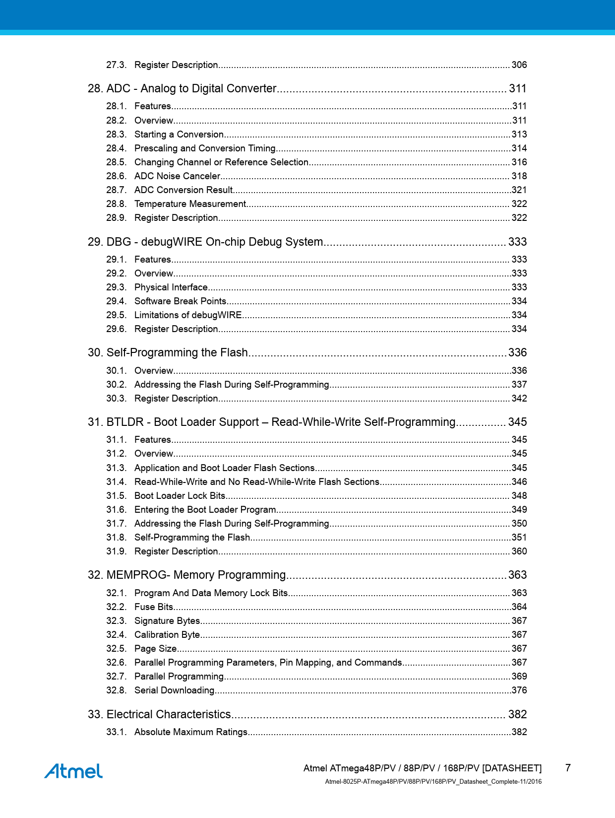 link to page 306 link to page 311 link to page 311 link to page 311 link to page 313 link to page 314 link to page 316 link to page 318 link to page 321 link to page 322 link to page 322 link to page 333 link to page 333 link to page 333 link to page 333 link to page 334 link to page 334 link to page 334 link to page 336 link to page 336 link to page 337 link to page 342 link to page 345 link to page 345 link to page 345 link to page 345 link to page 346 link to page 348 link to page 349 link to page 350 link to page 351 link to page 360 link to page 363 link to page 363 link to page 364 link to page 367 link to page 367 link to page 367 link to page 367 link to page 369 link to page 376 link to page 382 link to page 382 27.3. Register Description... 306 28. ADC - Analog to Digital Converter... 311 28.1. Features..311 28.2. Overview...311 28.3. Starting a Conversion...313 28.4. Prescaling and Conversion Timing...314 28.5. Changing Channel or Reference Selection.. 316 28.6. ADC Noise Canceler.. 318 28.7. ADC Conversion Result..321 28.8. Temperature Measurement.. 322 28.9. Register Description... 322 29. DBG - debugWIRE On-chip Debug System.. 333 29.1. Features... 333 29.2. Overview...333 29.3. Physical Interface... 333 29.4. Software Break Points..334 29.5. Limitations of debugWIRE..334 29.6. Register Description... 334 30. Self-Programming the Flash..336 30.1. Overview...336 30.2. Addressing the Flash During Self-Programming.. 337 30.3. Register Description... 342 31. BTLDR - Boot Loader Support – Read-While-Write Self-Programming.. 345 31.1. Features... 345 31.2. Overview...345 31.3. Application and Boot Loader Flash Sections..345 31.4. Read-While-Write and No Read-While-Write Flash Sections...346 31.5. Boot Loader Lock Bits.. 348 31.6. Entering the Boot Loader Program...349 31.7. Addressing the Flash During Self-Programming.. 350 31.8. Self-Programming the Flash...351 31.9. Register Description... 360 32. MEMPROG- Memory Programming..363 32.1. Program And Data Memory Lock Bits.. 363 32.2. Fuse Bits...364 32.3. Signature Bytes.. 367 32.4. Calibration Byte.. 367 32.5. Page Size... 367 32.6. Parallel Programming Parameters, Pin Mapping, and Commands..367 32.7. Parallel Programming...369 32.8. Serial Downloading...376 33. Electrical Characteristics... 382 33.1. Absolute Maximum Ratings..382 Atmel ATmega48P/PV / 88P/PV / 168P/PV [DATASHEET] 7 Atmel-8025P-ATmega48P/PV/88P/PV/168P/PV_Datasheet_Complete-11/2016 Document Outline Introduction Feature Table of Contents 1. Description 2. Configuration Summary 3. Ordering Information 3.1. ATmega48P/PV 3.2. ATmega88P/PV 3.3. ATmega168P/PV 4. Block Diagram 5. Pin Configurations 5.1. Pin-out 5.2. Pin Descriptions 5.2.1. VCC 5.2.2. GND 5.2.3. Port B (PB[7:0]) XTAL1/XTAL2/TOSC1/TOSC2 5.2.4. Port C (PC[5:0]) 5.2.5. PC6/RESET 5.2.6. Port D (PD[7:0]) 5.2.7. AVCC 5.2.8. AREF 5.2.9. ADC[7:6] (TQFP and VFQFN Package Only) 6. I/O Multiplexing 7. Resources 8. Data Retention 9. About Code Examples 10. Capacitive Touch Sensing 10.1. QTouch Library 11. AVR CPU Core 11.1. Overview 11.2. ALU – Arithmetic Logic Unit 11.3. Status Register 11.3.1. Status Register 11.4. General Purpose Register File 11.4.1. The X-register, Y-register, and Z-register 11.5. Stack Pointer 11.5.1. Stack Pointer Register High byte 11.5.2. Stack Pointer Register Low byte 11.6. Instruction Execution Timing 11.7. Reset and Interrupt Handling 11.7.1. Interrupt Response Time 12. AVR Memories 12.1. Overview 12.2. In-System Reprogrammable Flash Program Memory 12.3. SRAM Data Memory 12.3.1. Data Memory Access Times 12.4. EEPROM Data Memory 12.4.1. EEPROM Read/Write Access 12.4.2. Preventing EEPROM Corruption 12.5. I/O Memory 12.5.1. General Purpose I/O Registers 12.6. Register Description 12.6.1. EEPROM Address Register High 12.6.2. EEPROM Address Register Low 12.6.3. EEPROM Data Register 12.6.4. EEPROM Control Register 12.6.5. GPIOR2 – General Purpose I/O Register 2 12.6.6. GPIOR1 – General Purpose I/O Register 1 12.6.7. GPIOR0 – General Purpose I/O Register 0 13. System Clock and Clock Options 13.1. Clock Systems and Their Distribution 13.1.1. CPU Clock – clkCPU 13.1.2. I/O Clock – clkI/O 13.1.3. Flash Clock – clkFLASH 13.1.4. Asynchronous Timer Clock – clkASY 13.1.5. ADC Clock – clkADC 13.2. Clock Sources 13.2.1. Default Clock Source 13.2.2. Clock Startup Sequence 13.2.3. Clock Source Connections 13.3. Low Power Crystal Oscillator 13.4. Full Swing Crystal Oscillator 13.5. Low Frequency Crystal Oscillator 13.6. Calibrated Internal RC Oscillator 13.7. 128kHz Internal Oscillator 13.8. External Clock 13.9. Timer/Counter Oscillator 13.10. Clock Output Buffer 13.11. System Clock Prescaler 13.12. Register Description 13.12.1. Oscillator Calibration Register 13.12.2. Clock Prescaler Register 14. PM - Power Management and Sleep Modes 14.1. Overview 14.2. Sleep Modes 14.3. BOD Disable 14.4. Idle Mode 14.5. ADC Noise Reduction Mode 14.6. Power-Down Mode 14.7. Power-save Mode 14.8. Standby Mode 14.9. Extended Standby Mode 14.10. Power Reduction Register 14.11. Minimizing Power Consumption 14.11.1. Analog to Digital Converter 14.11.2. Analog Comparator 14.11.3. Brown-Out Detector 14.11.4. Internal Voltage Reference 14.11.5. Watchdog Timer 14.11.6. Port Pins 14.11.7. On-chip Debug System 14.12. Register Description 14.12.1. Sleep Mode Control Register 14.12.2. MCU Control Register 14.12.3. Power Reduction Register 15. SCRST - System Control and Reset 15.1. Resetting the AVR 15.2. Reset Sources 15.3. Power-on Reset 15.4. External Reset 15.5. Brown-out Detection 15.6. Watchdog System Reset 15.7. Internal Voltage Reference 15.7.1. Voltage Reference Enable Signals and Start-up Time 15.8. Watchdog Timer 15.8.1. Features 15.8.2. Overview 15.9. Register Description 15.9.1. MCU Status Register 15.9.2. WDTCSR – Watchdog Timer Control Register 16. Interrupts 16.1. Interrupt Vectors in ATmega48P/PV 16.2. Interrupt Vectors in ATmega88P/PV 16.3. Interrupt Vectors in ATmega168P/PV 16.4. Register Descri