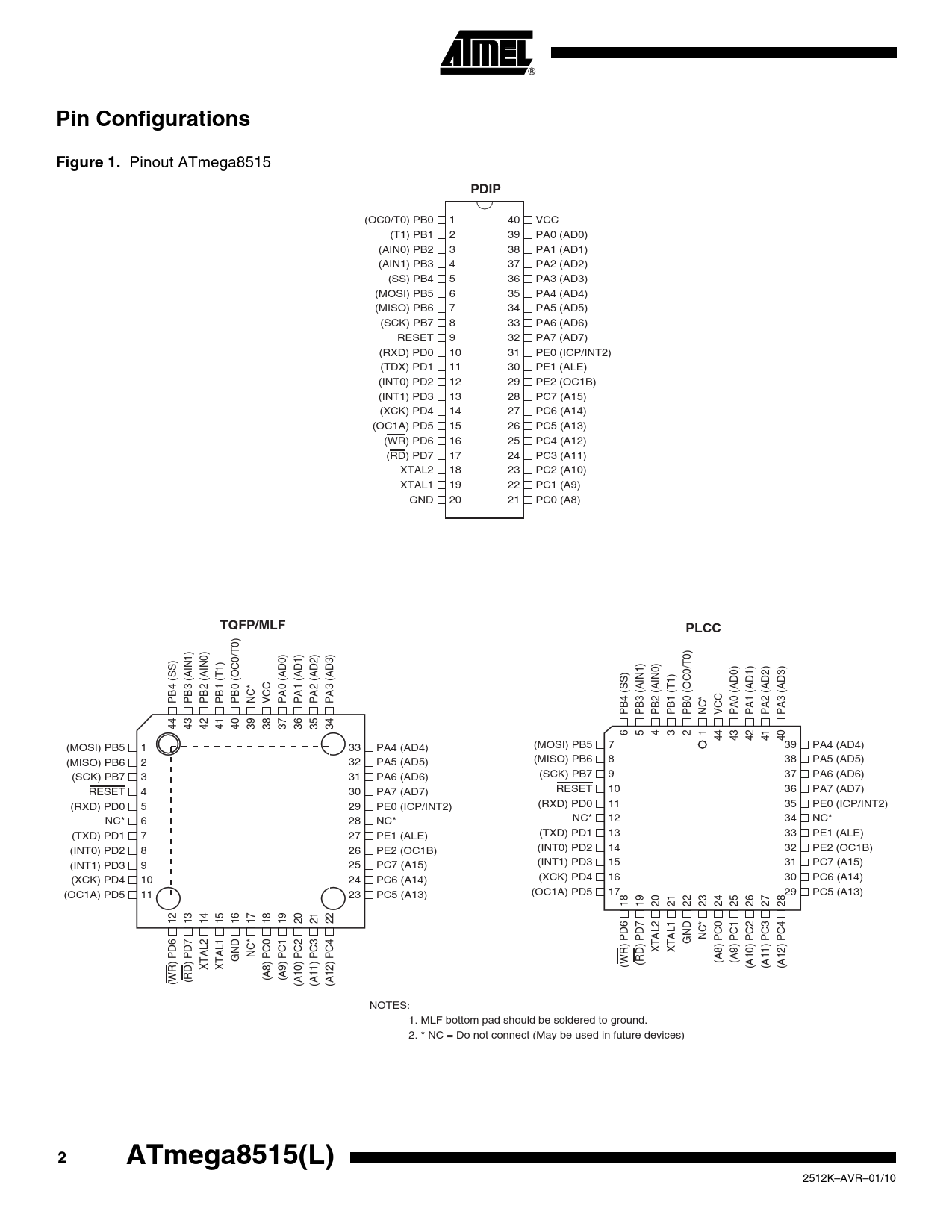 Pin Configurations. Figure 1. PDIP. TQFP/MLF. PLCC. ATmega8515(L)