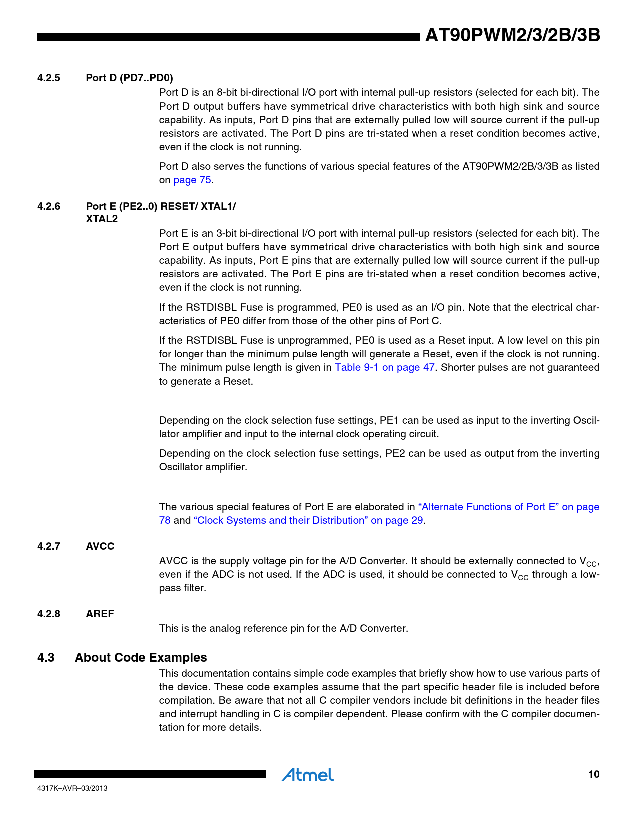 AT90PWM2/3/2B/3B 4.2.5 Port D (PD7..PD0) 4.2.6 Port E (PE2..0) RESET/ XTAL1/ XTAL2 4.2.7 AVCC 4.2.8 AREF 4.3 About Code Examples