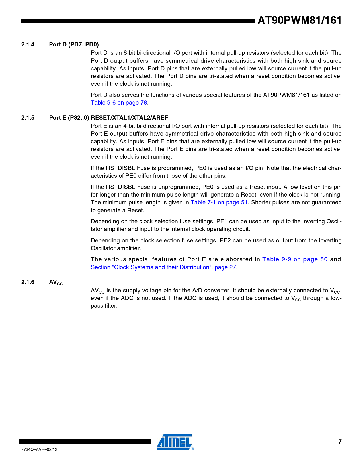 link to page 78 link to page 51 link to page 80 link to page 27 AT90PWM81/1612.1.4Port D (PD7..PD0) Port D is an 8-bit bi-directional I/O port with internal pull-up resistors (selected for each bit). The Port D output buffers have symmetrical drive characteristics with both high sink and source capability. As inputs, Port D pins that are externally pulled low will source current if the pull-up resistors are activated. The Port D pins are tri-stated when a reset condition becomes active, even if the clock is not running. Port D also serves the functions of various special features of the AT90PWM81/161 as listed on Table 9-6 on page 78. 2.1.5Port E (P32..0) RESET/XTAL1/XTAL2/AREF Port E is an 4-bit bi-directional I/O port with internal pull-up resistors (selected for each bit). The Port E output buffers have symmetrical drive characteristics with both high sink and source capability. As inputs, Port E pins that are externally pulled low will source current if the pull-up resistors are activated. The Port E pins are tri-stated when a reset condition becomes active, even if the clock is not running. If the RSTDISBL Fuse is programmed, PE0 is used as an I/O pin. Note that the electrical char- acteristics of PE0 differ from those of the other pins. If the RSTDISBL Fuse is unprogrammed, PE0 is used as a Reset input. A low level on this pin for longer than the minimum pulse length will generate a Reset, even if the clock is not running. The minimum pulse length is given in Table 7-1 on page 51. Shorter pulses are not guaranteed to generate a Reset. Depending on the clock selection fuse settings, PE1 can be used as input to the inverting Oscil- lator amplifier and input to the internal clock operating circuit. Depending on the clock selection fuse settings, PE2 can be used as output from the inverting Oscillator amplifier. The various special features of Port E are elaborated in Table 9-9 on page 80 and Section “Clock Systems and their Distribution”, page 27. 2.1.6AVCC AV is the supply voltage pin for the A/D converter. It should be externally connected to V , CC CC even if the ADC is not used. If the ADC is used, it should be connected to V through a low- CC pass filter. 7 7734Q–AVR–02/12 Document Outline Features 1. Products Configuration 2. Pin Configurations 2.1 Pin Descriptions 2.1.1 VCC 2.1.2 GND 2.1.3 Port B (PB7..PB0) 2.1.4 Port D (PD7..PD0) 2.1.5 Port E (P32..0) RESET/XTAL1/XTAL2/AREF 2.1.6 AVCC 3. AVR CPU Core 3.1 Introduction 3.2 Architectural Overview 3.3 ALU – Arithmetic Logic Unit 3.4 Status Register 3.5 General Purpose Register File 3.5.1 The X-register, Y-register, and Z-register 3.6 Stack Pointer 3.7 Instruction Execution Timing 3.8 Reset and Interrupt Handling 3.8.1 Interrupt Behavior 3.8.2 Interrupt Response Time 4. Memories 4.1 In-System Reprogrammable Flash Program Memory 4.2 SRAM Data Memory 4.2.1 SRAM Data Access Times 4.3 EEPROM Data Memory 4.3.1 EEPROM Read/Write Access 4.3.2 EEARH and EEARL - EEPROM Address Registers 4.3.3 EEDR - EEPROM Data Register 4.3.4 EECR - EEPROM Control Register 4.3.5 Program multiple bytes in one Atomic operation 4.4 Fuse Bits 4.4.1 Code examples 4.4.2 Preventing EEPROM Corruption 4.5 I/O Memory 4.6 General Purpose I/O Registers 4.6.1 GPIOR0 - General Purpose I/O Register 0 4.6.2 GPIOR1 - General Purpose I/O Register 1 4.6.3 GPIOR2 - General Purpose I/O Register 2 5. System Clock and Clock Options 5.1 Clock Systems and their Distribution 5.1.1 clkCPU - CPU Clock 5.1.2 clkI/O - I/O Clock 5.1.3 clkFLASH - Flash Clock 5.1.4 clkPLL - PLL Clock 5.1.5 clkADC - ADC Clock 5.2 Clock Sources 5.2.1 Default Clock Source 5.2.2 Calibrated Internal RC Oscillator 5.2.2.1 RC Oscillator calibration at Factory 5.2.3 128KHz Internal Oscillator 5.2.4 Crystal Oscillator 5.2.5 External Clock 5.2.6 PLL 5.2.7 Clock Output Buffer 5.3 Dynamic Clock Switch 5.3.1 Features 5.3.2 Fuses substitution 5.3.3 Clock Source Selection 5.3.4 Enable/Disable Clock Source 5.3.5 Clock Availability 5.3.6 Clock Switching 1. Calibrated internal RC oscillator 8.0MHz/1.0MHz, 2. Internal watchdog oscillator 128kHz, 3. External clock, 4. External Crystal/Ceramic Resonator, 5. PLL output divided by four. 5.4 System Clock Prescaler 5.4.1 Features 5.4.2 Switching Time 5.5 Register Description 5.5.1 OSCCAL – Oscillator Calibration Register 5.5.2 CLKPR – Clock Prescaler Register 5.5.3 PLLCSR - PLL Control and Status Register 5.5.4 MCUCR - MCU Control Register 5.5.5 CLKCSR – Clock Control & Status Register 5.5.6 CLKSELR - Clock Selection Register 6. Power Management and Sleep Modes 6.1 Sleep Modes 6.2 Idle Mode 6.3 ADC Noise Reduction Mode 6.4 Power-down Mode 6.5 Standby Mode 6.6 Power Reduction Register 6.7 Minimizing Power Consumption 6.7.1 Analog to Digital Converter 6.7.2 Analog Comparator 6.7.3 Brown-out Detector 6.7.4 Internal Voltage Reference 6.7.5 Watchdog Timer 6.7.6 Port Pins 6.7.7 On-chip Debug System 6.8 Register description 6.8.1 SMCR - Sleep Mode Control Register 6.8.2 PRR - Power Reduction Register 7. System Control and Reset 7.1 System Control overview 7.1.1 Resetting the AVR 7.1.2 Reset Sources 7.1.3 Power-on Reset 7.1.4 External Reset 7.1.5 Brown-out Detection 7.1.6 Watchdog Reset 7.2 System Control registers 7.2.1 MCUSR - MCU Status Register 7.2.2 MCUCR - MCU Control Register 7.3 Internal Voltage Reference 7.3.1 Bandgap and Internal Voltage Reference Enable Signals and Start-up Time 7.3.2 Voltage Reference Characteristics 7.4 Watchdog Timer 7.4.1 WDTCSR - Watchdog Timer Control Register 8. Interrupts 8.1 Interrupt Vectors in AT90PWM81/161 8.1.1 Moving Interrupts Between Application and Boot Space 8.1.2 MCUCR - MCU Control Register 9. I/O-Ports 9.1 Introduction 9.2 Ports as General Digital I/O 9.2.1 Configuring the Pin 9.2.2 Toggling the Pin 9.2.3 Switching Between Input and Output 9.2.4 Reading the Pin Value 9.2.5 Digital Input Enable and Sleep Modes 9.3 Alternate Port Functions 9.3.1 MCUCR - MCU Control Register 9.3.2 Alternate Functions of Port B 9.3.3 Alternate F