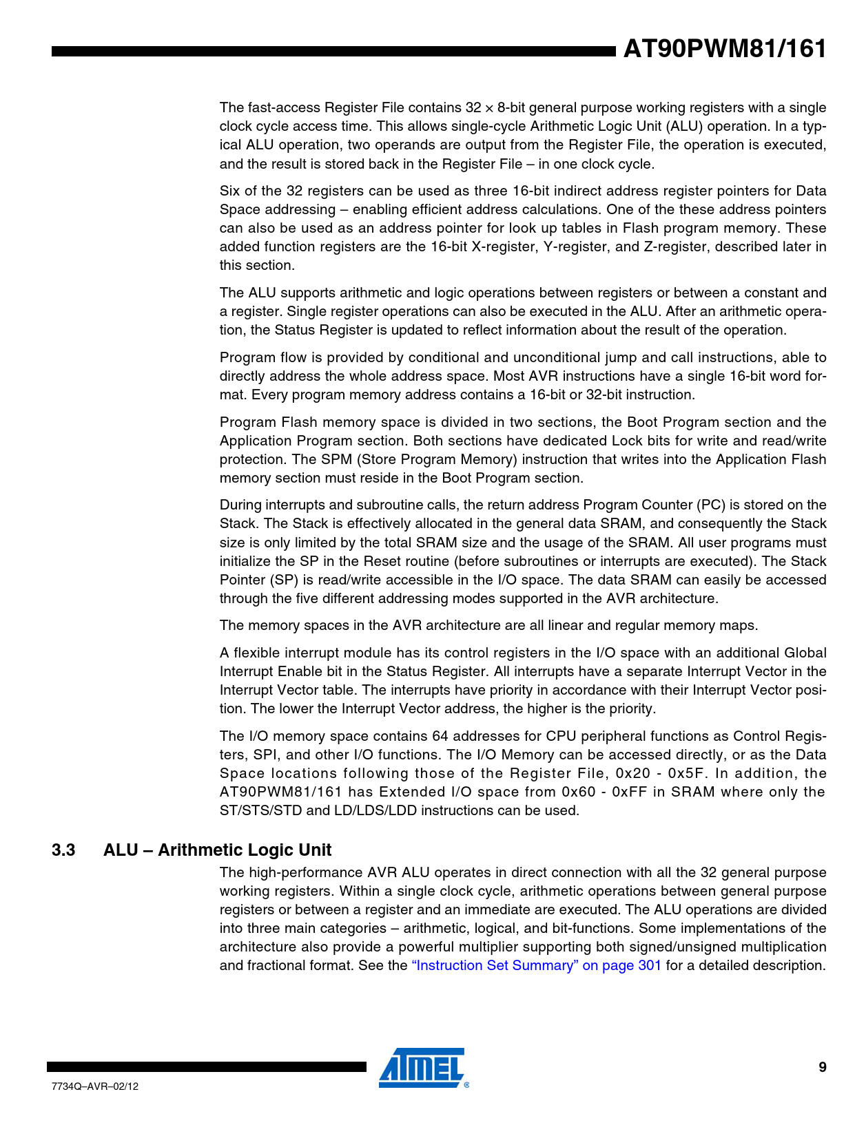 link to page 301 AT90PWM81/161 The fast-access Register File contains 32 × 8-bit general purpose working registers with a single clock cycle access time. This allows single-cycle Arithmetic Logic Unit (ALU) operation. In a typ- ical ALU operation, two operands are output from the Register File, the operation is executed, and the result is stored back in the Register File – in one clock cycle. Six of the 32 registers can be used as three 16-bit indirect address register pointers for Data Space addressing – enabling efficient address calculations. One of the these address pointers can also be used as an address pointer for look up tables in Flash program memory. These added function registers are the 16-bit X-register, Y-register, and Z-register, described later in this section. The ALU supports arithmetic and logic operations between registers or between a constant and a register. Single register operations can also be executed in the ALU. After an arithmetic opera- tion, the Status Register is updated to reflect information about the result of the operation. Program flow is provided by conditional and unconditional jump and call instructions, able to directly address the whole address space. Most AVR instructions have a single 16-bit word for- mat. Every program memory address contains a 16-bit or 32-bit instruction. Program Flash memory space is divided in two sections, the Boot Program section and the Application Program section. Both sections have dedicated Lock bits for write and read/write protection. The SPM (Store Program Memory) instruction that writes into the Application Flash memory section must reside in the Boot Program section. During interrupts and subroutine calls, the return address Program Counter (PC) is stored on the Stack. The Stack is effectively allocated in the general data SRAM, and consequently the Stack size is only limited by the total SRAM size and the usage of the SRAM. All user programs must initialize the SP in the Reset routine (before subroutines or interrupts are executed). The Stack Pointer (SP) is read/write accessible in the I/O space. The data SRAM can easily be accessed through the five different addressing modes supported in the AVR architecture. The memory spaces in the AVR architecture are all linear and regular memory maps. A flexible interrupt module has its control registers in the I/O space with an additional Global Interrupt Enable bit in the Status Register. All interrupts have a separate Interrupt Vector in the Interrupt Vector table. The interrupts have priority in accordance with their Interrupt Vector posi- tion. The lower the Interrupt Vector address, the higher is the priority. The I/O memory space contains 64 addresses for CPU peripheral functions as Control Regis- ters, SPI, and other I/O functions. The I/O Memory can be accessed directly, or as the Data Space locations following those of the Register File, 0x20 - 0x5F. In addition, the AT90PWM81/161 has Extended I/O space from 0x60 - 0xFF in SRAM where only the ST/STS/STD and LD/LDS/LDD instructions can be used. 3.3ALU – Arithmetic Logic Unit The high-performance AVR ALU operates in direct connection with all the 32 general purpose working registers. Within a single clock cycle, arithmetic operations between general purpose registers or between a register and an immediate are executed. The ALU operations are divided into three main categories – arithmetic, logical, and bit-functions. Some implementations of the architecture also provide a powerful multiplier supporting both signed/unsigned multiplication and fractional format. See the “Instruction Set Summary” on page 301 for a detailed description. 9 7734Q–AVR–02/12 Document Outline Features 1. Products Configuration 2. Pin Configurations 2.1 Pin Descriptions 2.1.1 VCC 2.1.2 GND 2.1.3 Port B (PB7..PB0) 2.1.4 Port D (PD7..PD0) 2.1.5 Port E (P32..0) RESET/XTAL1/XTAL2/AREF 2.1.6 AVCC 3. AVR CPU Core 3.1 Introduction 3.2 Architectural Overview 3.3 ALU – Arithmetic Logic Unit 3.4 Status Register 3.5 General Purpose Register File 3.5.1 The X-register, Y-register, and Z-register 3.6 Stack Pointer 3.7 Instruction Execution Timing 3.8 Reset and Interrupt Handling 3.8.1 Interrupt Behavior 3.8.2 Interrupt Response Time 4. Memories 4.1 In-System Reprogrammable Flash Program Memory 4.2 SRAM Data Memory 4.2.1 SRAM Data Access Times 4.3 EEPROM Data Memory 4.3.1 EEPROM Read/Write Access 4.3.2 EEARH and EEARL - EEPROM Address Registers 4.3.3 EEDR - EEPROM Data Register 4.3.4 EECR - EEPROM Control Register 4.3.5 Program multiple bytes in one Atomic operation 4.4 Fuse Bits 4.4.1 Code examples 4.4.2 Preventing EEPROM Corruption 4.5 I/O Memory 4.6 General Purpose I/O Registers 4.6.1 GPIOR0 - General Purpose I/O Register 0 4.6.2 GPIOR1 - General Purpose I/O Register 1 4.6.3 GPIOR2 - General Purpose I/O Register 2 5. System Clock and Clock Options 5.1 Clock Systems and their Distribution 5.1.1 clkCPU - CPU Clock 5.1.2 clkI/O - I/O Clock 5.1.3 clkFLASH - Flash Clock 5.1.4 clkPLL - PLL Clock 5.1.5 clkADC - ADC Clock 5.2 Clock Sources 5.2.1 Default Clock Source 5.2.2 Calibrated Internal RC Oscillator 5.2.2.1 RC Oscillator calibration at Factory 5.2.3 128KHz Internal Oscillator 5.2.4 Crystal Oscillator 5.2.5 External Clock 5.2.6 PLL 5.2.7 Clock Output Buffer 5.3 Dynamic Clock Switch 5.3.1 Features 5.3.2 Fuses substitution 5.3.3 Clock Source Selection 5.3.4 Enable/Disable Clock Source 5.3.5 Clock Availability 5.3.6 Clock Switching 1. Calibrated internal RC oscillator 8.0MHz/1.0MHz, 2. Internal watchdog oscillator 128kHz, 3. External clock, 4. External Crystal/Ceramic Resonator, 5. PLL output divided by four. 5.4 System Clock Prescaler 5.4.1 Features 5.4.2 Switching Time 5.5 Register Description 5.5.1 OSCCAL – Oscillator Calibration Register 5.5.2 CLKPR – Clock Prescaler Register 5.5.3 PLLCSR - PLL Control and Status Register 5.5.4 MCUCR - MCU Control Register 5.5.5 CLKCSR – Clock Control & Status Register 5.5.6 CLKSELR - Clock Selec