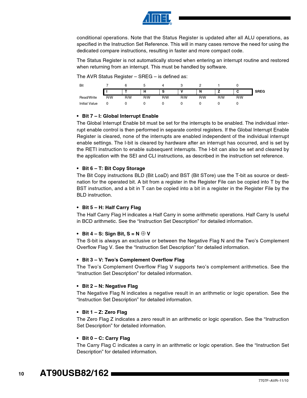conditional operations. Note that the Status Register is updated after all ALU operations, as specified in the Instruction Set Reference. This will in many cases remove the need for using the dedicated compare instructions, resulting in faster and more compact code. The Status Register is not automatically stored when entering an interrupt routine and restored when returning from an interrupt. This must be handled by software. The AVR Status Register – SREG – is defined as: Bit 7 6 5 4 3 2 1 0 ITHSVNZCSREG Read/Write R/W R/W R/W R/W R/W R/W R/W R/W Initial Value 0 0 0 0 0 0 0 0 • Bit 7 – I: Global Interrupt Enable The Global Interrupt Enable bit must be set for the interrupts to be enabled. The individual inter- rupt enable control is then performed in separate control registers. If the Global Interrupt Enable Register is cleared, none of the interrupts are enabled independent of the individual interrupt enable settings. The I-bit is cleared by hardware after an interrupt has occurred, and is set by the RETI instruction to enable subsequent interrupts. The I-bit can also be set and cleared by the application with the SEI and CLI instructions, as described in the instruction set reference. • Bit 6 – T: Bit Copy Storage The Bit Copy instructions BLD (Bit LoaD) and BST (Bit STore) use the T-bit as source or desti- nation for the operated bit. A bit from a register in the Register File can be copied into T by the BST instruction, and a bit in T can be copied into a bit in a register in the Register File by the BLD instruction. • Bit 5 – H: Half Carry Flag The Half Carry Flag H indicates a Half Carry in some arithmetic operations. Half Carry Is useful in BCD arithmetic. See the “Instruction Set Description” for detailed information. • Bit 4 – S: Sign Bit, S = N ⊕ V The S-bit is always an exclusive or between the Negative Flag N and the Two’s Complement Overflow Flag V. See the “Instruction Set Description” for detailed information. • Bit 3 – V: Two’s Complement Overflow Flag The Two’s Complement Overflow Flag V supports two’s complement arithmetics. See the “Instruction Set Description” for detailed information. • Bit 2 – N: Negative Flag The Negative Flag N indicates a negative result in an arithmetic or logic operation. See the “Instruction Set Description” for detailed information. • Bit 1 – Z: Zero Flag The Zero Flag Z indicates a zero result in an arithmetic or logic operation. See the “Instruction Set Description” for detailed information. • Bit 0 – C: Carry Flag The Carry Flag C indicates a carry in an arithmetic or logic operation. See the “Instruction Set Description” for detailed information. 10AT90USB82/162 7707F–AVR–11/10 Document Outline Features 1. Pin Configurations 2. Overview 2.1 Block Diagram 2.2 Pin Descriptions 3. About Code Examples 4. AVR CPU Core 4.1 Introduction 4.2 Architectural Overview 4.3 ALU – Arithmetic Logic Unit 4.4 Status Register 4.5 General Purpose Register File 4.6 Stack Pointer 4.7 Instruction Execution Timing 4.8 Reset and Interrupt Handling 5. AVR AT90USB82/162 Memories 5.1 In-System Reprogrammable Flash Program Memory 5.2 SRAM Data Memory 5.3 EEPROM Data Memory 5.4 I/O Memory 6. System Clock and Clock Options 6.1 Clock Systems and their Distribution 6.2 Clock Switch 6.3 Clock Sources 6.4 Low Power Crystal Oscillator 6.5 Calibrated Internal RC Oscillator 6.6 External Clock 6.7 Clock Output Buffer 6.8 System Clock Prescaler 6.9 PLL 7. Power Distribution 8. Power Management and Sleep Modes 8.1 Idle Mode 8.2 Power-down Mode 8.3 Power-save Mode 8.4 Standby Mode 8.5 Extended Standby Mode 8.6 Power Reduction Register 8.7 Minimizing Power Consumption 9. System Control and Reset 9.1 Resetting the AVR 9.2 Reset Sources 9.3 Power-on Reset 9.4 External Reset 9.5 Brown-out Detection 9.6 Watchdog Reset 9.7 USB Reset 9.8 Internal Voltage Reference 9.9 Watchdog Timer 10. Interrupts 10.1 Interrupt Vectors in AT90USB82/162 11. I/O-Ports 11.1 Introduction 11.2 Ports as General Digital I/O 11.3 Alternate Port Functions 11.4 Register Description for I/O-Ports 12. External Interrupts 13. Timer/Counter0 and Timer/Counter1 Prescalers 14. 8-bit Timer/Counter0 with PWM 14.1 Overview 14.2 Timer/Counter Clock Sources 14.3 Counter Unit 14.4 Output Compare Unit 14.5 Compare Match Output Unit 14.6 Modes of Operation 14.7 Timer/Counter Timing Diagrams 14.8 8-bit Timer/Counter Register Description 15. 16-bit Timer/Counter 1 with PWM 15.1 Overview 15.2 Accessing 16-bit Registers 15.3 Timer/Counter Clock Sources 15.4 Counter Unit 15.5 Input Capture Unit 15.6 Output Compare Units 15.7 Compare Match Output Unit 15.8 Modes of Operation 15.9 Timer/Counter Timing Diagrams 15.10 16-bit Timer/Counter Register Description 16. Serial Peripheral Interface – SPI 16.1 SS Pin Functionality 16.2 Data Modes 17. USART 17.1 Overview 17.2 Clock Generation 17.3 Frame Formats 17.4 USART Initialization 17.5 Data Transmission – The USART Transmitter 17.6 Data Reception – The USART Receiver 17.7 Asynchronous Data Reception 17.8 Multi-processor Communication Mode 17.9 Hardware Flow Control 17.10 USART Register Description 17.11 Examples of Baud Rate Setting 18. USART in SPI Mode 18.1 Overview 18.2 Clock Generation 18.3 SPI Data Modes and Timing 18.4 Frame Formats 18.5 Data Transfer 18.6 USART MSPIM Register Description 18.7 AVR USART MSPIM vs. AVR SPI 19. USB controller 19.1 Features 19.2 Block Diagram 19.3 Typical Application Implementation 19.4 General Operating Modes 19.5 Power modes 19.6 Memory management 19.7 PAD suspend 19.8 D+/D- Read/write 19.9 Registers description 19.10 USB Software Operating modes 20. USB Device Operating modes 20.1 Introduction 20.2 Power-on and reset 20.3 Endpoint reset 20.4 USB reset 20.5 Endpoint selection 20.6 Endpoint activation 20.7 Address Setup 20.8 Suspend, Wake-up and Resume 20.9 Detach 20.10 Remote Wake-up 20.11 STALL request 20.12 CONTROL endpoint management 20.13 OUT endpoint management 20