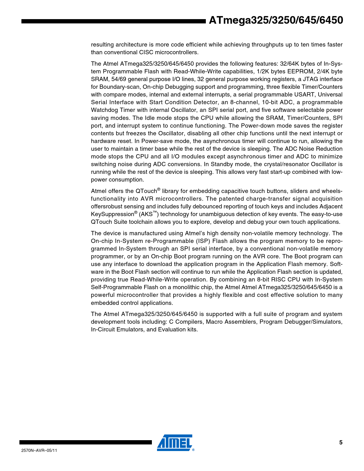 resulting architecture is more code efficient while achieving throughputs up to ten times faster than conventional CISC microcontrollers. The Atmel ATmega325/3250/645/6450 provides the following features: 32/64K bytes of In-Sys- tem Programmable Flash with Read-While-Write capabilities, 1/2K bytes EEPROM, 2/4K byte SRAM, 54/69 general purpose I/O lines, 32 general purpose working registers, a JTAG interface for Boundary-scan, On-chip Debugging support and programming, three flexible Timer/Counters with compare modes, internal and external interrupts, a serial programmable USART, Universal Serial Interface with Start Condition Detector, an 8-channel, 10-bit ADC, a programmable Watchdog Timer with internal Oscillator, an SPI serial port, and five software selectable power saving modes. The Idle mode stops the CPU while allowing the SRAM, Timer/Counters, SPI port, and interrupt system to continue functioning. The Power-down mode saves the register contents but freezes the Oscillator, disabling all other chip functions until the next interrupt or hardware reset. In Power-save mode, the asynchronous timer will continue to run, allowing the user to maintain a timer base while the rest of the device is sleeping. The ADC Noise Reduction mode stops the CPU and all I/O modules except asynchronous timer and ADC to minimize switching noise during ADC conversions. In Standby mode, the crystal/resonator Oscillator is running while the rest of the device is sleeping. This allows very fast start-up combined with low- power consumption. Atmel offers the QTouch® library for embedding capacitive touch buttons, sliders and wheels- functionality into AVR microcontrollers. The patented charge-transfer signal acquisition offersrobust sensing and includes fully debounced reporting of touch keys and includes Adjacent KeySuppression® (AKS™) technology for unambiguous detection of key events. The easy-to-use QTouch Suite toolchain allows you to explore, develop and debug your own touch applications. The device is manufactured using Atmel’s high density non-volatile memory technology. The On-chip In-System re-Programmable (ISP) Flash allows the program memory to be repro- grammed In-System through an SPI serial interface, by a conventional non-volatile memory programmer, or by an On-chip Boot program running on the AVR core. The Boot program can use any interface to download the application program in the Application Flash memory. Soft- ware in the Boot Flash section will continue to run while the Application Flash section is updated, providing true Read-While-Write operation. By combining an 8-bit RISC CPU with In-System Self-Programmable Flash on a monolithic chip, the Atmel Atmel ATmega325/3250/645/6450 is a powerful microcontroller that provides a highly flexible and cost effective solution to many embedded control applications. The Atmel ATmega325/3250/645/6450 is supported with a full suite of program and system development tools including: C Compilers, Macro Assemblers, Program Debugger/Simulators, In-Circuit Emulators, and Evaluation kits.