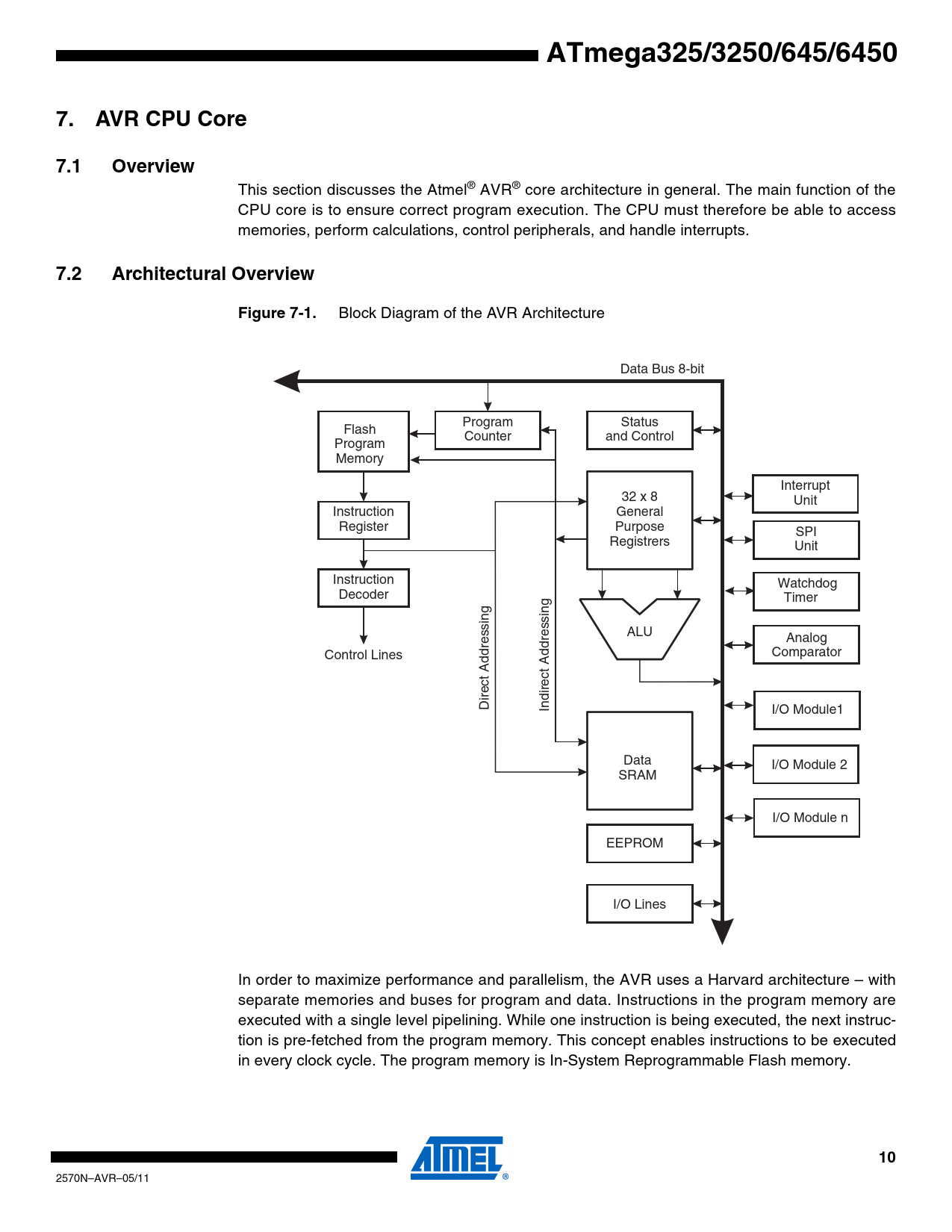 Seiten / Seite362 / 10 — ATmega325/3250/645/6450. AVR CPU Core. 7.1. Overview. 7.2. Architectural …