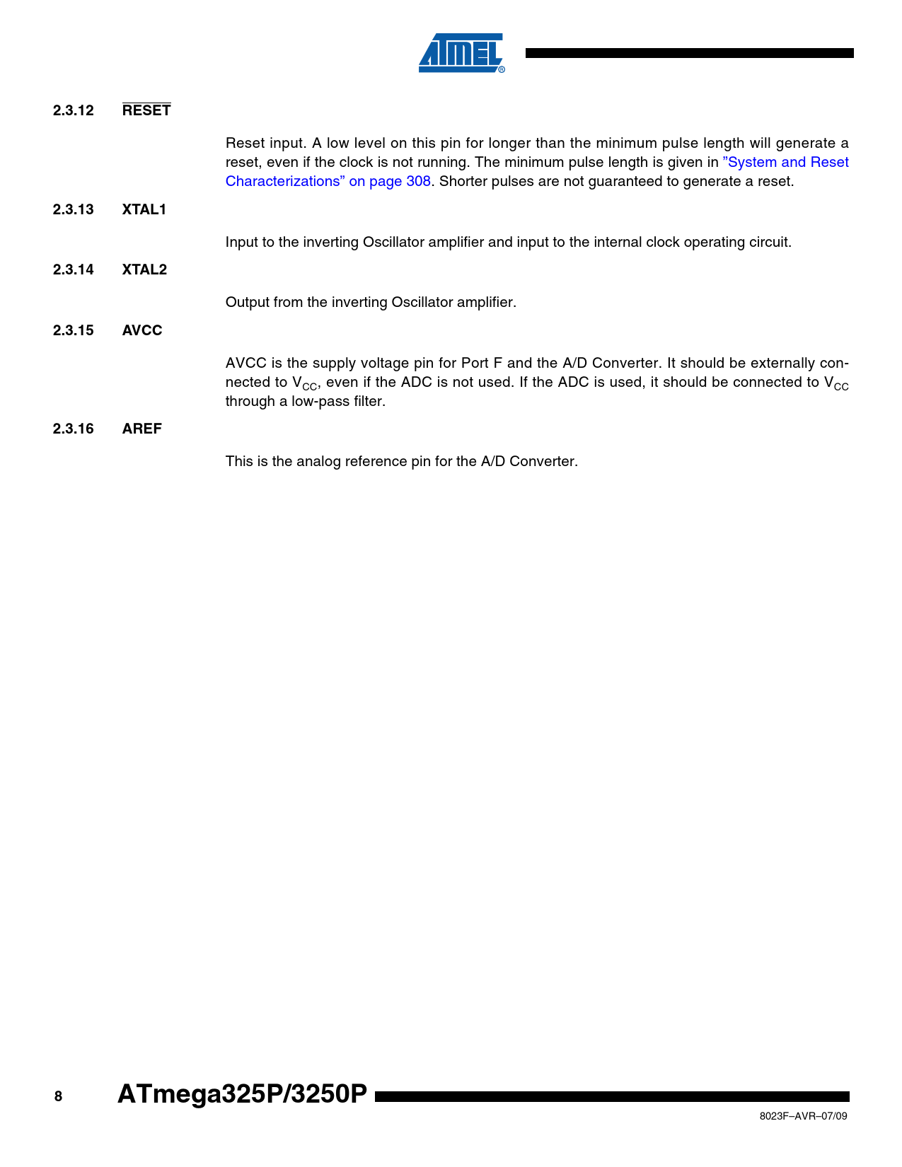 link to page 308 link to page 308 2.3.12RESET Reset input. A low level on this pin for longer than the minimum pulse length will generate a reset, even if the clock is not running. The minimum pulse length is given in ”System and Reset Characterizations” on page 308. Shorter pulses are not guaranteed to generate a reset. 2.3.13XTAL1 Input to the inverting Oscillator amplifier and input to the internal clock operating circuit. 2.3.14XTAL2 Output from the inverting Oscillator amplifier. 2.3.15AVCC AVCC is the supply voltage pin for Port F and the A/D Converter. It should be externally con- nected to V , even if the ADC is not used. If the ADC is used, it should be connected to V CC CC through a low-pass filter. 2.3.16AREF This is the analog reference pin for the A/D Converter. 8ATmega325P/3250P 8023F–AVR–07/09 Document Outline Features 1. Pin Configurations 1.1 Disclaimer 2. Overview 2.1 Block Diagram 2.2 Comparison between ATmega325P and ATmega3250P 2.3 Pin Descriptions 2.3.1 VCC 2.3.2 GND 2.3.3 Port A (PA7..PA0) 2.3.4 Port B (PB7..PB0) 2.3.5 Port C (PC7..PC0) 2.3.6 Port D (PD7..PD0) 2.3.7 Port E (PE7..PE0) 2.3.8 Port F (PF7..PF0) 2.3.9 Port G (PG5..PG0) 2.3.10 Port H (PH7..PH0) 2.3.11 Port J (PJ6..PJ0) 2.3.12 RESET 2.3.13 XTAL1 2.3.14 XTAL2 2.3.15 AVCC 2.3.16 AREF 3. Resources 4. Data Retention 5. About Code Examples 6. AVR CPU Core 6.1 Overview 6.2 Architectural Overview 6.3 ALU – Arithmetic Logic Unit 6.4 AVR Status Register 6.4.1 SREG – AVR Status Register 6.5 General Purpose Register File 6.5.1 The X-register, Y-register, and Z-register 6.6 Stack Pointer 6.6.1 SPH and SPL – Stack Pointer High and Stack Pointer Low 6.7 Instruction Execution Timing 6.8 Reset and Interrupt Handling 6.8.1 Interrupt Response Time 7. AVR Memories 7.1 Overview 7.2 In-System Reprogrammable Flash Program Memory 7.3 SRAM Data Memory 7.3.1 Data Memory Access Times 7.4 EEPROM Data Memory 7.4.1 EEPROM Read/Write Access 7.4.2 EEPROM Write During Power-down Sleep Mode 7.4.3 Preventing EEPROM Corruption 7.5 I/O Memory 7.6 Register Description 7.6.1 EEARH and EEARL – The EEPROM Address Register 7.6.2 EEDR – The EEPROM Data Register 7.6.3 EECR – The EEPROM Control Register 7.6.4 General Purpose I/O Registers 7.6.5 GPIOR2 – General Purpose I/O Register 2 7.6.6 GPIOR1 – General Purpose I/O Register 1 7.6.7 GPIOR0 – General Purpose I/O Register 0 8. System Clock and Clock Options 8.1 Clock Systems and their Distribution 8.1.1 CPU Clock – clkCPU 8.1.2 I/O Clock – clkI/O 8.1.3 Flash Clock – clkFLASH 8.1.4 Asynchronous Timer Clock – clkASY 8.1.5 ADC Clock – clkADC 8.2 Clock Sources 8.3 Default Clock Source 8.4 Crystal Oscillator 8.5 Low-frequency Crystal Oscillator 8.6 Calibrated Internal RC Oscillator 8.7 External Clock 8.8 Clock Output Buffer 8.9 Timer/Counter Oscillator 8.10 System Clock Prescaler 8.10.1 Switching Time 8.11 Register Description 8.11.1 OSCCAL – Oscillator Calibration Register 8.11.2 CLKPR – Clock Prescale Register 9. Power Management and Sleep Modes 9.1 Overview 9.2 Sleep Modes 9.3 BOD Disable 9.4 Idle Mode 9.5 ADC Noise Reduction Mode 9.6 Power-down Mode 9.7 Power-save Mode 9.8 Standby Mode 9.9 Power Reduction Register 9.10 Minimizing Power Consumption 9.10.1 Analog to Digital Converter 9.10.2 Analog Comparator 9.10.3 Brown-out Detector 9.10.4 Internal Voltage Reference 9.10.5 Watchdog Timer 9.10.6 Port Pins 9.10.7 JTAG Interface and On-chip Debug System 9.11 Register Description 9.11.1 SMCR – Sleep Mode Control Register 9.11.2 MCUCR – MCU Control Register 9.11.3 PRR – Power Reduction Register 10. System Control and Reset 10.1 Resetting the AVR 10.2 Reset Sources 10.2.1 Power-on Reset 10.2.2 External Reset 10.2.3 Brown-out Detection 10.2.4 Watchdog Reset 10.3 Internal Voltage Reference 10.3.1 Voltage Reference Enable Signals and Start-up Time 10.4 Watchdog Timer 10.4.1 Timed Sequences for Changing the Configuration of the Watchdog Timer 10.4.2 Safety Level 1 10.4.3 Safety Level 2 10.5 Register Description 10.5.1 MCUSR – MCU Status Register 10.5.2 WDTCR – Watchdog Timer Control Register 11. Interrupts 11.1 Overview 11.2 Interrupt Vectors 11.2.1 Moving Interrupts Between Application and Boot Space 11.3 Register Description 11.3.1 MCUCR – MCU Control Register 12. External Interrupts 12.1 Overview 12.2 Pin Change Interrupt Timing 12.3 Register Description 12.3.1 EICRA – External Interrupt Control Register A 12.3.2 EIMSK – External Interrupt Mask Register 12.3.3 EIFR – External Interrupt Flag Register 12.3.4 PCMSK3 – Pin Change Mask Register 3(1) 12.3.5 PCMSK2 – Pin Change Mask Register 2(1) 12.3.6 PCMSK1 – Pin Change Mask Register 1 12.3.7 PCMSK0 – Pin Change Mask Register 0 13. I/O-Ports 13.1 Overview 13.2 Ports as General Digital I/O 13.2.1 Configuring the Pin 13.2.2 Toggling the Pin 13.2.3 Switching Between Input and Output 13.2.4 Reading the Pin Value 13.2.5 Digital Input Enable and Sleep Modes 13.2.6 Unconnected Pins 13.3 Alternate Port Functions 13.3.1 Alternate Functions of Port B 13.3.2 Alternate Functions of Port D 13.3.3 Alternate Functions of Port E 13.3.4 Alternate Functions of Port F 13.3.5 Alternate Functions of Port G 13.3.6 Alternate Functions of Port H 13.3.7 Alternate Functions of Port J 13.4 Register Description 13.4.1 MCUCR – MCU Control Register 13.4.2 PORTA – Port A Data Register 13.4.3 DDRA – Port A Data Direction Register 13.4.4 PINA – Port A Input Pins Address 13.4.5 PORTB – Port B Data Register 13.4.6 DDRB – Port B Data Direction Register 13.4.7 PINB – Port B Input Pins Address 13.4.8 PORTC – Port C Data Register 13.4.9 DDRC – Port C Data Direction Register 13.4.10 PINC – Port C Input Pins Address 13.4.11 PORTD – Port D Data Register 13.4.12 DDRD – Port D Data Direction Register 13.4.13 PIND – Port D Input Pins Address 13.4.14 PORTE – Port E Data Register 13.4.15 DDRE – Port E Data Direction Register 13.4.16 PINE – Port E Input Pins Address 13.4.17 PORTF – Port F Data Register 13.4.18
