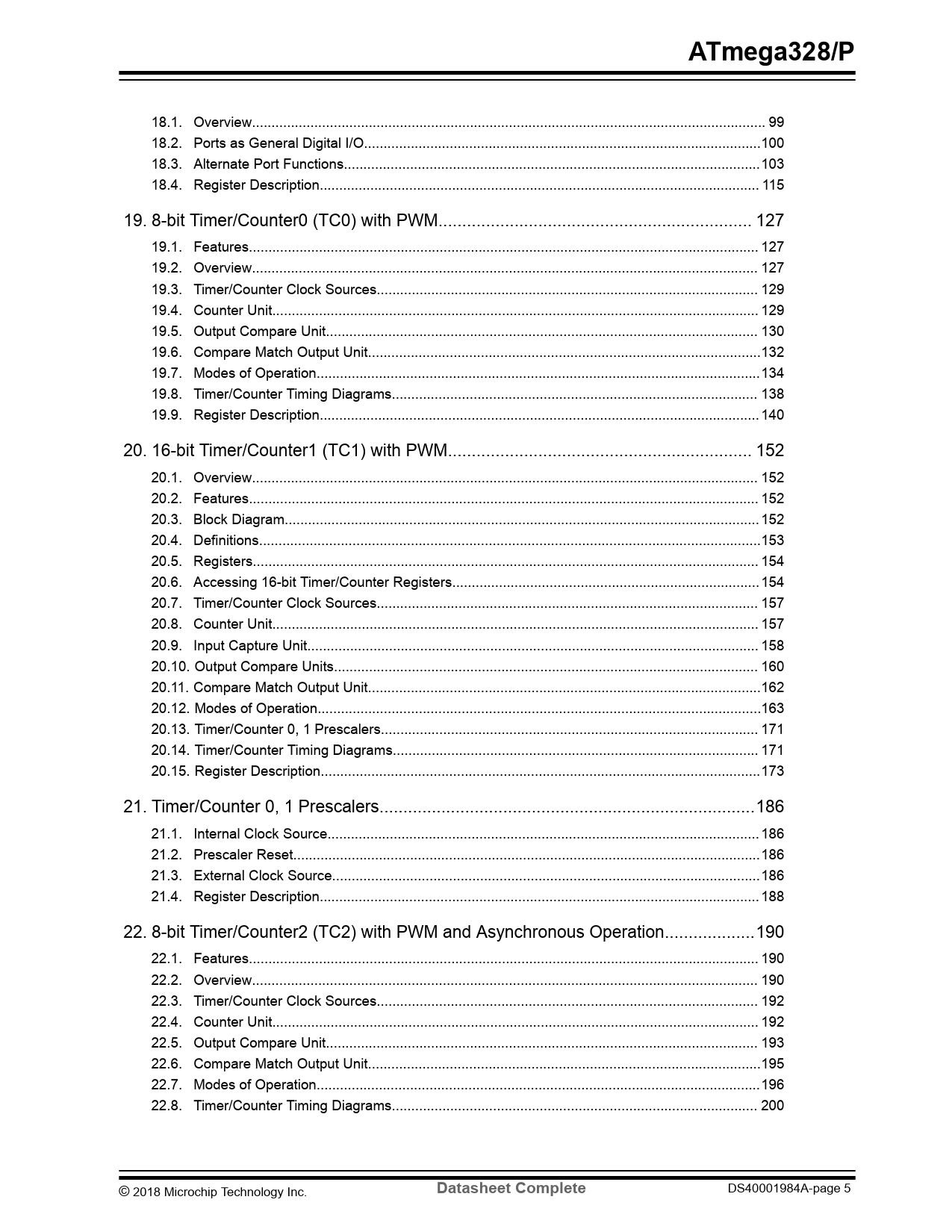 18.1. Overview.. 99 18.2. Ports as General Digital I/O..100 18.3. Alternate Port Functions...103 18.4. Register Description... 115 19. 8-bit Timer/Counter0 (TC0) with PWM.. 127 19.1. Features... 127 19.2. Overview.. 127 19.3. Timer/Counter Clock Sources.. 129 19.4. Counter Unit... 129 19.5. Output Compare Unit... 130 19.6. Compare Match Output Unit...132 19.7. Modes of Operation..134 19.8. Timer/Counter Timing Diagrams.. 138 19.9. Register Description... 140 20. 16-bit Timer/Counter1 (TC1) with PWM.. 152 20.1. Overview.. 152 20.2. Features... 152 20.3. Block Diagram.. 152 20.4. Definitions...153 20.5. Registers.. 154 20.6. Accessing 16-bit Timer/Counter Registers...154 20.7. Timer/Counter Clock Sources.. 157 20.8. Counter Unit... 157 20.9. Input Capture Unit.. 158 20.10. Output Compare Units... 160 20.11. Compare Match Output Unit...162 20.12. Modes of Operation..163 20.13. Timer/Counter 0, 1 Prescalers... 171 20.14. Timer/Counter Timing Diagrams.. 171 20.15. Register Description...173 21. Timer/Counter 0, 1 Prescalers...186 21.1. Internal Clock Source... 186 21.2. Prescaler Reset..186 21.3. External Clock Source..186 21.4. Register Description... 188 22. 8-bit Timer/Counter2 (TC2) with PWM and Asynchronous Operation...190 22.1. Features... 190 22.2. Overview.. 190 22.3. Timer/Counter Clock Sources.. 192 22.4. Counter Unit... 192 22.5. Output Compare Unit... 193 22.6. Compare Match Output Unit...195 22.7. Modes of Operation..196 22.8. Timer/Counter Timing Diagrams.. 200 © 2018 Microchip Technology Inc.