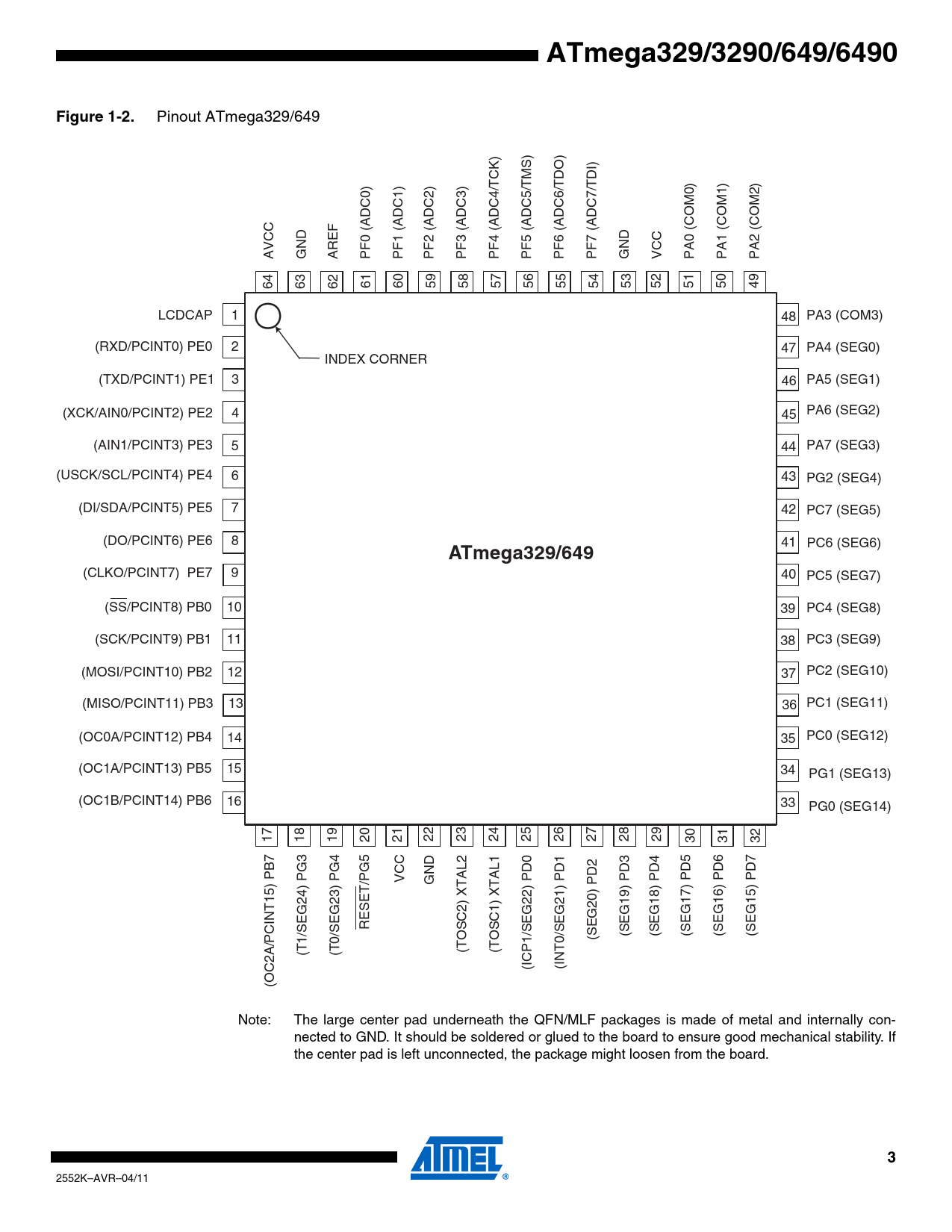 ATmega329/3290/649/6490Figure 1-2. Pinout ATmega329/649 CC V CC A GND AREF PF0 (ADC0) PF1 (ADC1) PF2 (ADC2) PF3 (ADC3) PF4 (ADC4/TCK) PF5 (ADC5/TMS) PF6 (ADC6/TDO) PF7 (ADC7/TDI) GND V PA0 (COM0) PA1 (COM1) PA2 (COM2) 64 63 62 61 60 59 58 57 56 55 54 53 52 51 50 49 LCDCAP 1 48 PA3 (COM3) (RXD/PCINT0) PE0 2 47 PA4 (SEG0) INDEX CORNER (TXD/PCINT1) PE1 3 46 PA5 (SEG1) (XCK/AIN0/PCINT2) PE2 PA6 (SEG2) 4 45 (AIN1/PCINT3) PE3 5 44 PA7 (SEG3) (USCK/SCL/PCINT4) PE4 6 43 PG2 (SEG4) (DI/SDA/PCINT5) PE5 7 42 PC7 (SEG5) (DO/PCINT6) PE6 8 41 PC6 (SEG6) ATmega329/649 (CLKO/PCINT7) PE7 9 40 PC5 (SEG7) (SS/PCINT8) PB0 10 39 PC4 (SEG8) (SCK/PCINT9) PB1 11 38 PC3 (SEG9) (MOSI/PCINT10) PB2 12 PC2 (SEG10) 37 (MISO/PCINT11) PB3 13 36 PC1 (SEG11) (OC0A/PCINT12) PB4 14 PC0 (SEG12) 35 (OC1A/PCINT13) PB5 15 34 PG1 (SEG13) (OC1B/PCINT14) PB6 16 33 PG0 (SEG14) 17 18 19 20 21 22 23 24 25 26 27 28 29 30 31 32 CC V GND RESET/PG5 (SEG19) PD3 (SEG18) PD4 (SEG17) PD5 (SEG16) PD6 (SEG15) PD7 (SEG20) PD2 (TOSC2) XTAL2 (TOSC1) XTAL1 (T1/SEG24) PG3 (T0/SEG23) PG4 (ICP1/SEG22) PD0 (INT0/SEG21) PD1 (OC2A/PCINT15) PB7 Note: The large center pad underneath the QFN/MLF packages is made of metal and internally con- nected to GND. It should be soldered or glued to the board to ensure good mechanical stability. If the center pad is left unconnected, the package might loosen from the board. 3 2552K–AVR–04/11 Document Outline Features 1. Pin Configurations 2. Overview 2.1 Block Diagram 2.2 Comparison between ATmega329, ATmega3290, ATmega649 and ATmega6490 2.3 Pin Descriptions 2.3.1 VCC 2.3.2 GND 2.3.3 Port A (PA7..PA0) 2.3.4 Port B (PB7..PB0) 2.3.5 Port C (PC7..PC0) 2.3.6 Port D (PD7..PD0) 2.3.7 Port E (PE7..PE0) 2.3.8 Port F (PF7..PF0) 2.3.9 Port G (PG5..PG0) 2.3.10 Port H (PH7..PH0) 2.3.11 Port J (PJ6..PJ0) 2.3.12 RESET 2.3.13 XTAL1 2.3.14 XTAL2 2.3.15 AVCC 2.3.16 AREF 2.3.17 LCDCAP 3. Resources 4. Data Retention 5. About Code Examples 6. AVR CPU Core 6.1 Overview 6.2 Architectural Overview 6.3 ALU – Arithmetic Logic Unit 6.4 AVR Status Register 6.4.1 SREG – AVR Status Register 6.5 General Purpose Register File 6.5.1 The X-register, Y-register, and Z-register 6.6 Stack Pointer 6.7 Instruction Execution Timing 6.8 Reset and Interrupt Handling 6.8.1 Interrupt Response Time 7. AVR ATmega329/3290/649/6490 Memories 7.1 In-System Reprogrammable Flash Program Memory 7.2 SRAM Data Memory 7.2.1 Data Memory Access Times 7.3 EEPROM Data Memory 7.3.1 EEPROM Read/Write Access 7.3.2 EEPROM Write During Power-down Sleep Mode 7.3.3 Preventing EEPROM Corruption 7.4 I/O Memory 7.4.1 General Purpose I/O Registers 7.5 Register Description 7.5.1 EEARH and EEARL – The EEPROM Address Register 7.5.2 EEDR – The EEPROM Data Register 7.5.3 EECR – The EEPROM Control Register 7.5.4 GPIOR2 – General Purpose I/O Register 2 7.5.5 GPIOR1 – General Purpose I/O Register 1 7.5.6 GPIOR0 – General Purpose I/O Register 0 8. System Clock and Clock Options 8.1 Clock Systems and their Distribution 8.1.1 CPU Clock – clkCPU 8.1.2 I/O Clock – clkI/O 8.1.3 Flash Clock – clkFLASH 8.1.4 Asynchronous Timer Clock – clkASY ADC Clock – clkADC 8.2 Clock Sources 8.2.1 Default Clock Source 8.3 Crystal Oscillator 8.4 Low-frequency Crystal Oscillator 8.5 Calibrated Internal RC Oscillator 8.6 External Clock 8.7 Clock Output Buffer 8.8 Timer/Counter Oscillator 8.9 System Clock Prescaler 8.9.1 Switching Time 8.10 Register Description 8.10.1 OSCCAL – Oscillator Calibration Register 8.10.2 CLKPR – Clock Prescale Register 9. Power Management and Sleep Modes 9.1 Idle Mode 9.2 ADC Noise Reduction Mode 9.3 Power-down Mode 9.4 Power-save Mode 9.5 Standby Mode 9.6 Power Reduction Register 9.7 Minimizing Power Consumption 9.7.1 Analog to Digital Converter 9.7.2 Analog Comparator 9.7.3 Brown-out Detector 9.7.4 Internal Voltage Reference 9.7.5 Watchdog Timer 9.7.6 Port Pins 9.7.7 JTAG Interface and On-chip Debug System 9.8 Register Description 9.8.1 SMCR – Sleep Mode Control Register 9.8.2 PRR – Power Reduction Register 10. System Control and Reset 10.1 Resetting the AVR 10.2 Reset Sources 10.3 Power-on Reset 10.4 External Reset 10.5 Brown-out Detection 10.6 Watchdog Reset 10.7 Internal Voltage Reference 10.7.1 Voltage Reference Enable Signals and Start-up Time 10.8 Watchdog Timer 10.9 Timed Sequences for Changing the Configuration of the Watchdog Timer 10.9.1 Safety Level 1 10.9.2 Safety Level 2 10.10 Register Description 10.10.1 MCUSR – MCU Status Register 10.10.2 WDTCR – Watchdog Timer Control Register 11. Interrupts 11.1 Interrupt Vectors in ATmega329/3290/649/6490 11.1.1 Moving Interrupts Between Application and Boot Space 11.2 Register Description 11.2.1 MCUCR – MCU Control Register 12. External Interrupts 12.1 Pin Change Interrupt Timing 12.2 Register Description 12.2.1 EICRA – External Interrupt Control Register A 12.2.2 External Interrupt Mask Register – EIMSK 12.2.3 EIFR – External Interrupt Flag Register 12.2.4 PCMSK3 – Pin Change Mask Register 3(1) 12.2.5 PCMSK2 – Pin Change Mask Register 2(1) 12.2.6 PCMSK1 – Pin Change Mask Register 1 12.2.7 PCMSK0 – Pin Change Mask Register 0 13. I/O-Ports 13.1 Introduction 13.2 Ports as General Digital I/O 13.2.1 Configuring the Pin 13.2.2 Toggling the Pin 13.2.3 Switching Between Input and Output 13.2.4 Reading the Pin Value 13.2.5 Digital Input Enable and Sleep Modes 13.2.6 Unconnected Pins 13.3 Alternate Port Functions 13.3.1 Alternate Functions of Port A 13.3.2 Alternate Functions of Port B 13.3.3 Alternate Functions of Port C 13.3.4 Alternate Functions of Port D 13.3.5 Alternate Functions of Port E 13.3.6 Alternate Functions of Port F 13.3.7 Alternate Functions of Port G 13.3.8 Alternate Functions of Port H 13.3.9 Alternate Functions of Port J 13.4 Register Description 13.4.1 MCUCR – MCU Control Register 13.4.2 PORTA – Port A Data Register 13.4.3 DDRA – Port A Data Direction Register 13.4.4 PINA – Port A Input Pins Address 13.4.5 PORTB – Port B Data Register 13.4.6 DDRB – Port B 