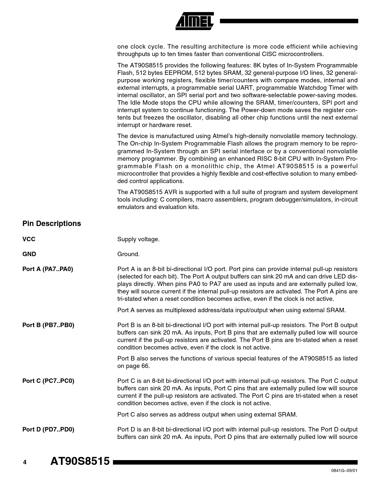 memory programmer. By combining an enhanced RISC 8-bit CPU with In-System Programmable Flash on a monolithic chip, the Atmel AT90S8515 is a powerful