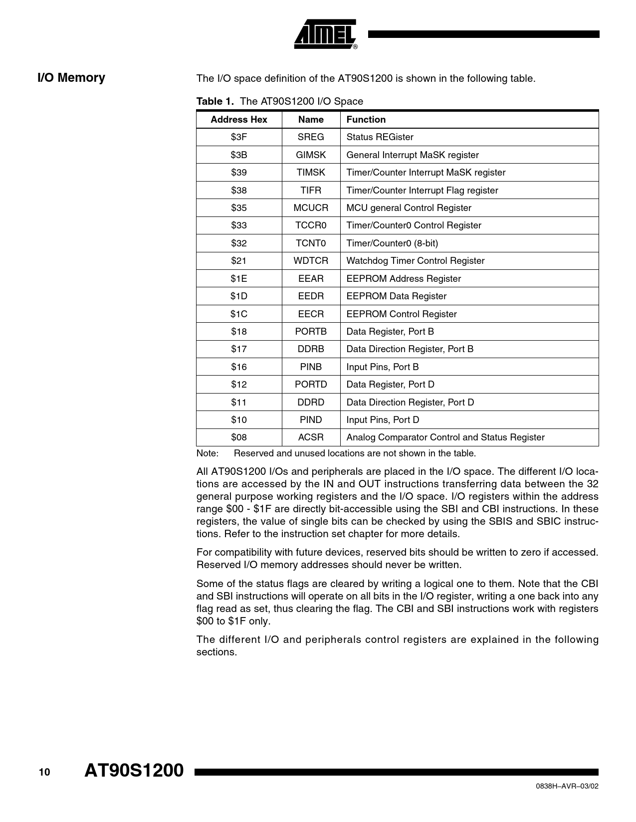 I/O Memory The I/O space definition of the AT90S1200 is shown in the following table. Table 1. The AT90S1200 I/O Space Address HexNameFunction $3F SREG Status REGister $3B GIMSK General Interrupt MaSK register $39 TIMSK Timer/Counter Interrupt MaSK register $38 TIFR Timer/Counter Interrupt Flag register $35 MCUCR MCU general Control Register $33 TCCR0 Timer/Counter0 Control Register $32 TCNT0 Timer/Counter0 (8-bit) $21 WDTCR Watchdog Timer Control Register $1E EEAR EEPROM Address Register $1D EEDR EEPROM Data Register $1C EECR EEPROM Control Register $18 PORTB Data Register, Port B $17 DDRB Data Direction Register, Port B $16 PINB Input Pins, Port B $12 PORTD Data Register, Port D $11 DDRD Data Direction Register, Port D $10 PIND Input Pins, Port D $08 ACSR Analog Comparator Control and Status Register Note: Reserved and unused locations are not shown in the table. All AT90S1200 I/Os and peripherals are placed in the I/O space. The different I/O loca- tions are accessed by the IN and OUT instructions transferring data between the 32 general purpose working registers and the I/O space. I/O registers within the address range $00 - $1F are directly bit-accessible using the SBI and CBI instructions. In these registers, the value of single bits can be checked by using the SBIS and SBIC instruc- tions. Refer to the instruction set chapter for more details. For compatibility with future devices, reserved bits should be written to zero if accessed. Reserved I/O memory addresses should never be written. Some of the status flags are cleared by writing a logical one to them. Note that the CBI and SBI instructions will operate on all bits in the I/O register, writing a one back into any flag read as set, thus clearing the flag. The CBI and SBI instructions work with registers $00 to $1F only. The different I/O and peripherals control registers are explained in the following sections. 10AT90S1200 0838H–AVR–03/02 Document Outline Features Pin Configuration Description Block Diagram Pin Descriptions VCC GND Port B (PB7..PB0) Port D (PD6..PD0) RESET XTAL1 XTAL2 Crystal Oscillator On-chip RC Oscillator Architectural Overview General Purpose Register File ALU – Arithmetic Logic Unit In-System Programmable Flash Program Memory Program and Data Addressing Modes Register Direct, Single Register Rd Register Indirect Register Direct, Two Registers Rd and Rr I/O Direct Relative Program Addressing, RJMP and RCALL Subroutine and Interrupt Hardware Stack EEPROM Data Memory Instruction Execution Timing I/O Memory Status Register – SREG Reset and Interrupt Handling Reset Sources Power-on Reset External Reset Watchdog Reset Interrupt Handling General Interrupt Mask Register – GIMSK Timer/Counter Interrupt Mask Register – TIMSK Timer/Counter Interrupt FLAG Register – TIFR External Interrupts Interrupt Response Time MCU Control Register – MCUCR Sleep Modes Idle Mode Power-down Mode Timer/Counter0 Timer/Counter0 Prescaler Timer/Counter0 Control Register – TCCR0 Timer/Counter0 – TCNT0 Watchdog Timer Watchdog Timer Control Register – WDTCR EEPROM Read/Write Access EEPROM Address Register – EEAR EEPROM Data Register – EEDR EEPROM Control Register – EECR Prevent EEPROM Corruption Analog Comparator Analog Comparator Control and Status Register – ACSR I/O Ports Port B Port B Data Register – PORTB Port B Data Direction Register – DDRB Port B Input Pin Address – PINB Port B as General Digital I/O Alternate Functions of Port B Port B Schematics Port D Port D Data Register – PORTD Port D Data Direction Register – DDRD Port D Input Pins Address – PIND Port D as General Digital I/O Alternate Functions for Port D Port D Schematics Memory Programming Program and Data Memory Lock Bits Fuse Bits Signature Bytes Programming the Flash and EEPROM Parallel Programming Signal Names Enter Programming Mode Chip Erase Programming the Flash Reading the Flash Programming the EEPROM Reading the EEPROM Programming the Fuse Bits Programming the Lock Bits Reading the Fuse and Lock Bits Reading the Signature Bytes Parallel Programming Characteristics Serial Downloading Serial Programming Algorithm Data Polling EEPROM Data Polling Flash Serial Programming Characteristics Electrical Characteristics Absolute Maximum Ratings* DC Characteristics External Clock Drive Waveforms External Clock Drive Typical Characteristics AT90S1200 Register Summary Instruction Set Summary Ordering Information(1) Packaging Information 20P3 20S 20Y Table of Contents