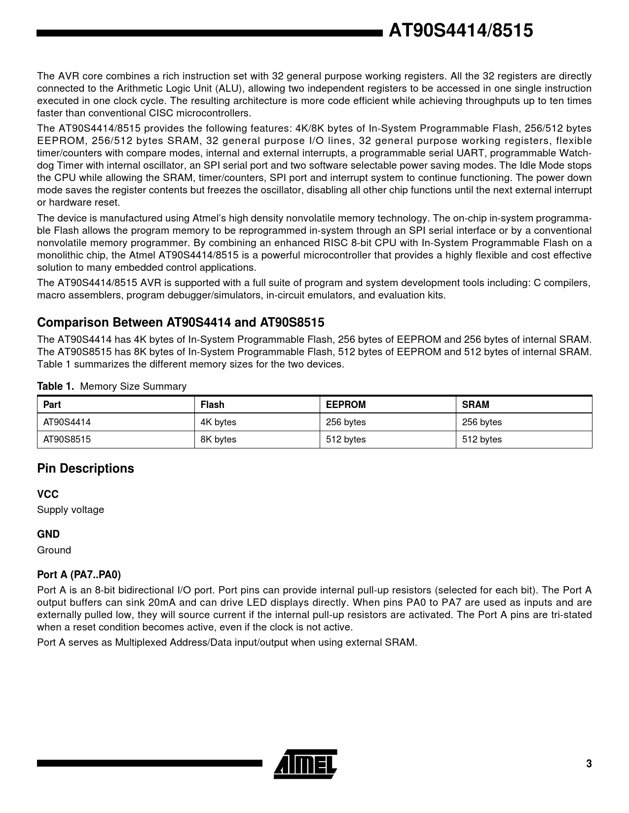 AT90S4414/8515. Comparison Between AT90S4414 and AT90S8515. Table 1. Part. Flash. EEPROM. SRAM. Pin Descriptions. VCC. GND