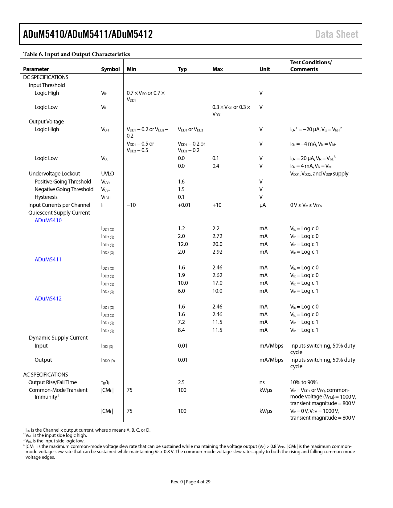 ADuM5410/ADuM5411/ADuM5412Data SheetTable 6. Input and Output CharacteristicsTest Conditions/ParameterSymbol MinTypMaxUnitComments DC SPECIFICATIONS Input Threshold Logic High VIH 0.7 × VISO or 0.7 × V VDD1 Logic Low VIL 0.3 × VISO or 0.3 × V VDD1 Output Voltage Logic High V 1 2 OH VDD1 − 0.2 or VDD2 − VDD1 or VDD2 V IOx = −20 µA, VIx = VIxH 0.2 VDD1 − 0.5 or VDD1 − 0.2 or V IOx = −4 mA, VIx = VIxH VDD2 − 0.5 VDD2 − 0.2 Logic Low V 3 OL 0.0 0.1 V IOx = 20 µA, VIx = VIxL 0.0 0.4 V IOx = 4 mA, VIx = VIxL Undervoltage Lockout UVLO VDD1, VDD2, and VDDP supply Positive Going Threshold VUV+ 1.6 V Negative Going Threshold VUV− 1.5 V Hysteresis VUVH 0.1 V Input Currents per Channel II −10 +0.01 +10 µA 0 V ≤ VIx ≤ VDDx Quiescent Supply Current ADuM5410 IDD1 (Q) 1.2 2.2 mA VIx = Logic 0 IDD2 (Q) 2.0 2.72 mA VIx = Logic 0 IDD1 (Q) 12.0 20.0 mA VIx = Logic 1 IDD2 (Q) 2.0 2.92 mA VIx = Logic 1 ADuM5411 IDD1 (Q) 1.6 2.46 mA VIx = Logic 0 IDD2 (Q) 1.9 2.62 mA VIx = Logic 0 IDD1 (Q) 10.0 17.0 mA VIx = Logic 1 IDD2 (Q) 6.0 10.0 mA VIx = Logic 1 ADuM5412 IDD1 (Q) 1.6 2.46 mA VIx = Logic 0 IDD2 (Q) 1.6 2.46 mA VIx = Logic 0 IDD1 (Q) 7.2 11.5 mA VIx = Logic 1 IDD2 (Q) 8.4 11.5 mA VIx = Logic 1 Dynamic Supply Current Input IDDI (D) 0.01 mA/Mbps Inputs switching, 50% duty cycle Output IDDO (D) 0.01 mA/Mbps Inputs switching, 50% duty cycle AC SPECIFICATIONS Output Rise/Fall Time tR/tF 2.5 ns 10% to 90% Common-Mode Transient |CMH| 75 100 kV/µs VIx = VDD1 or VISO, common- Immunity4 mode voltage (VCM) = 1000 V, transient magnitude = 800 V |CML| 75 100 kV/µs VIx = 0 V, VCM = 1000 V, transient magnitude = 800 V 1 IOx is the Channel x output current, where x means A, B, C, or D. 2 VIxH is the input side logic high. 3 VIxL is the input side logic low. 4 |CMH| is the maximum common-mode voltage slew rate that can be sustained while maintaining the voltage output (VO) > 0.8 VDDx. |CML| is the maximum common- mode voltage slew rate that can be sustained while maintaining VO > 0.8 V. The common-mode voltage slew rates apply to both the rising and falling common-mode voltage edges. Rev. 0 | Page 4 of 29 Document Outline FEATURES APPLICATIONS GENERAL DESCRIPTION FUNCTIONAL BLOCK DIGRAM REVISION HISTORY SPECIFICATIONS ELECTRICAL CHARACTERISTICS—5 V PRIMARY INPUT SUPPLY/5 V SECONDARY ISOLATED SUPPLY ELECTRICAL CHARACTERISTICS—3.3 V PRIMARY INPUT SUPPLY/3.3 V SECONDARY ISOLATED SUPPLY ELECTRICAL CHARACTERISTICS—5 V PRIMARY INPUT SUPPLY/3.3 V SECONDARY ISOLATED SUPPLY ELECTRICAL CHARACTERISTICS—2.5 V OPERATION DIGITAL ISOLATOR CHANNELS ONLY ELECTRICAL CHARACTERISTICS—1.8 V OPERATION DIGITAL ISOLATOR CHANNELS ONLY PACKAGE CHARACTERISTICS REGULATORY APPROVALS INSULATION AND SAFETY RELATED SPECIFICATIONS DIN V VDE V 0884-10 (VDE V 0884-10) INSULATION CHARACTERISTICS RECOMMENDED OPERATING CONDITIONS ABSOLUTE MAXIMUM RATINGS ESD CAUTION PIN CONFIGURATIONS AND FUNCTION DESCRIPTIONS TRUTH TABLES TYPICAL PERFORMANCE CHARACTERISTICS TERMINOLOGY THEORY OF OPERATION APPLICATIONS INFORMATION PCB LAYOUT THERMAL ANALYSIS PROPAGATION DELAY RELATED PARAMETERS EMI CONSIDERATIONS POWER CONSUMPTION INSULATION LIFETIME Surface Tracking Insulation Wear Out Calculation and Use of Parameters Example OUTLINE DIMENSIONS ORDERING GUIDE